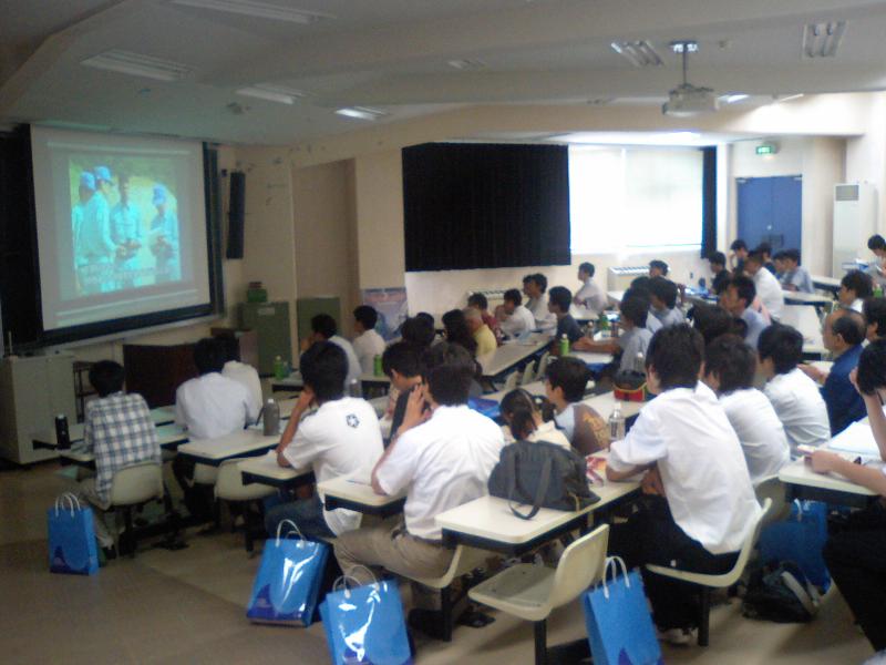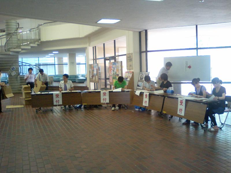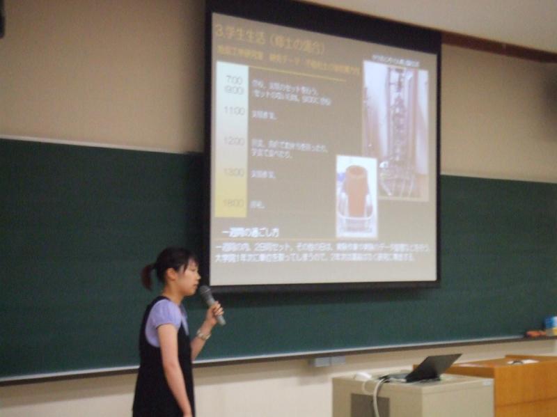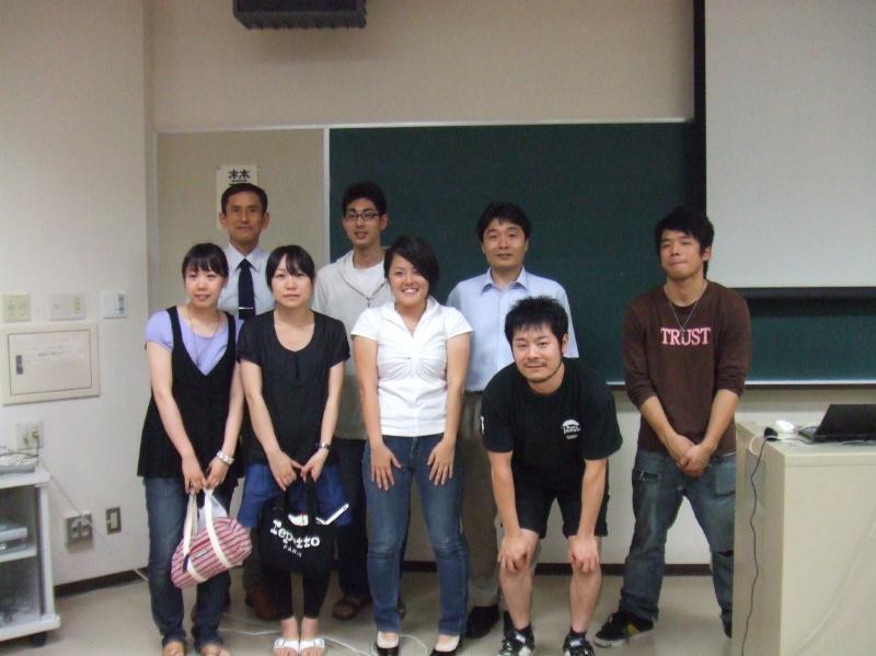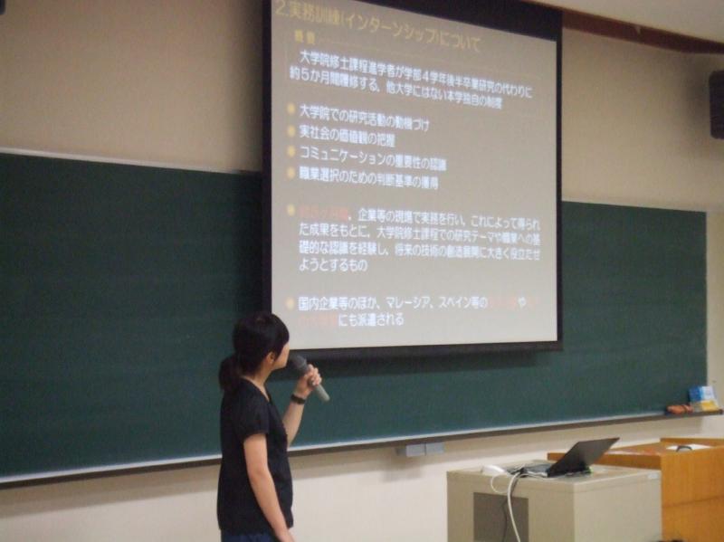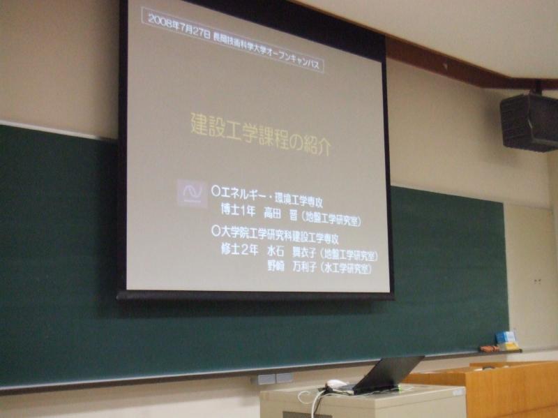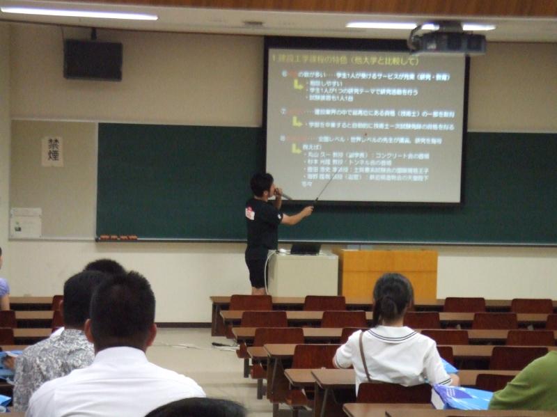 7月27日に本学恒例となっているオープンキャンパスが開催され,本研究室のDr.高田と修士2年水石さんと水工学研究室の野崎さんの三人で建設工学課程の学科紹介を行いました.当日は,朝から受付業務を担当し,昼から発表を行いました.建設工学課程の特色について(高田),学生生活および就職活動について(水石),実務訓練について(野崎)それぞれ発表しましたが,聴講された高校生や親御さん達が熱心に我々の発表に耳を傾けておりました.最後に,合同で発表した環境システムの学生と,入試担当の環境佐藤教授と建設豊田准教授と記念撮影を行いました.