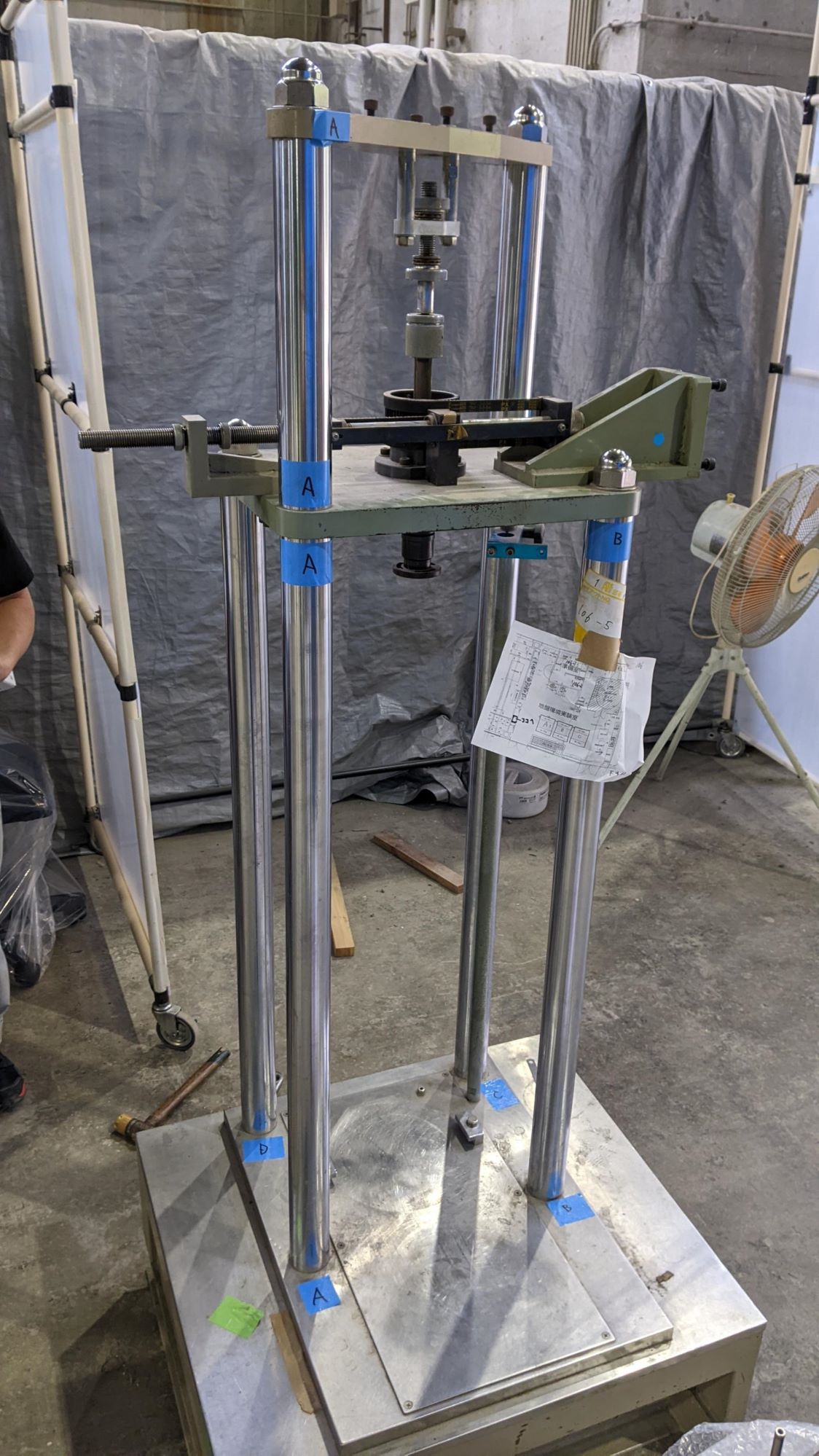 載荷装置の反力フレームは,採寸の結果,読み通り,本研究室初代装置と同型のものでした.そこで,装置上物をそっくり初代と交換移植することを考えました.そうすることにより,制御プログラムや電動レギュレーター内臓のセル圧(外圧)や背圧載荷装置もそのまま使用できることになります.装置下物は清掃と一部部品交換程度ですので,倉庫に眠っていた初代を復活させるだけで,試験装置の要である載荷・制御の部分を超低コストでレストアすることができます.