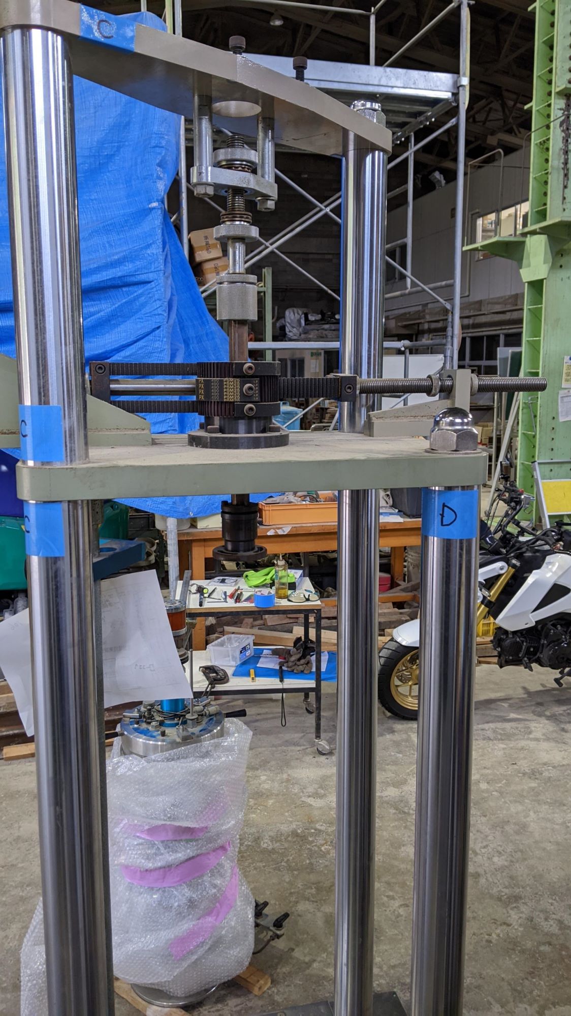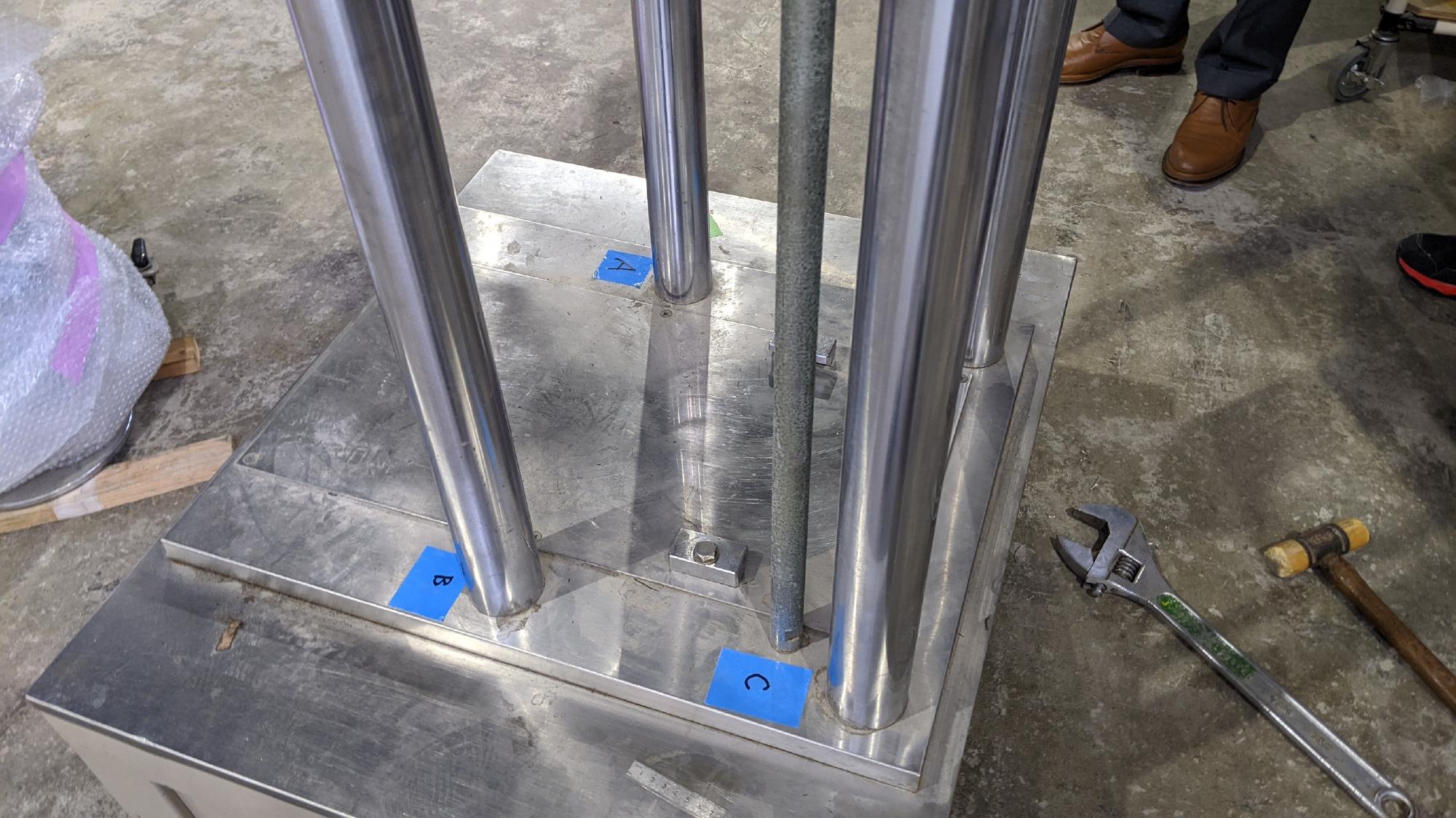 - 2023年12月5日,載荷装置の反力フレームをバラバラに分解しました.稀に,はめあいがシビアな場合があるので,支柱の位置は元あった場所に戻せるようにマークすることが大切です.