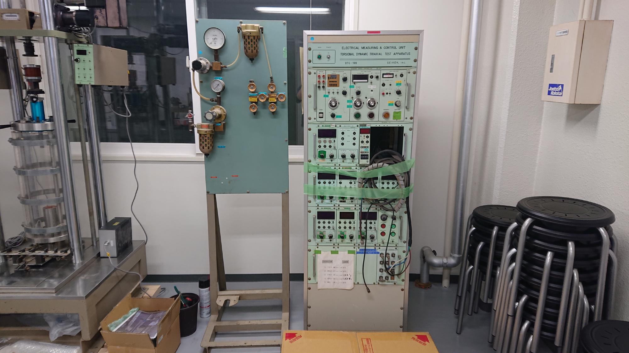 - この制御BOX(図7)は繰返し三軸試験機と兼用していたようです.本研究室では,荷重制御はしないので,これも必要な部分を除いて,同様にポイです.
