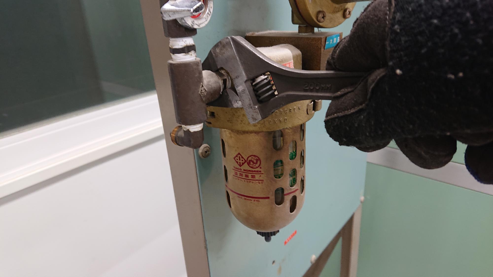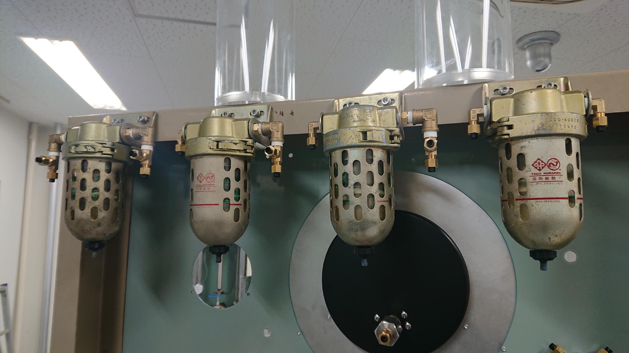 - エアーフィルターは,コンプレッサーから送られてくる圧縮空気を,ルーバーデフレクター(図90中の波波しているところ)で旋回させ,その際に生まれるサイクロン効果で水滴を分離するものです.長岡は湿度が高いので,制御盤表側に設置した一次圧用のものは,本来の目的の通り,圧縮空気の飽和水蒸気を分離するために設置します.夏場はここがいつもすぎことになります.一方で,制御盤裏側に設置したものは,試験機トラブル,人為的ミス等で逆流した水がレギュレーター内に流れ込むことを防ぐことが目的になります.