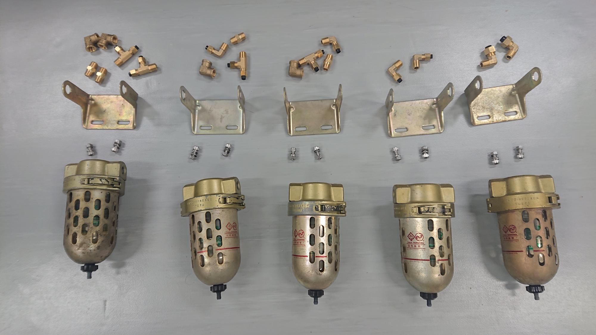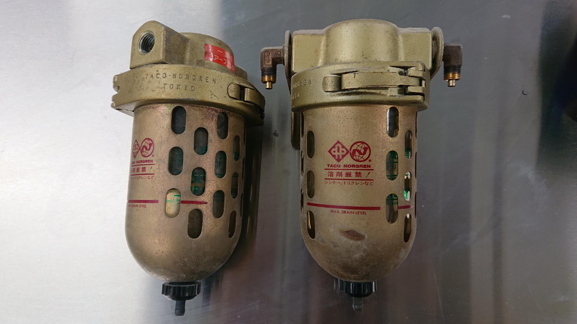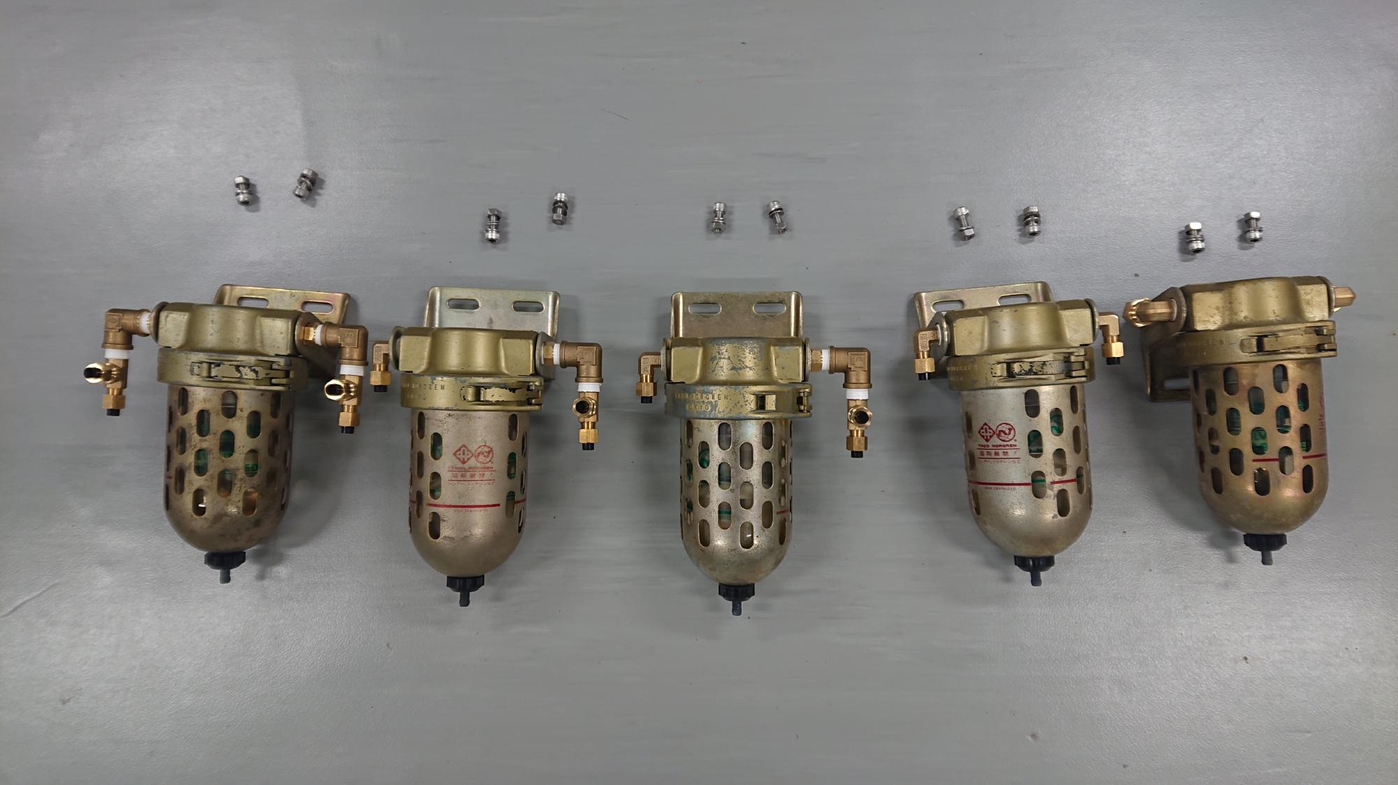 - 今回は「分解の様子」の項で確保したフィルターと手持ち在庫を合わせた5個用意しました.フィルタードレーンは「オート式」,「マニュアル式」とありますが,トラブルの元になるので,前者を選択してます.また,ドレンの口金は,金属製のものは錆びて劣化するので,必ず樹脂製のものを選択することがコツです.