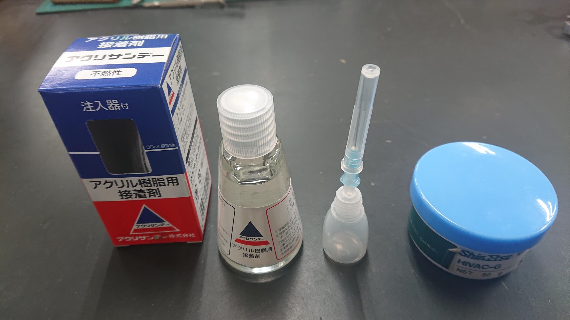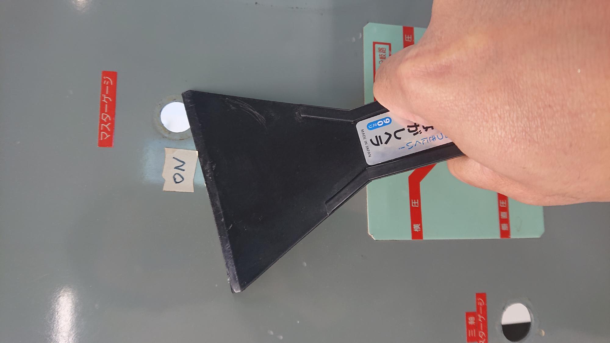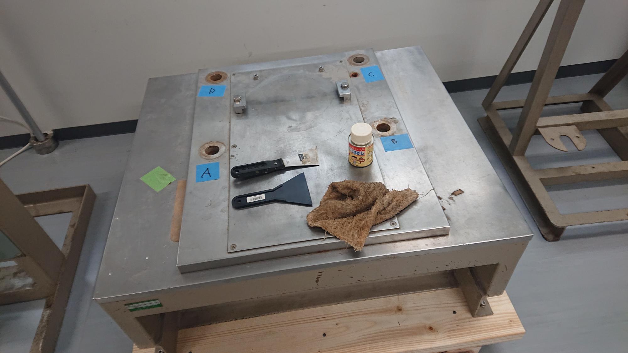 - 2023年12月18日,載荷装置の清掃を行いました.使用した道具は,キムタオル,スクレーパー,ガムテープはがし液(図2)です.ちなみに,キムタオルは4枚重ねになってますので,面倒ですが,1枚1枚分けて使用したほうが拭きやすいです.