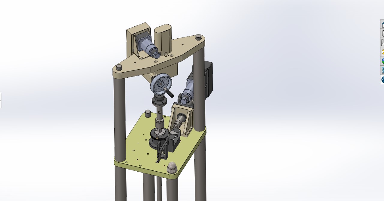 - 載荷装置上物に関しては,初代装置が実装できるかを,三次元CAD(図7)内でモデルを作成して,組立ができるかを検討しました.その結果,垂直方向のベアリングAssyが,無加工でそのまま載ることが判明し,載荷装置マウントベースを一部追加工することで,全てを実装できることが分かりました.とてもラッキーな結果でしたが,1個1個部品を実寸で3Dモデル化しないといけないので,多くの時間を費やしました・・・.