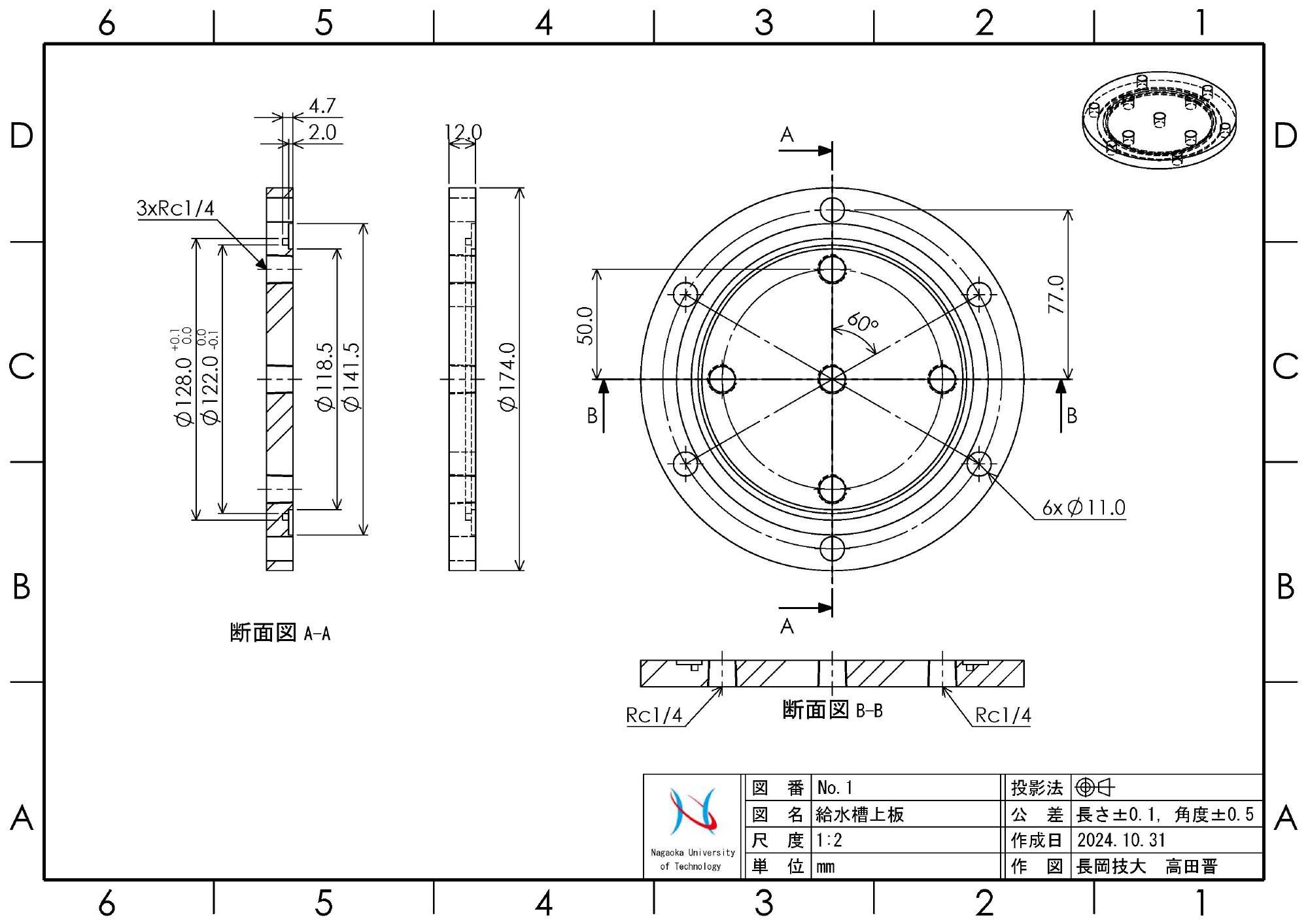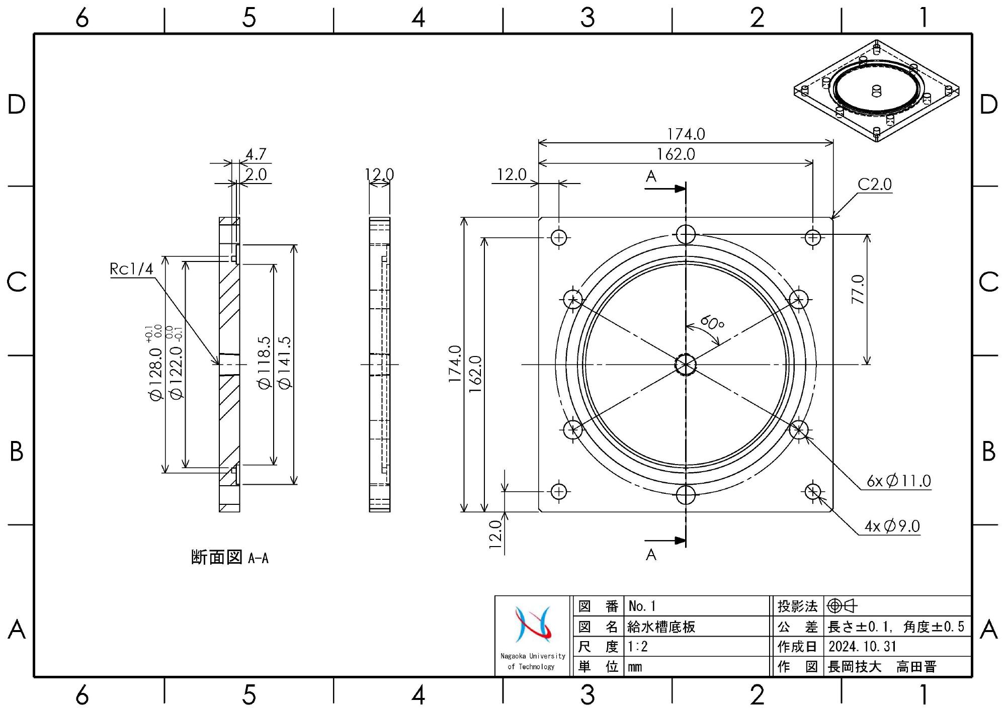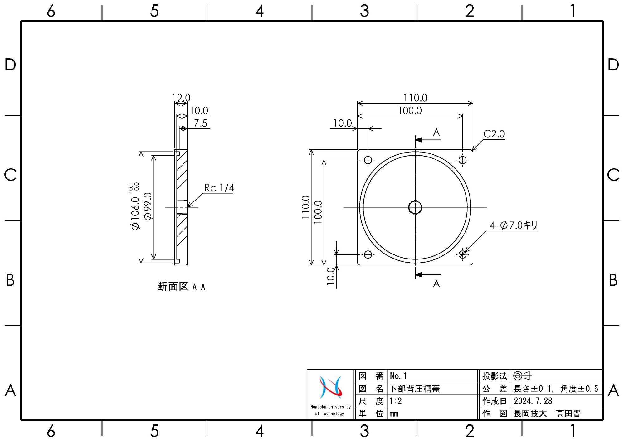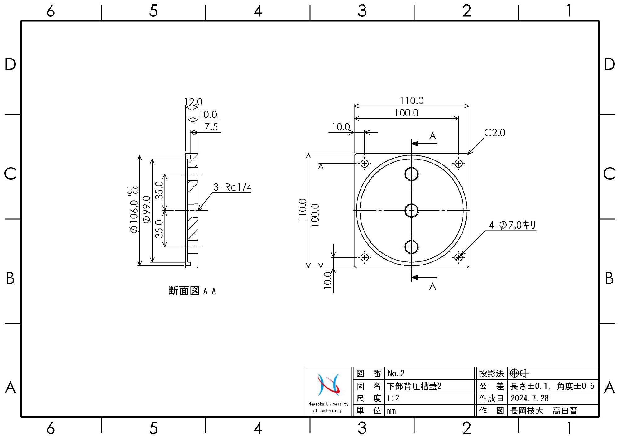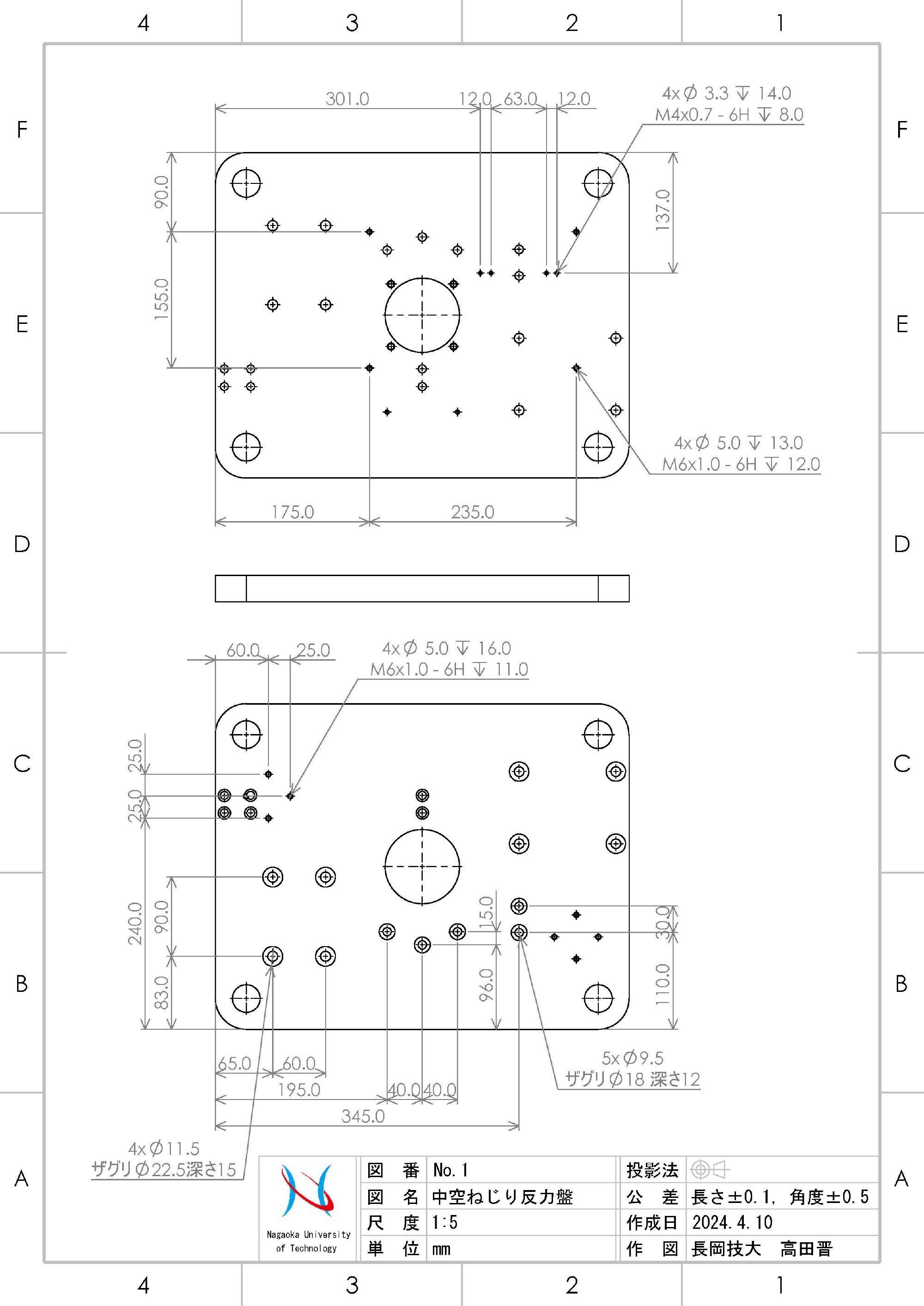 - 2024年4月10日,トルク用モータブラケットやラックギアマウントの設置場所が新旧で異なるので,載荷装置マウントベースに追加工を施しました.それらの座ぐり穴開け箇所を確保することが困難でしたので,ベースの前後をひっくり返して使用することとしました.これに伴って,外部変位計用支柱の取り付け穴も反対側に加工しました.加工は精度を要求するので,マシニングセンターで行うために,本学工作センターに委託しました.なお,加工用の図面(図8)はこちらで用意しました.