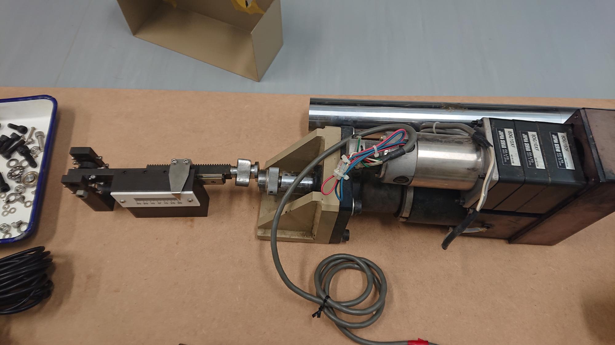 - 載荷試験装置は,ラックandピニオン形式でしたが,モーターが付いてませんでした.初代のDCモータを移植できるか,検討が必要です.
