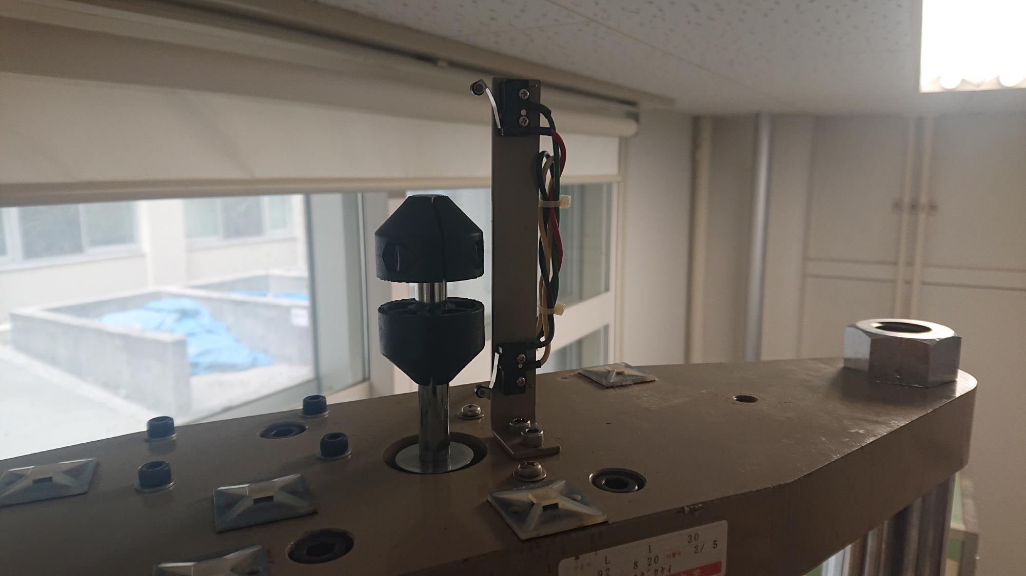 - 垂直力およびトルクの物理ストッパー用スイッチ(図12)は,試験装置の保護に最も役立つものなので,載荷ストロークに応じて適正な位置に設置します.最初は,直ぐに効くような,キツメな位置に設置するほうが良いです.