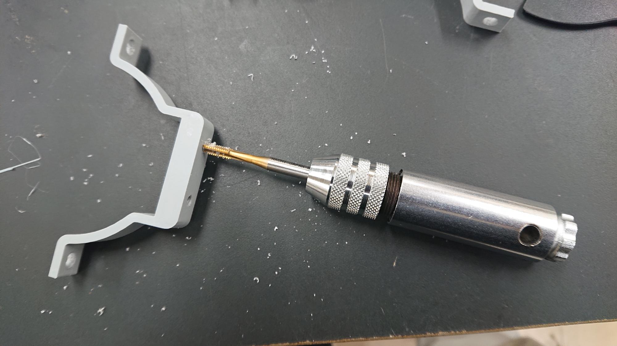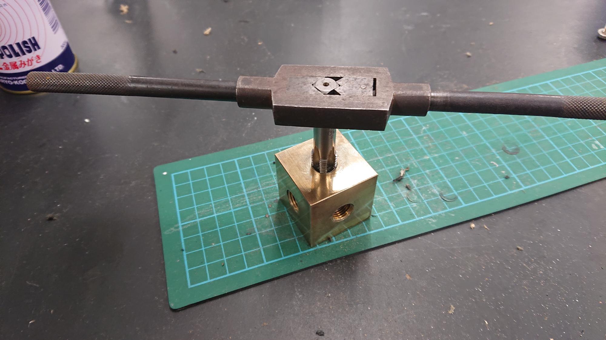 - メスネジのタップは,図137のようなガイドを使用すると,垂直に保ったままでネジ切りができるようになります.また,ハンドルはラチェット式だと持ち替える必要が無いので,楽に加工できます.ハンドタップ加工時はこのセットがお勧めです.当然ながら,加工中はタッピングオイルをタップに吹き付けてから作業してます.