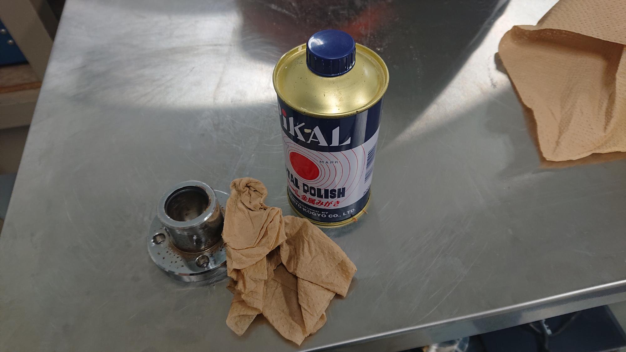 - 手磨き作業で使用した道具は,キムタオルと伝家の宝刀ピカール(図22)です.浮き錆は置いておいて,それ以外は予想以上にピカピカになりました.
