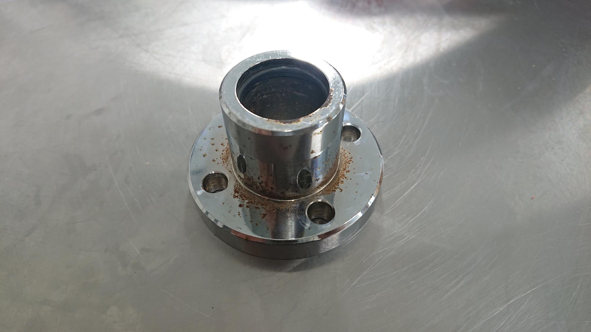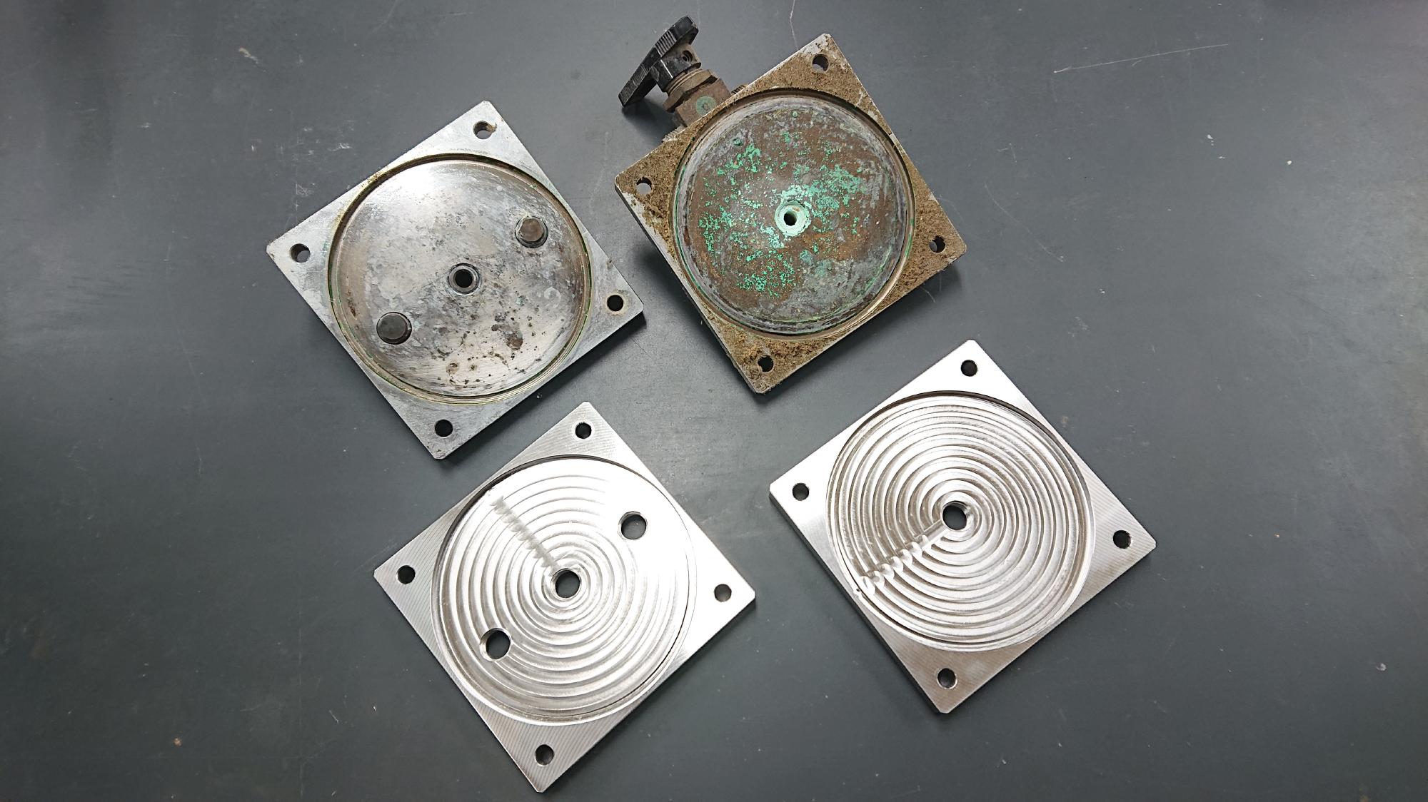 - バルーンは使用しないので,今回はオミットします.一方で,重要な下部背圧槽は,上下の蓋が真鍮にクロムメッキしたものなので,すでに錆び錆びになってました.今回は,この蓋部分だけリバースエンジニアリングで図面を起して,ステンレス(SUS304)製のものに置き換えようと思います.