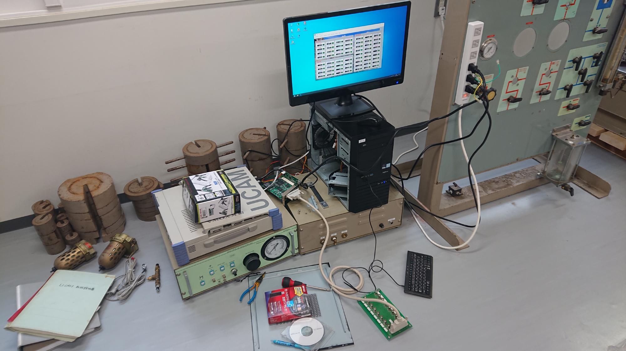 - 使用したデータロガーは共和電業製のUCAMです.イーサネット通信出始めの機種なので,A/D変換ボードが不要で,スイッチングハブを1個挟めば直ぐに測定できるのは楽ですね.ただし,静的なロガーなので,早い実験はできませんが・・・.