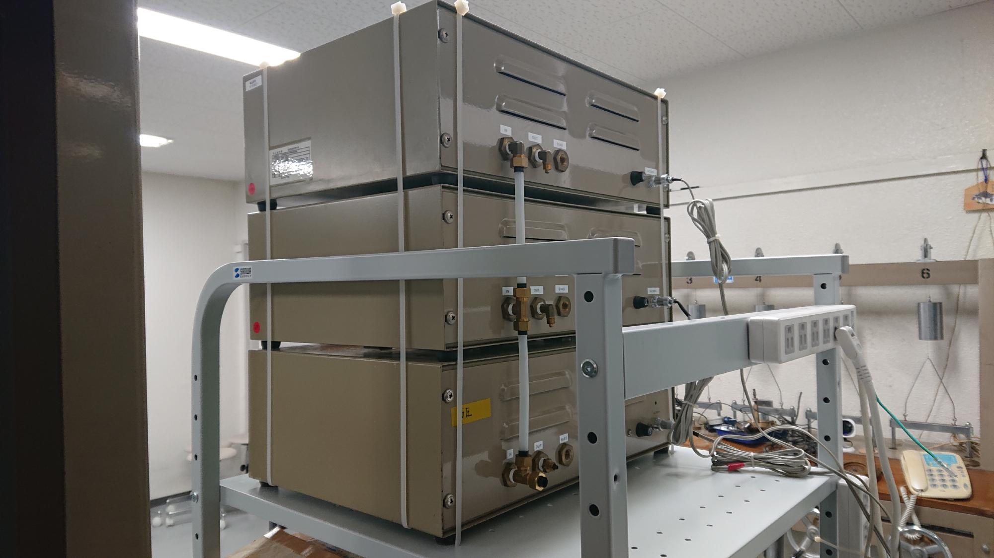 - 昔のレギュレーター本体は,剛に作られているので,地震時の転倒を防ぐために,三段重ねして,配管を行い,結束バンドで強めに束ねるようにしてます.ちなみに,この作業のために,棚板にパンチ穴が開いているPCラックをセレクトするようにしてます.