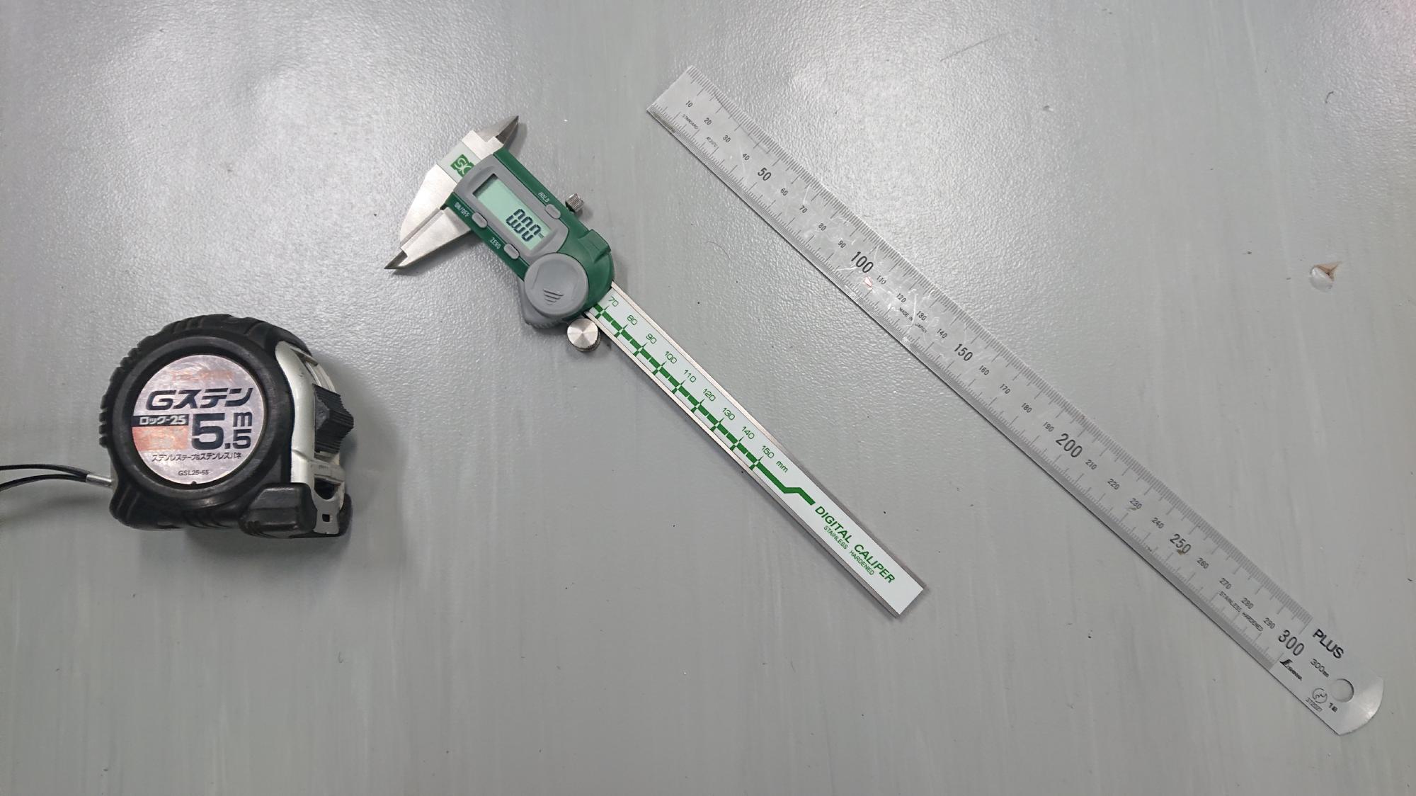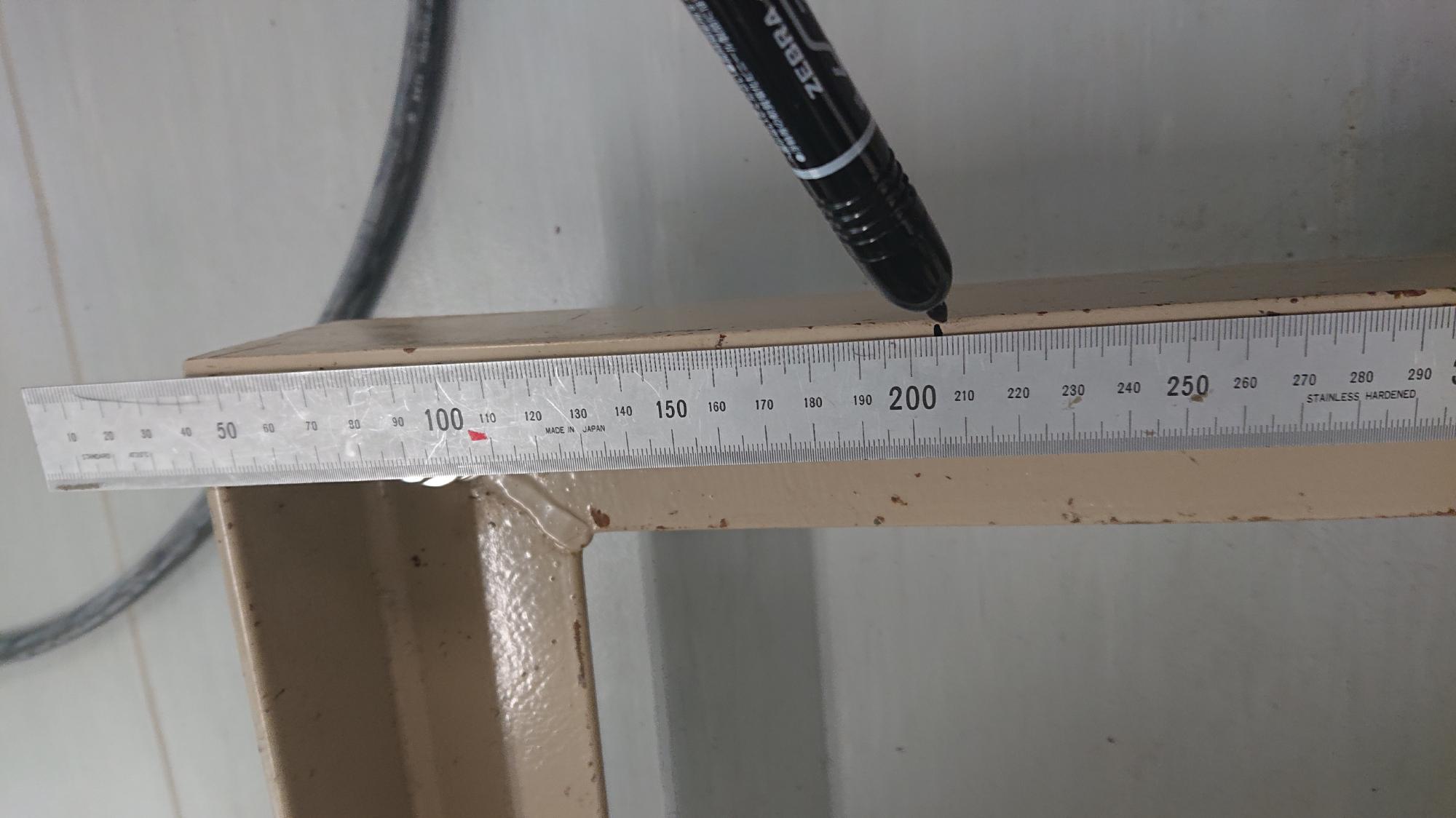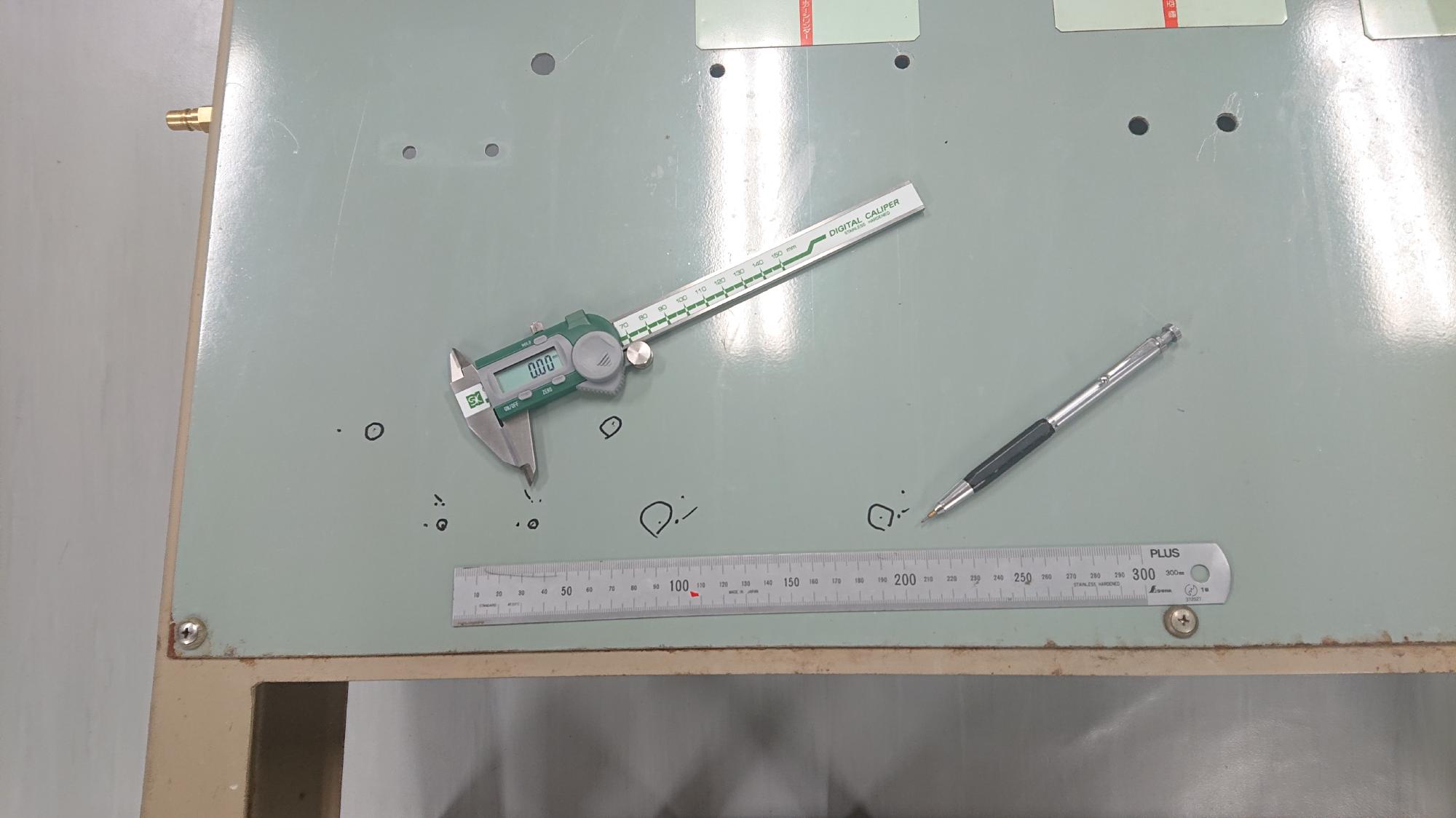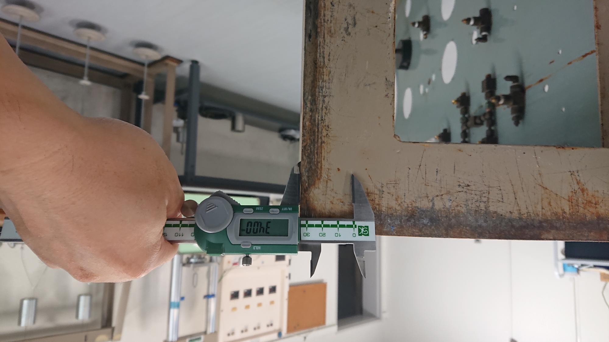 - 制御盤を横向きにおいて,キャスター取付ボルト設置個所をケガキ用デジタルノギスでケガキました.このノギスは秀逸な道具で,ノギスの片側のジョーに超硬チップが埋め込まれているので,1/100mmの精度で,測定とケガキを同時に行うことができる優れものです.余談ですが,新潟県の大学ですので地域貢献という意味を込めて,作業用道具はなるべく燕三条製のもので揃えてます.