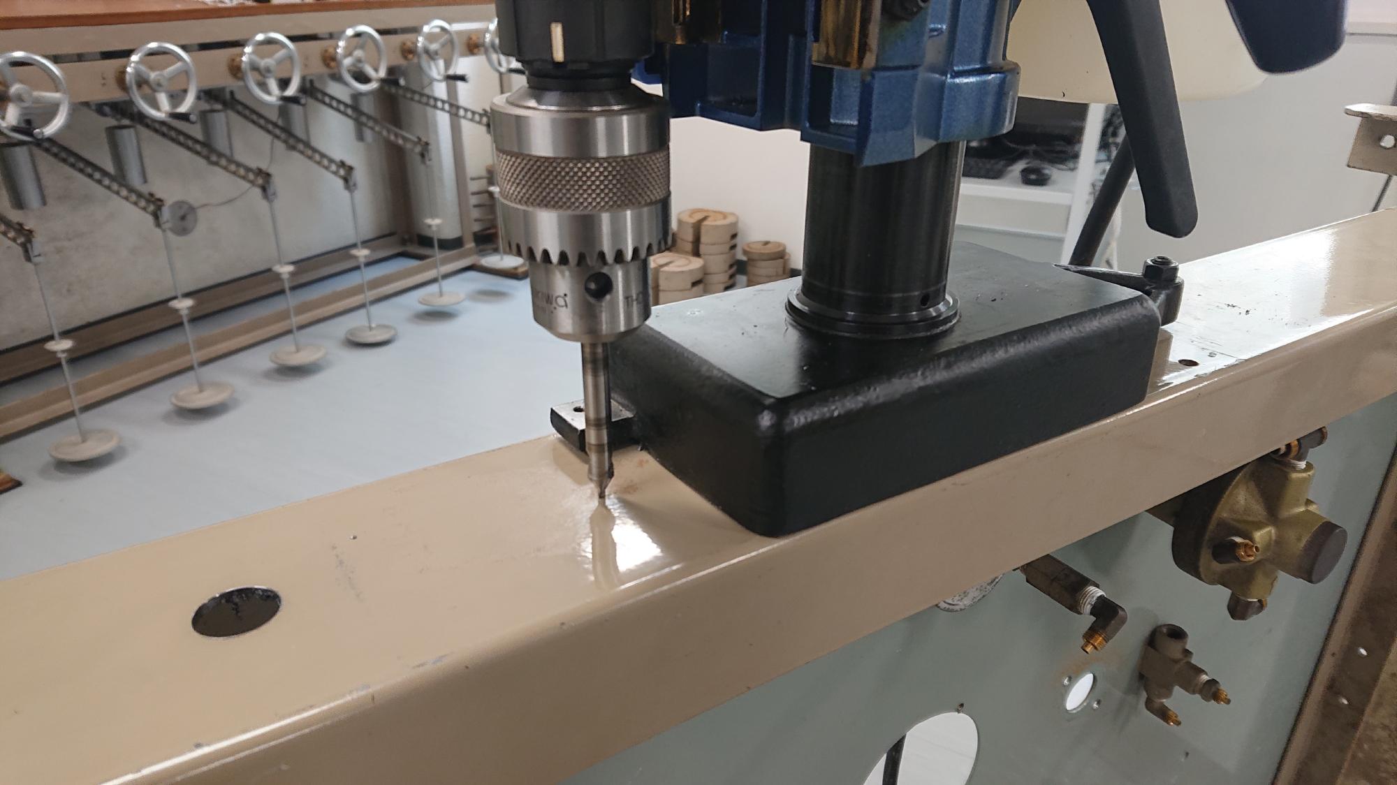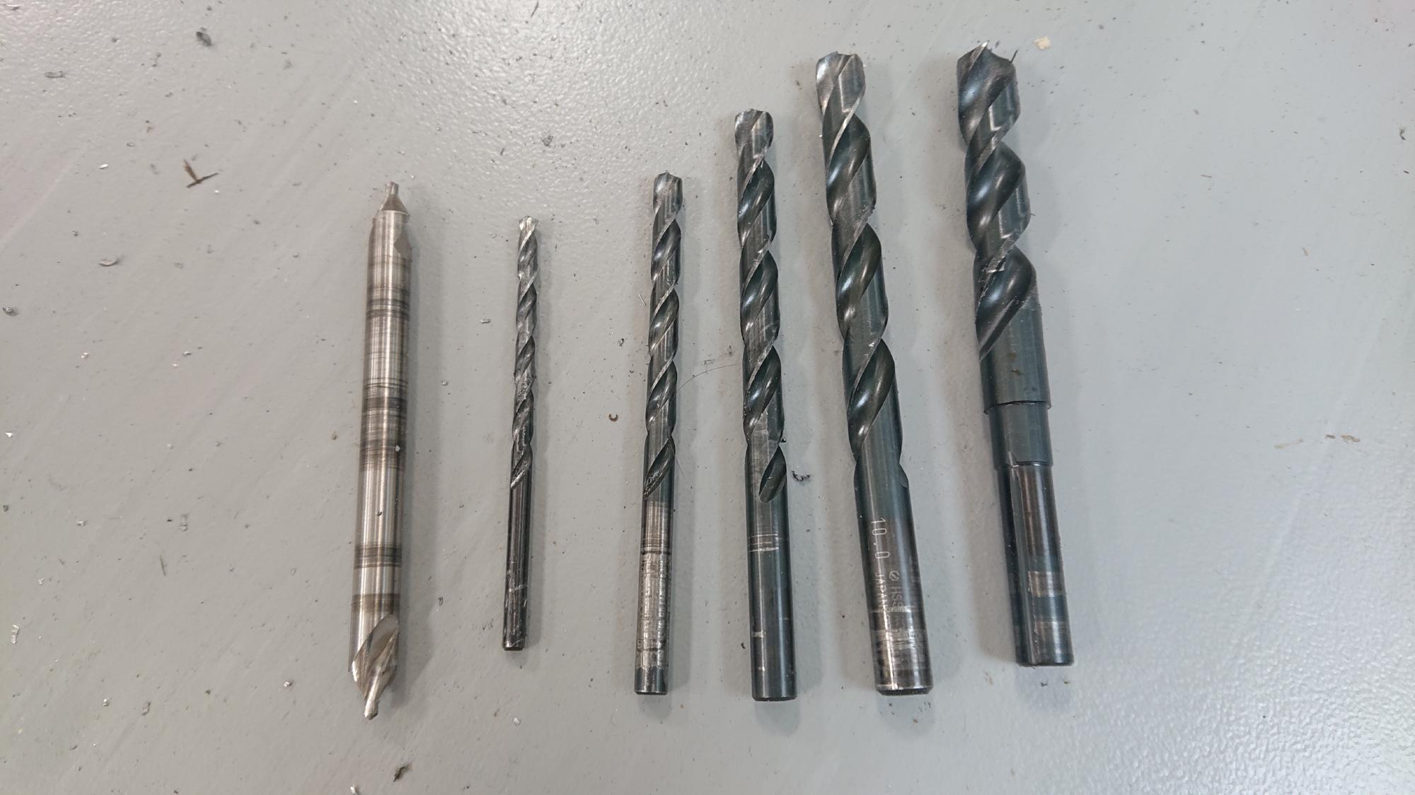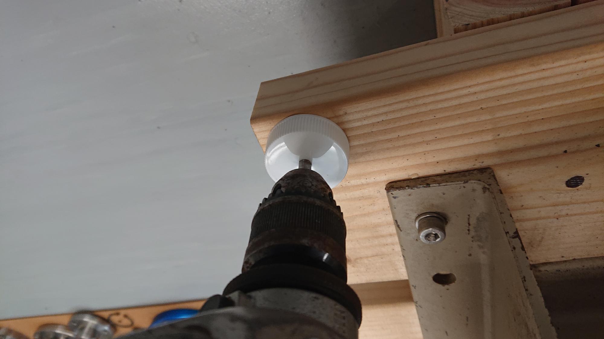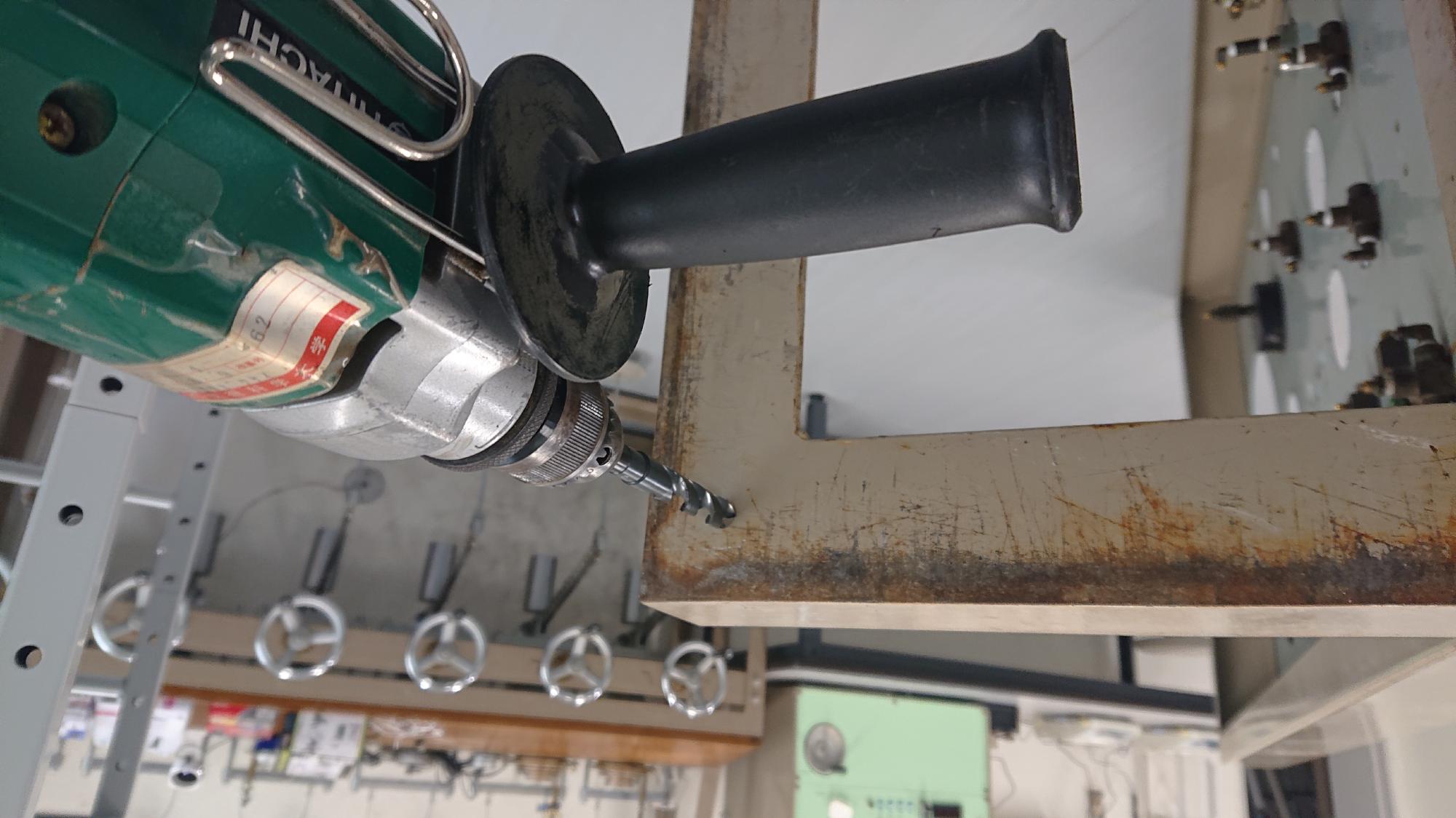 - キリ穴は,センタードリルから始まり,少しづつ径をを大きくして,キャスター取付ボルト径+1mmの大きさまで開けます.ドリルはハンドドリルです.10mm径以上のツイストドリルを使用する場合は,チャックはそのままで,10mmストレートシャンクのノス型ドリルに切り替えて作業を行います.