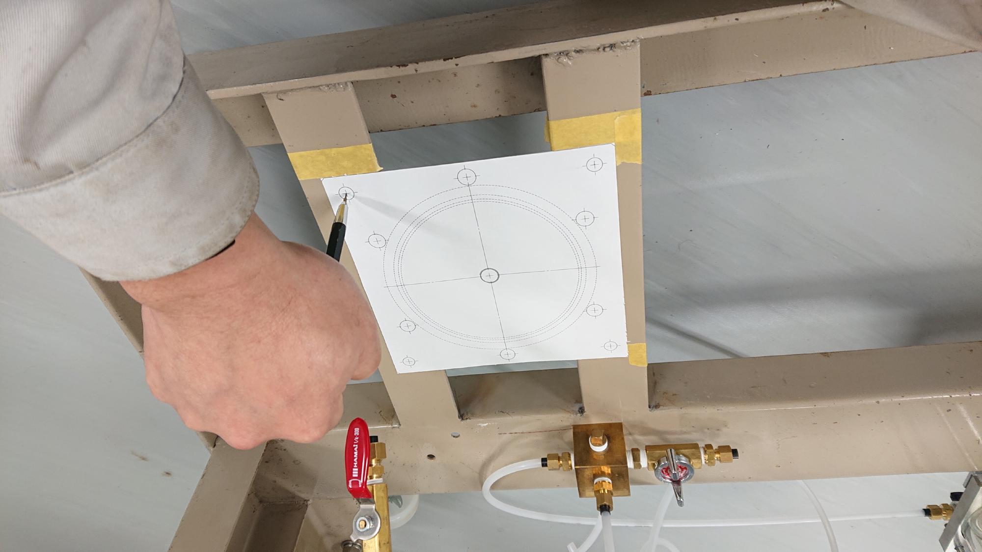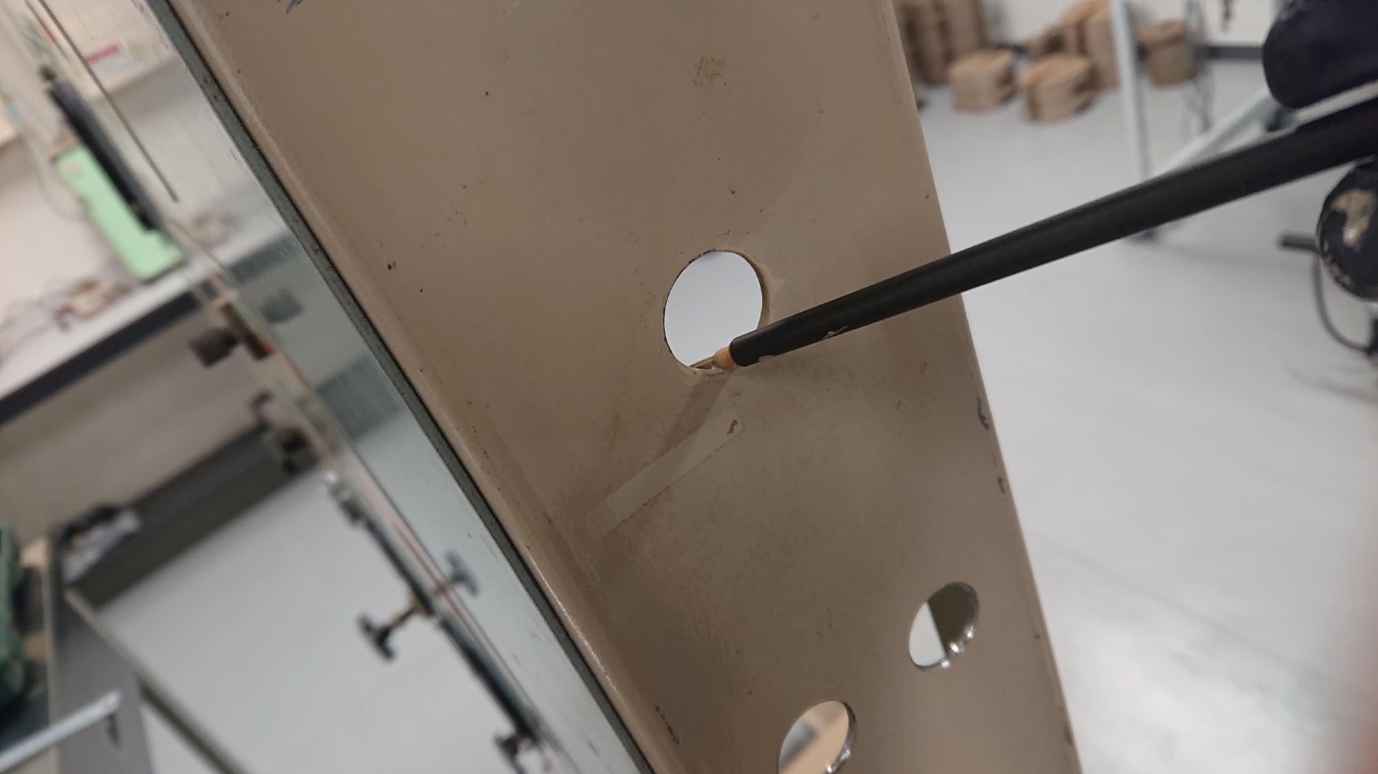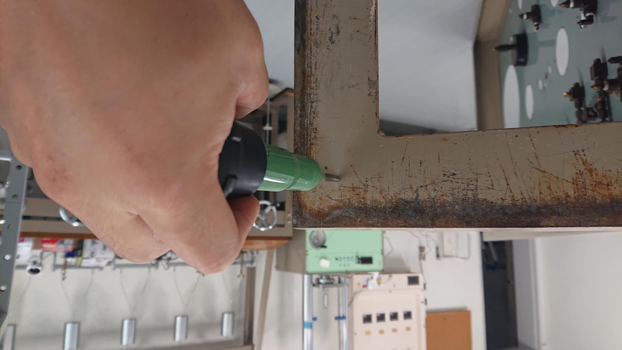 - 両者は,制御盤下端部から制御盤天面に設置してある真空槽,脱気水槽に繋がる給排水径路の入口にあたる部分になります.接続されるチューブが長くなるので,経路は制御盤表から通して,裏側に抜けないと見た目が悪くなります.そのため,「空圧供給ワンタッチポート取付」に登場したパネルユニオンを用いて径路を貫通させる処理を行います.他の試験装置の制御盤を参考に穴開け箇所をけがいて,ハンドドリルとアトラで穴を開け,穴開け箇所側面の錆止め塗装を行います.なお,穴開けは後述の一次圧用のエアフィルターの分も合わせて行いました.