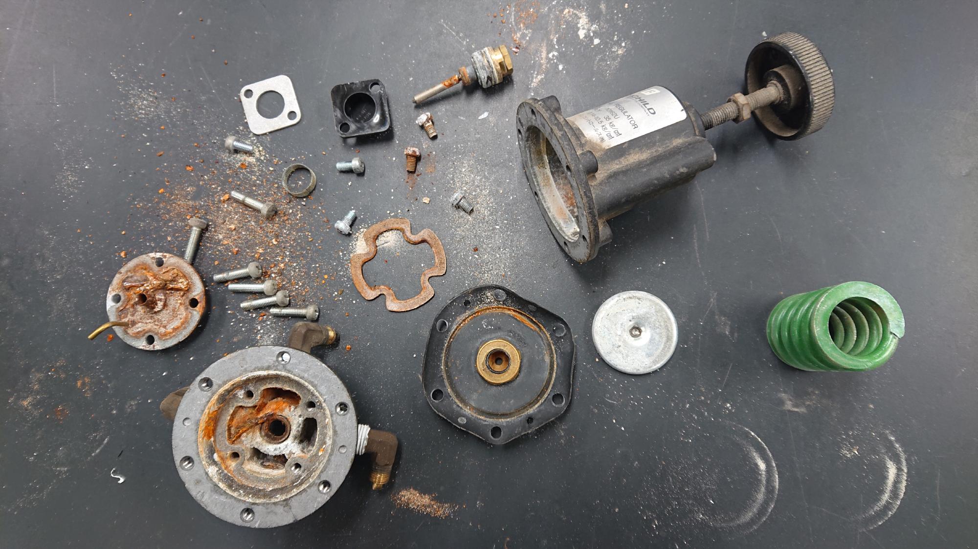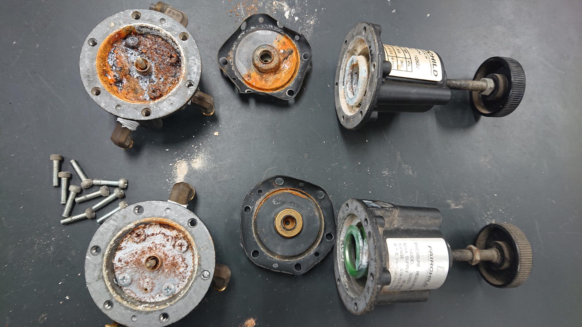 - 2024年2月27日,レギュレーターのオーバーホール作業を行いました.下準備編で残ったものを,分解,清掃して再利用したいと思います.今回は2個オーバーホールしましたが,いずれもFairchild製モデル10,正圧用のレギュレーターです.これらはセル水供給用の調圧弁として利用する予定です.