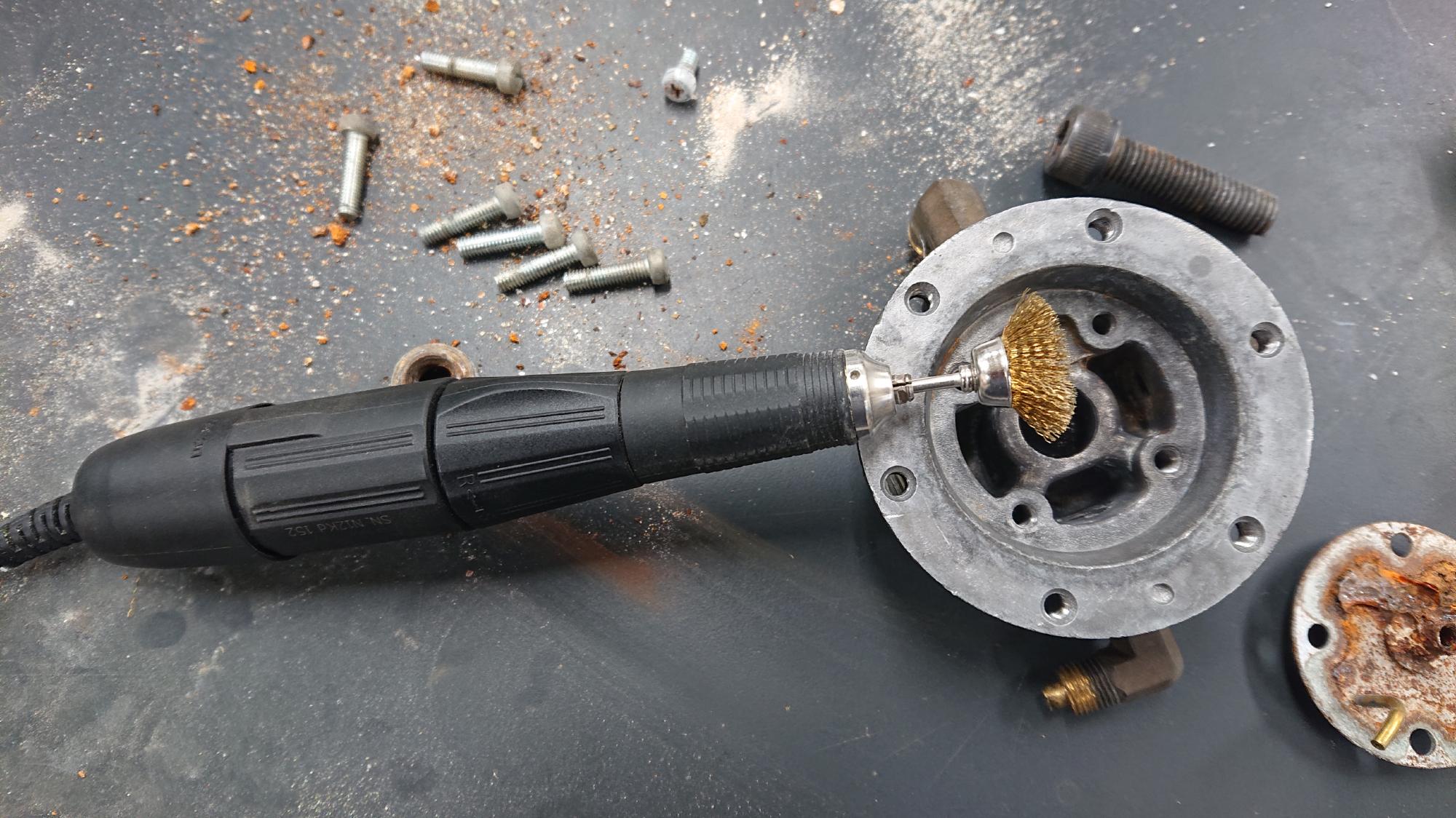 - 電動リューターに軸付ミニカップワイヤーを取り付けて,図16のように錆びを落としていきます.インナーバルブがある中央の円筒箇所は,しつこく錆び落としを行うと,はめあい公差が狂うので,ほどほどにします.鉄さび,アルミの白錆びを全て落としたら,交換部品を取り付けて,殻を元に戻します.たまに,レギュレーターのノブのおねじ,めねじがスッテンテンになっていることがあるので,最後に動作確認します.