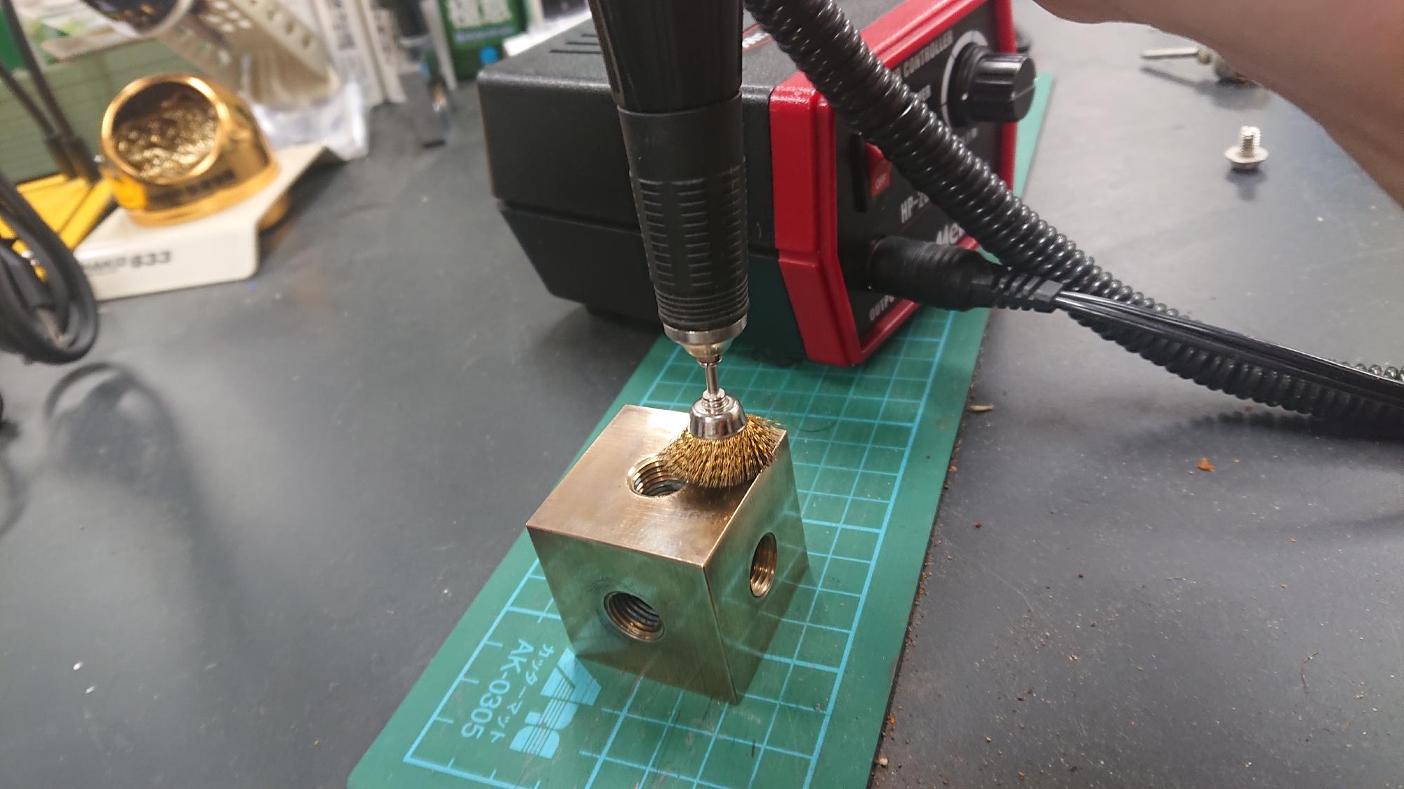 - 作業前の状態は汚れや錆で再利用したくない雰囲気でしたが,真鍮製ですので,丁寧に磨き作業を行えば,外見を新品に戻すことができます.まずは,レギュレーター同様,カップワイヤーで大まかに汚れを落とします.その後は,伝家の宝刀「ピカール」でひたすら磨くだけです.