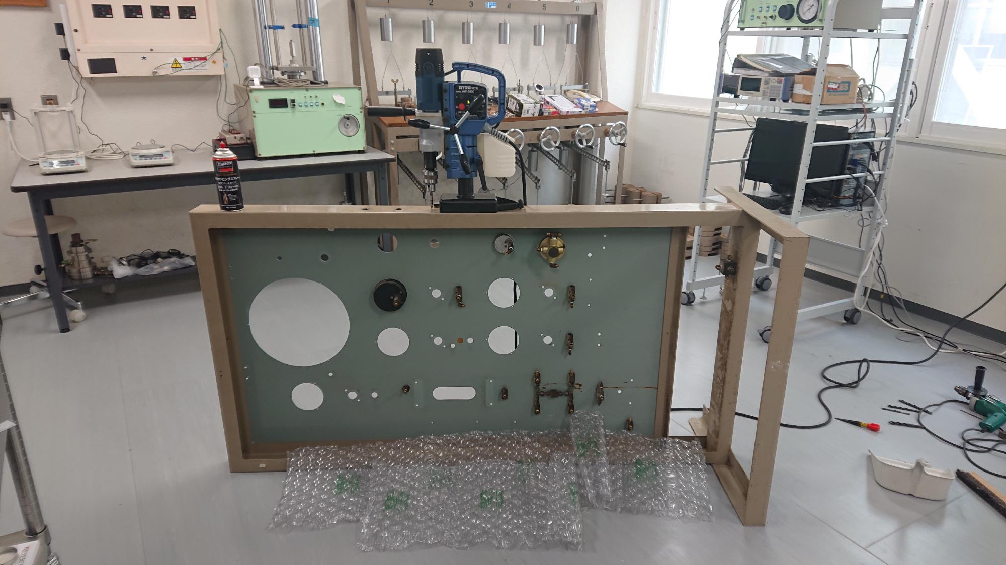 - 2024年4月20日,制御盤から不要なものを除去する作業を行いました.とは言っても,バルブ,圧力ゲージ,エアフィルタ,ビュレット等全部ですけど.