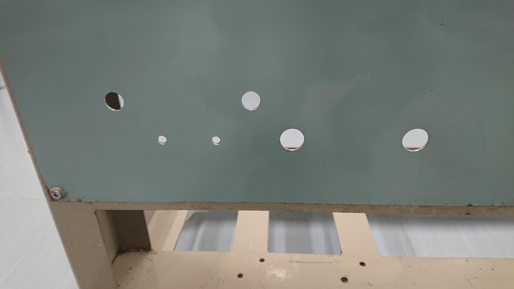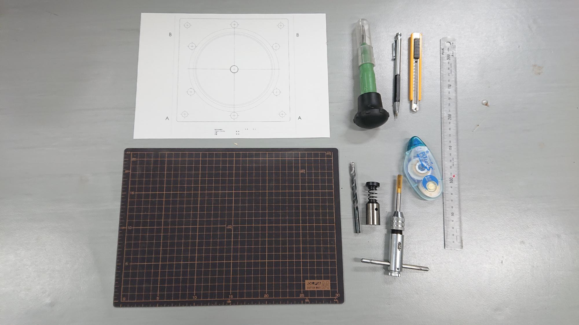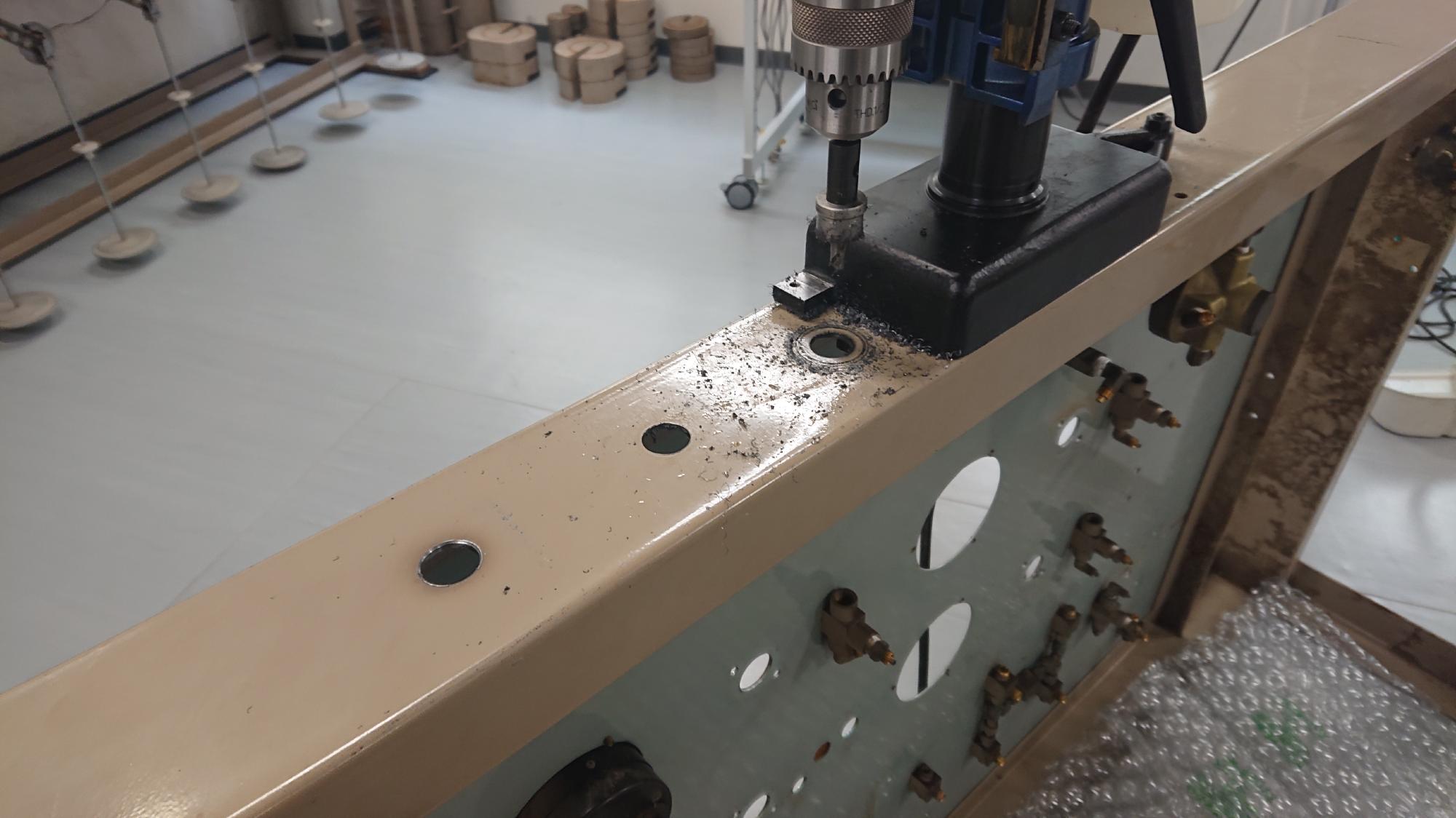 - 穴開け箇所にケガキを行い,オートポンチでポンチングを行います.その後は,センタードリルで下穴を開けて,一気にメタルホールソーで目標の大きさの穴を開けます.最後は,カウンターシンクでバリ取りを行い,パーツクリーナーで掃除して終わりです.