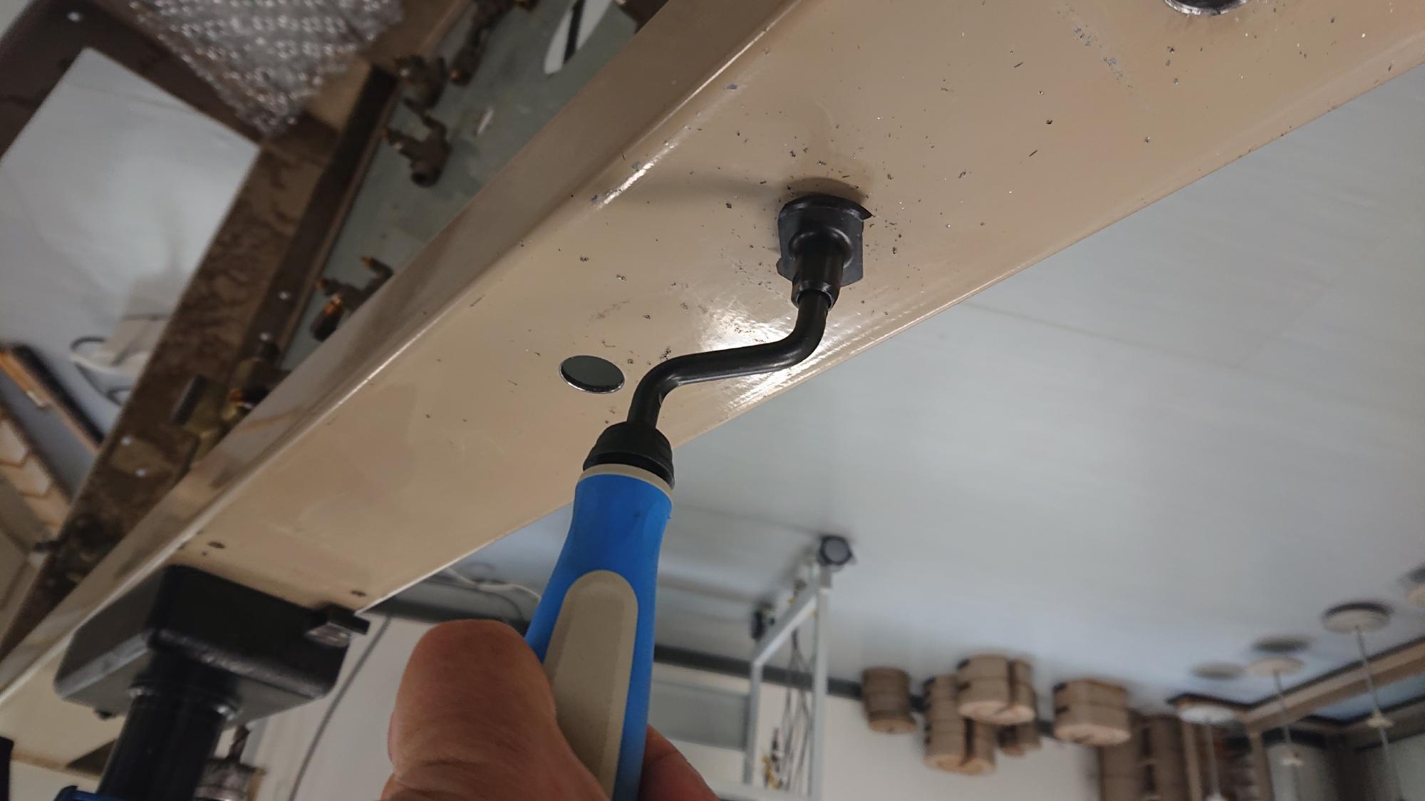- キリ穴貫通後はキャスターを組み込み,座金,ナットで締結します.後々のことを考えて,使用するものはユニクロ製のものではなくて,ケチらずSUS製を使用します.この場合,キャスター側の六角部分の掴みしろが薄いことが多いので,極薄のモンキーレンチまたはスパナがあると便利です.