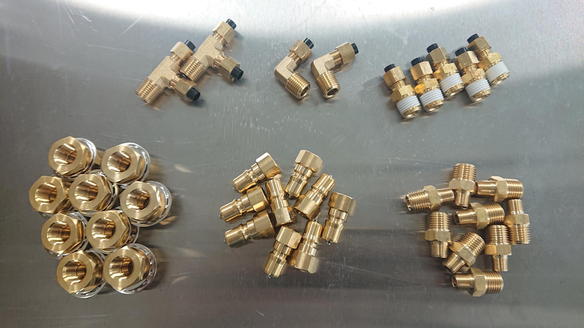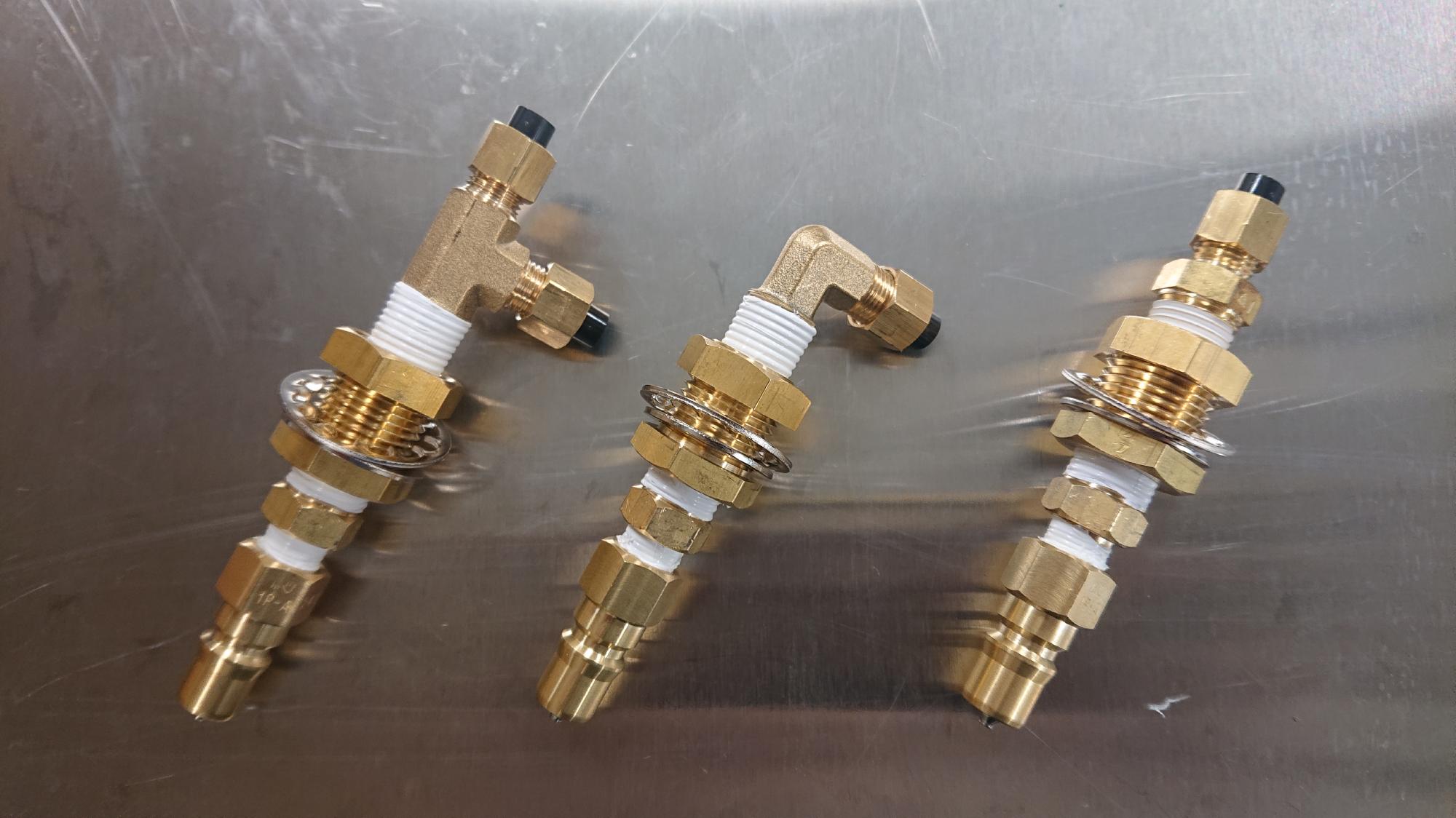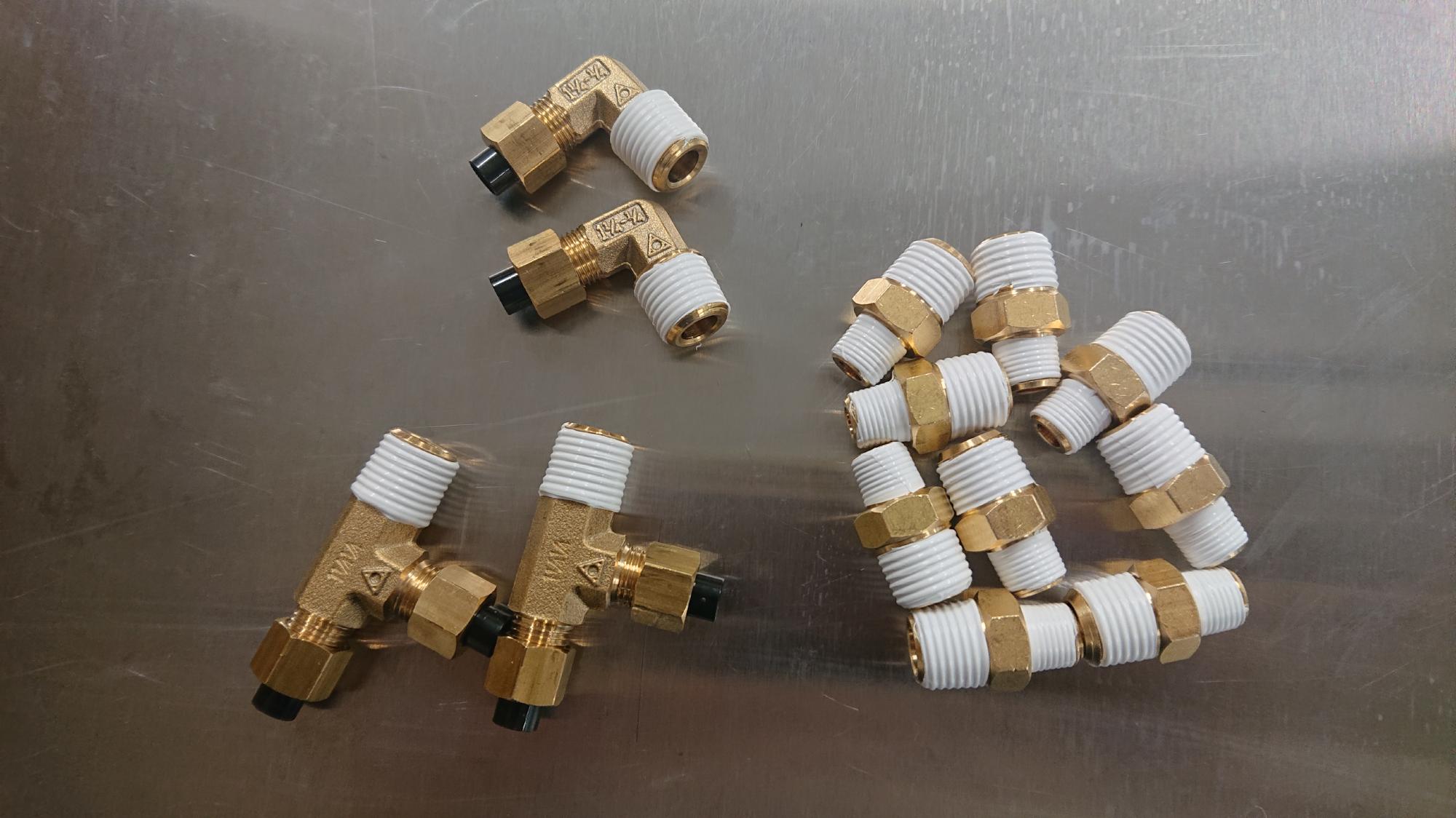 - 見た目にも影響を与えるので,なるべく継手が傷付かないように配慮しながら作業を行います.オスワンタッチカプラー,1/8-1/4異径ソケット,パネルユニオン,チューブソケット(ストレート,エルボー,サービスティーの三種)を連結させます.