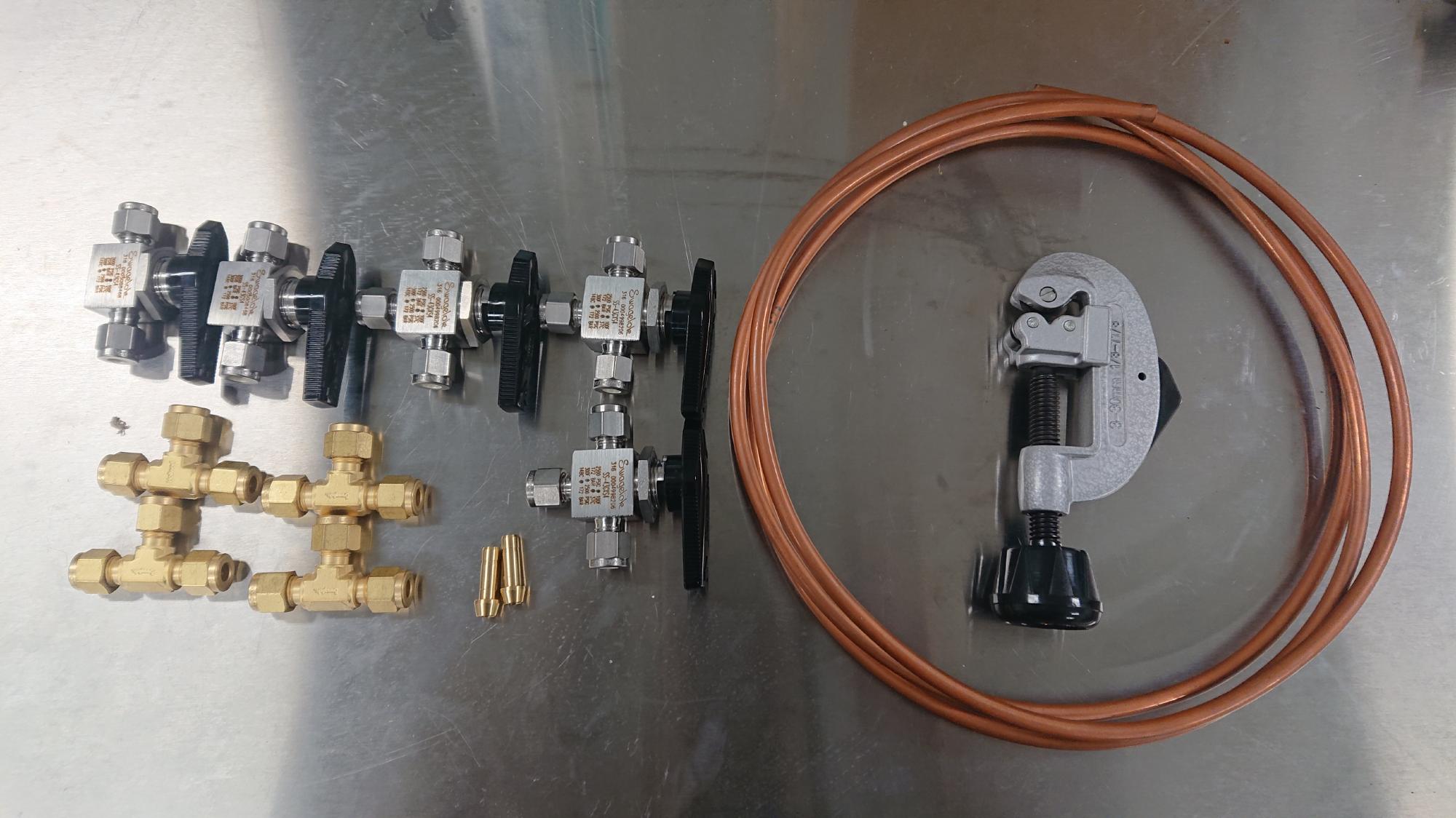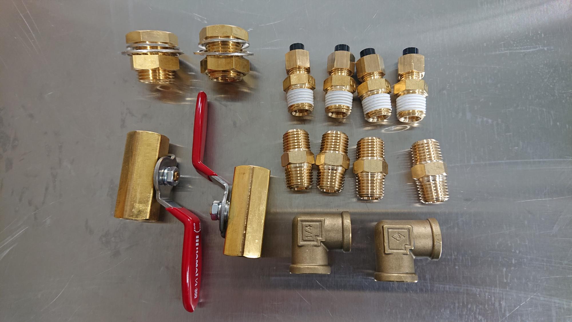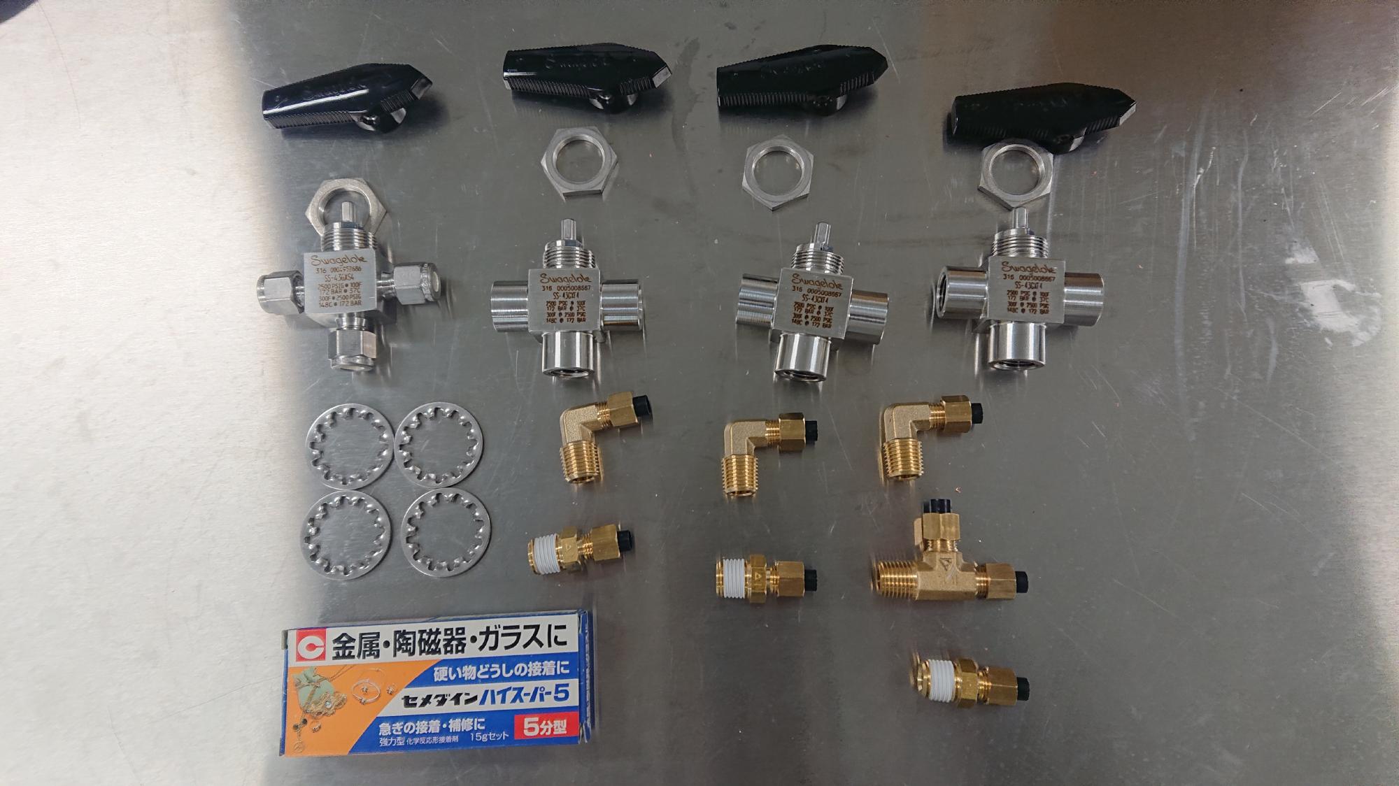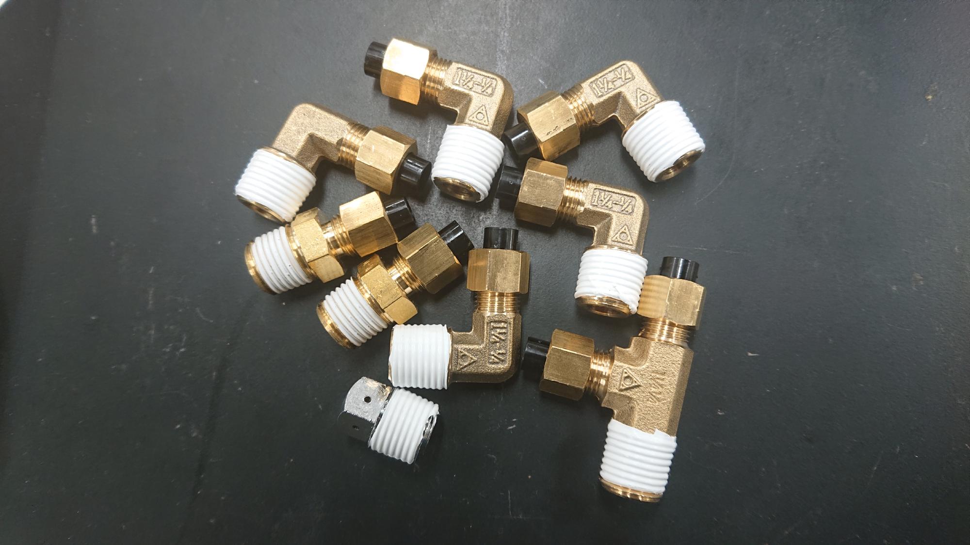 - 見た目にも影響を与えるので,なるべく継手が傷付かないように配慮しながら作業を行います.オスワンタッチカプラー,1/8-1/4異径ソケット,パネルユニオン,チューブソケット(ストレート,エルボー,サービスティーの三種)を連結させます.