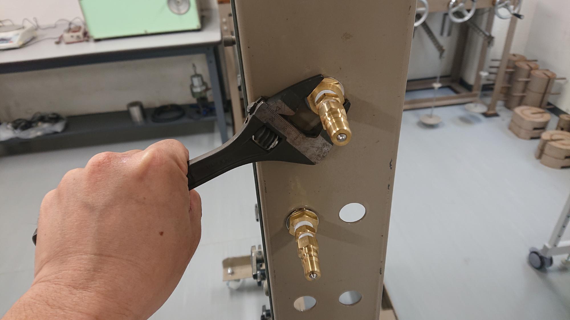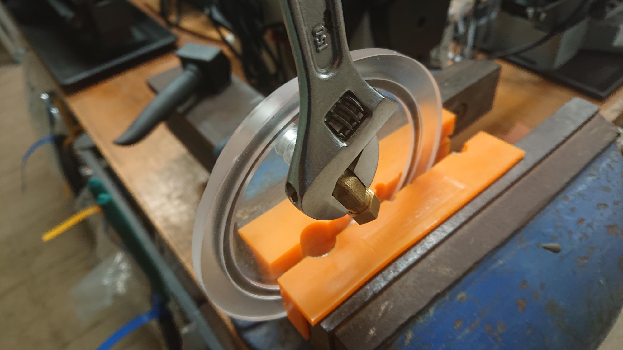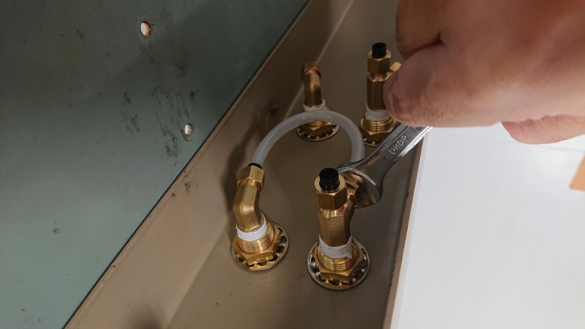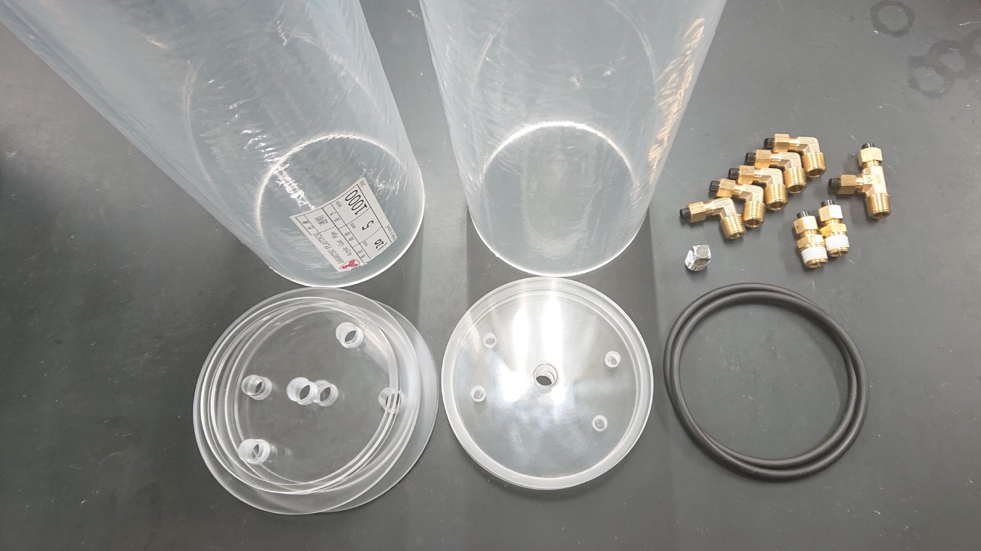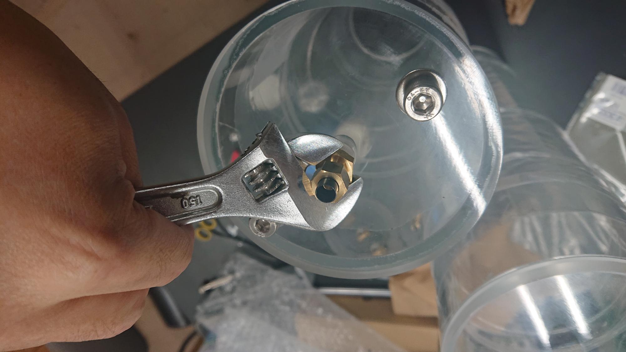 - 継手類の組込みは,ねじ込む力を見ながら慎重に行います.余りしつこく締めるとアクリルが割れるので,ほどほどにします.