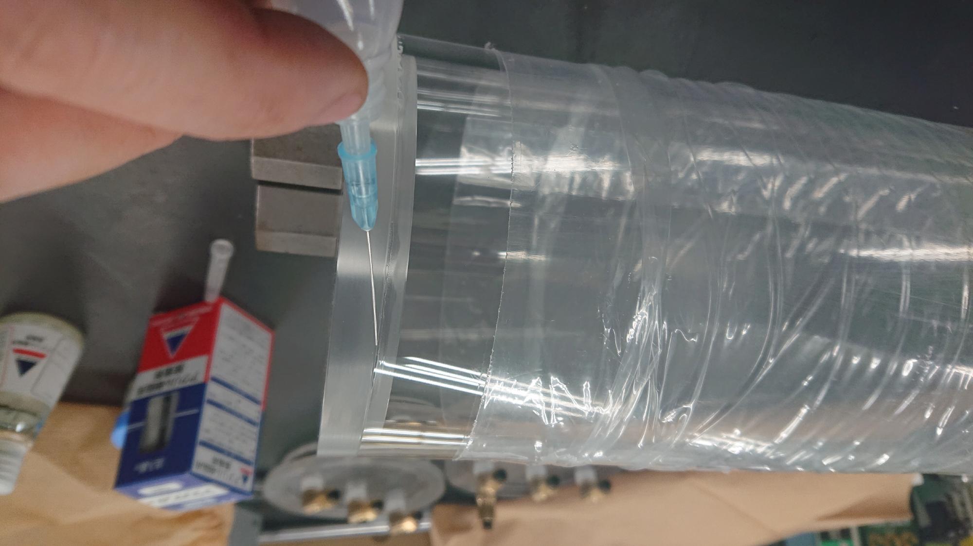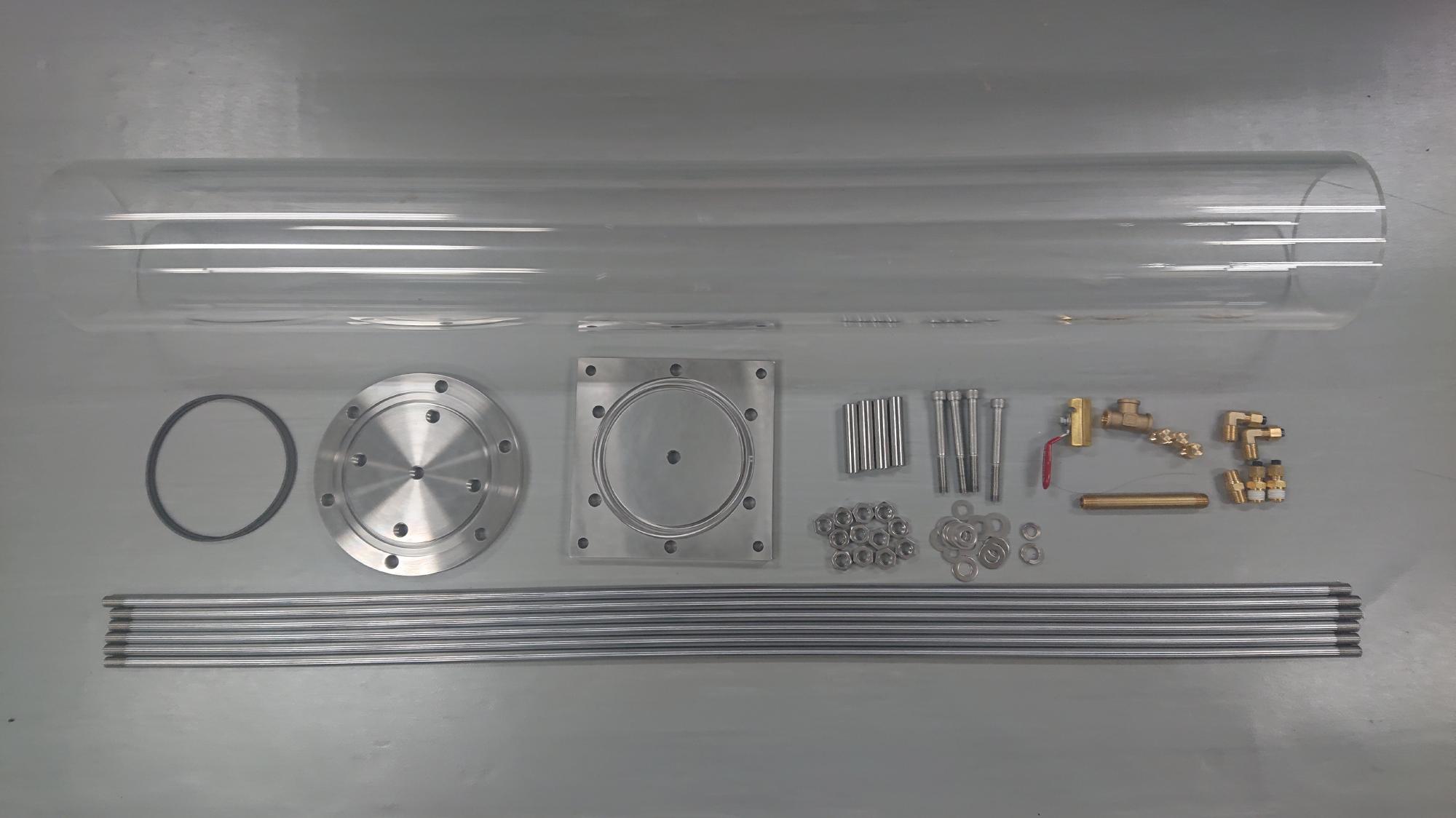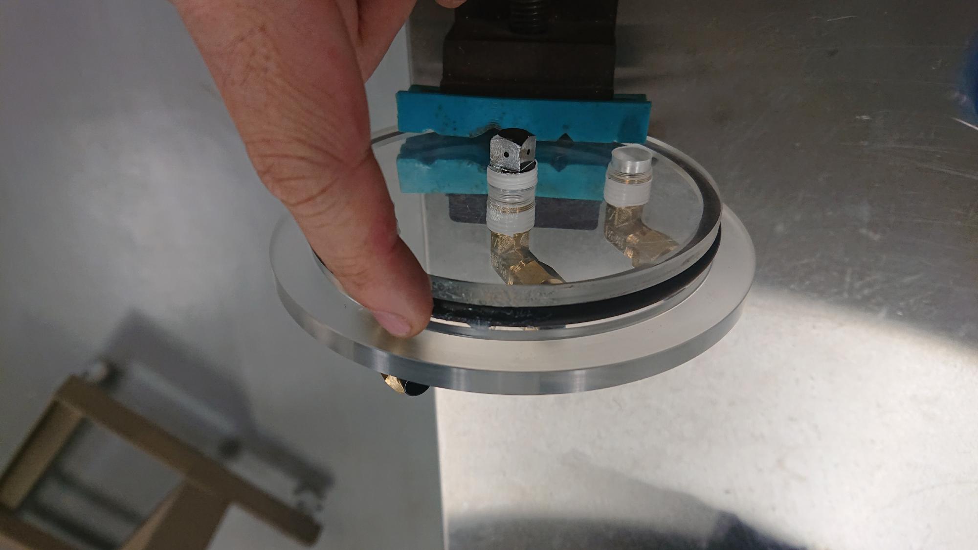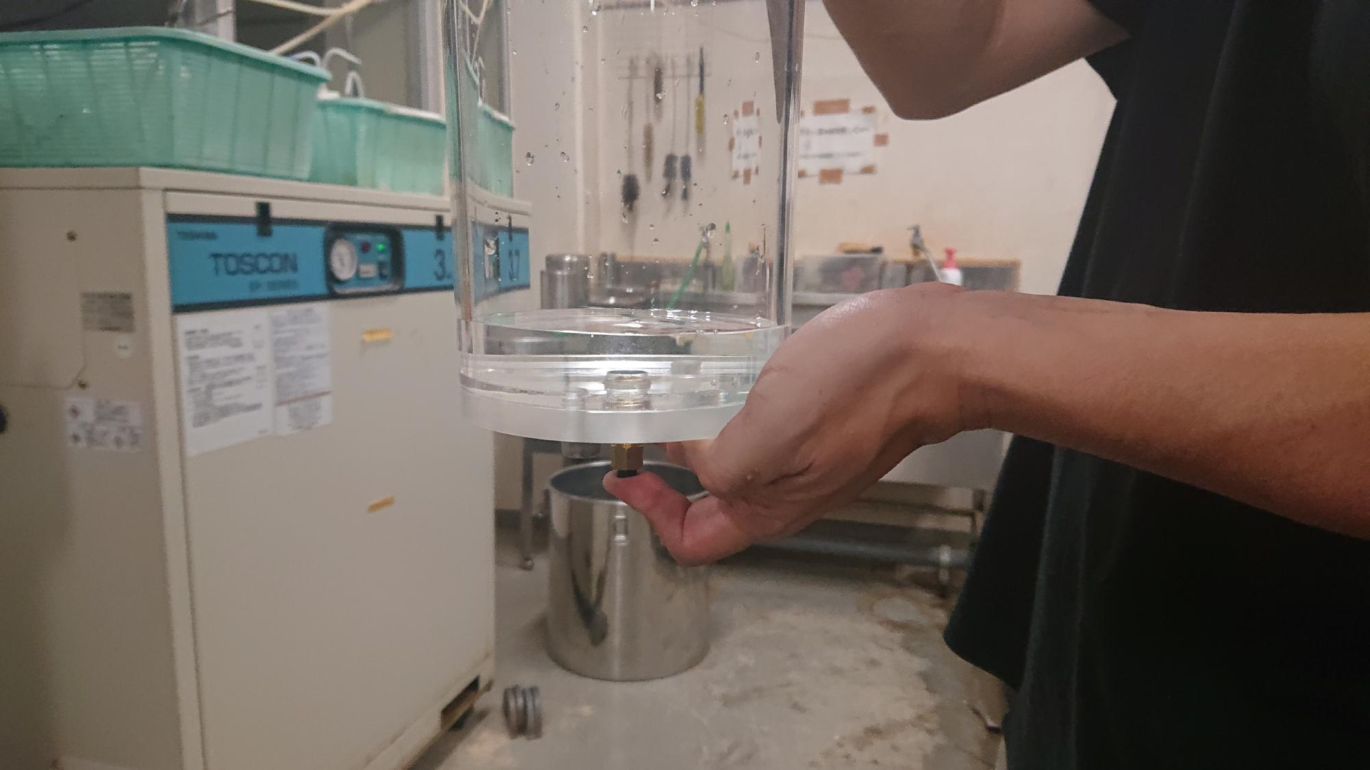 - 水漏れの確認を行い,制御盤上部に真空槽および脱気水槽を取付けた後,真空グリースを塗布したアクリル上板をはめ込みます.