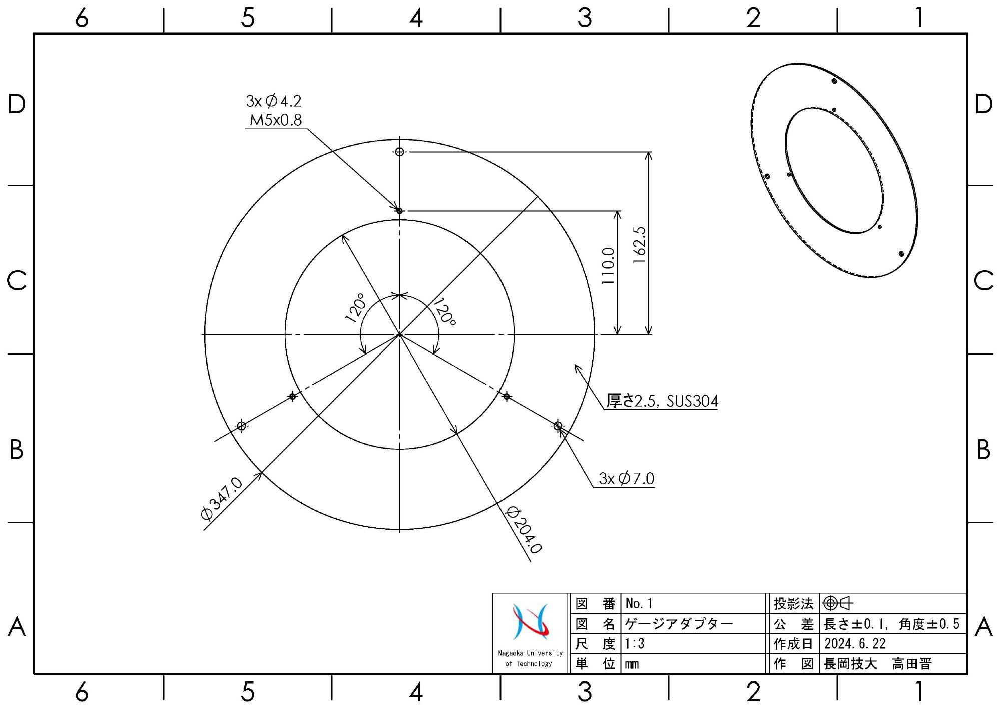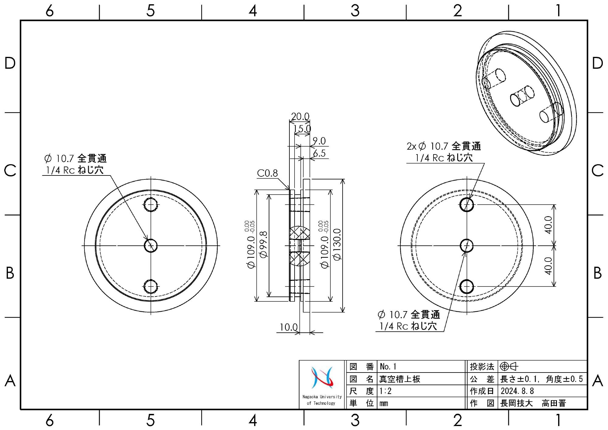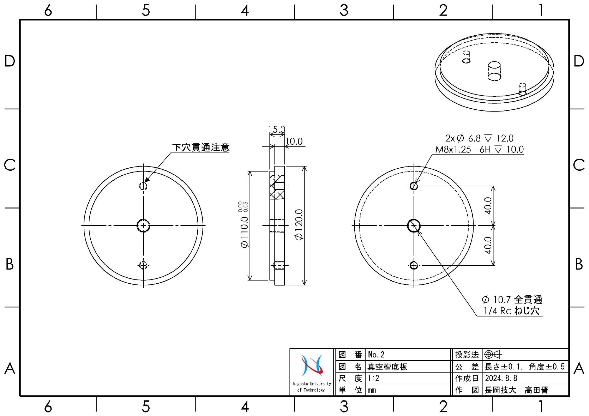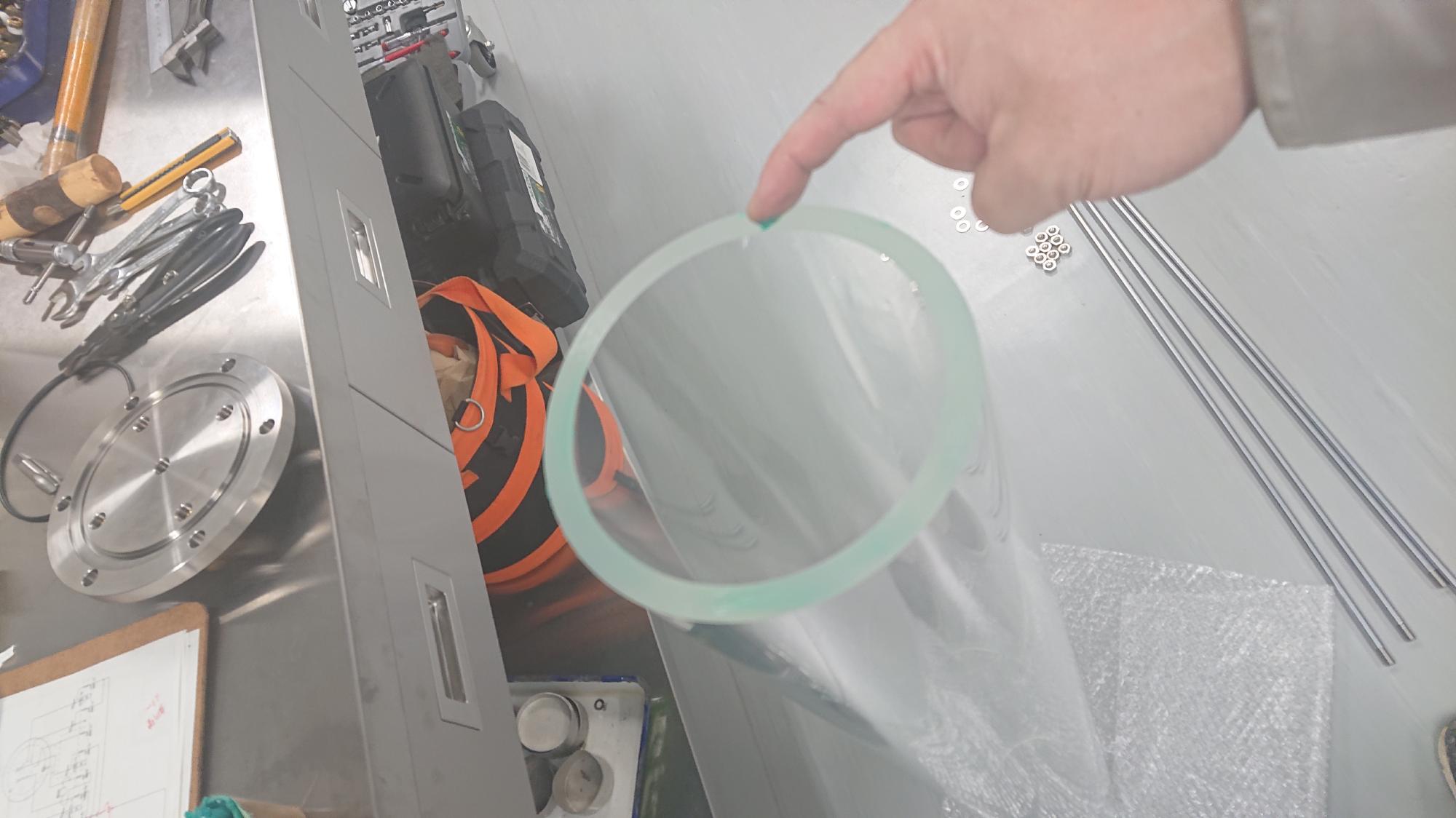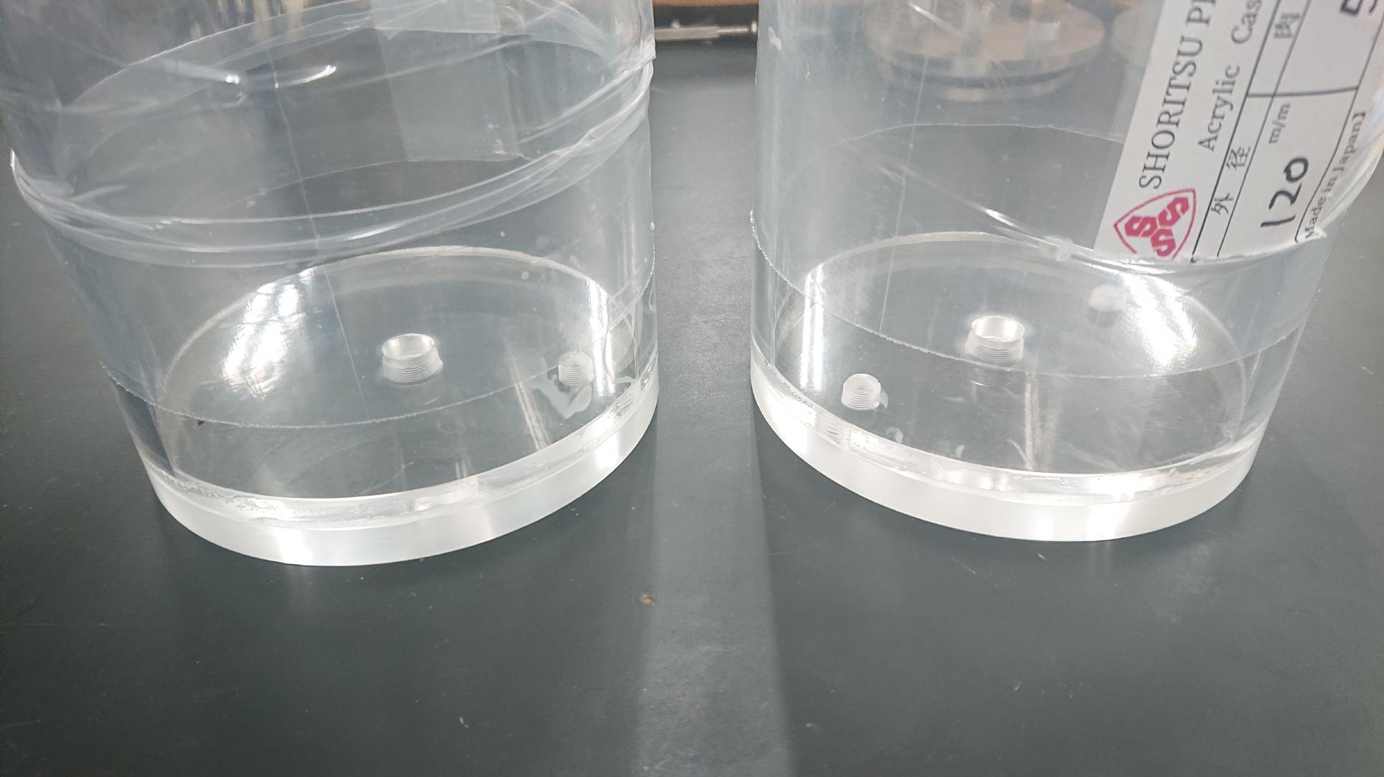 - 真空槽および脱気水槽のパイプ部分は,直径120mm,長さ490mm,厚さ5mmのキャスト材を調達しました.パイプ径が大きく,手持ちの旋盤では端面処理できないので,先端処理は調達と同時に納入業者に行ってもらいました.処理方法は,両面ともにカンナ仕上げです.調達後直ちに,上下端面内径を1/100mm単位で測定して,アクリル上板(蓋部分です)と底板の設計に取り掛かります.