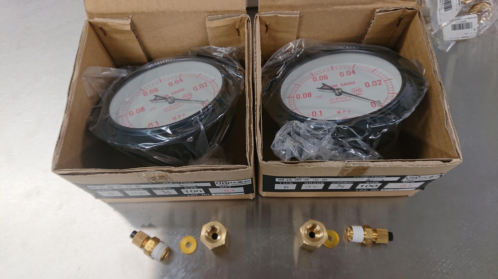 - 真空圧ゲージは,供試体内と供試体外の負圧を確認するためのものです.大きさは100φ,容量は0~-0.1MPa,精度は1.6%F.S(等級),中ツバタイプです.