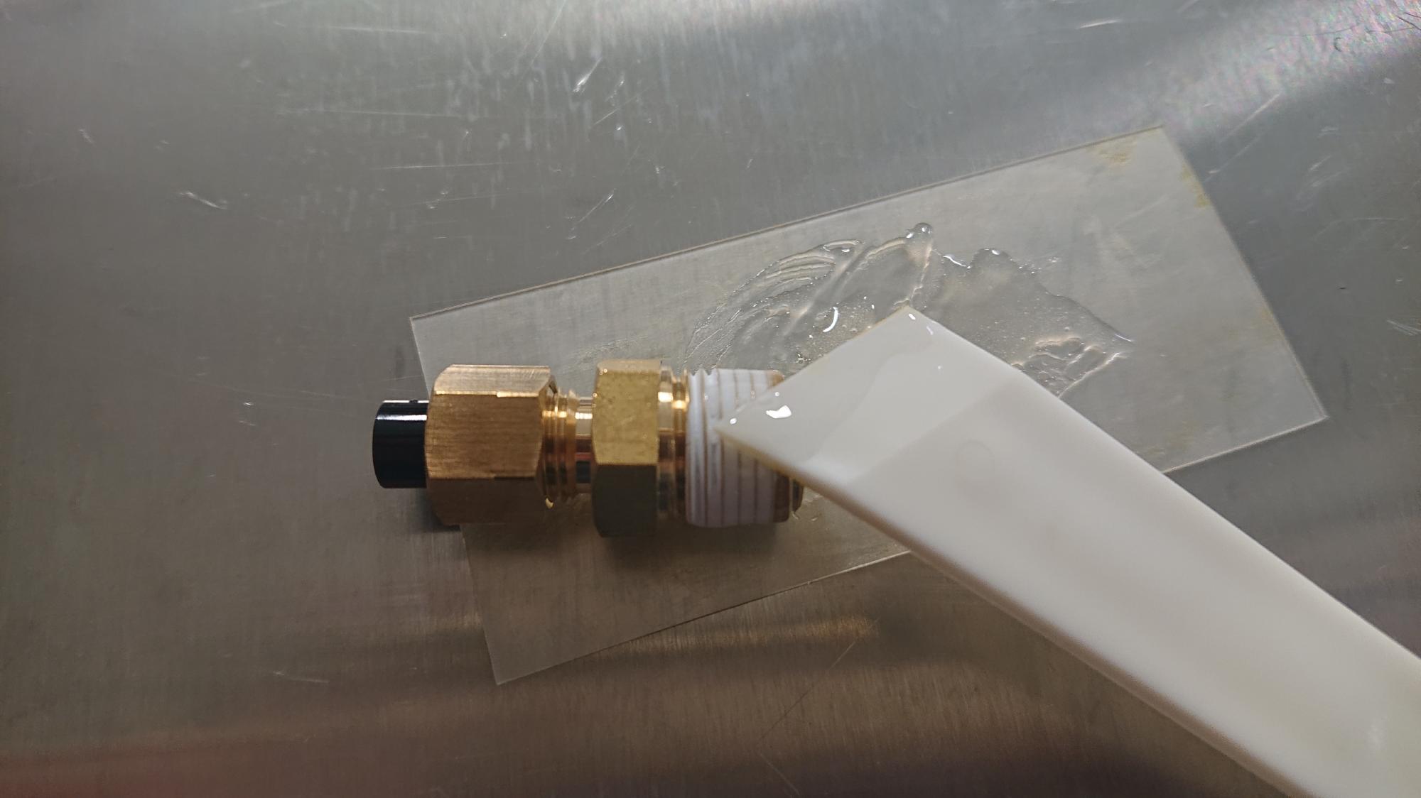 - 下部背圧槽底板には,排水用のバルブ(三方弁)を設置する必要があります.Swagelok製のバルブは気密性,耐久性,使用性が高いので重宝しますが,NPTねじしかラインナップしていません.チューブ継手をSwagelok製のフェルールタイプのものにすればどうでも良いことですが,今回は,コストダウンを目的に,スリーブ式のものを取付けます.取り付ける際は,NPT1/4めすねじにR1/4を無理やりねじ込むことは可能ですが,シールテープが効かないので,代わりに二液性の接着剤を塗布してネジかみ合わせ部の隙間を埋める処理を行います.接着剤は継手を組み込んだ時にムニュっと盛り上がる(図80)くらいたっぷりと塗布すると良いです.