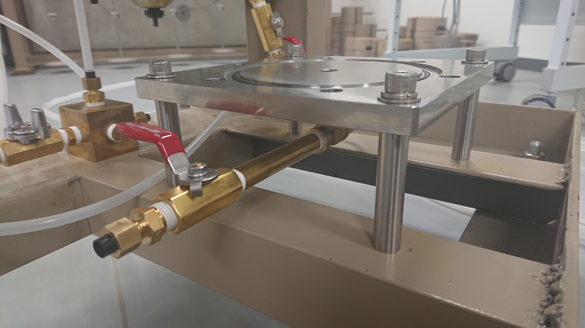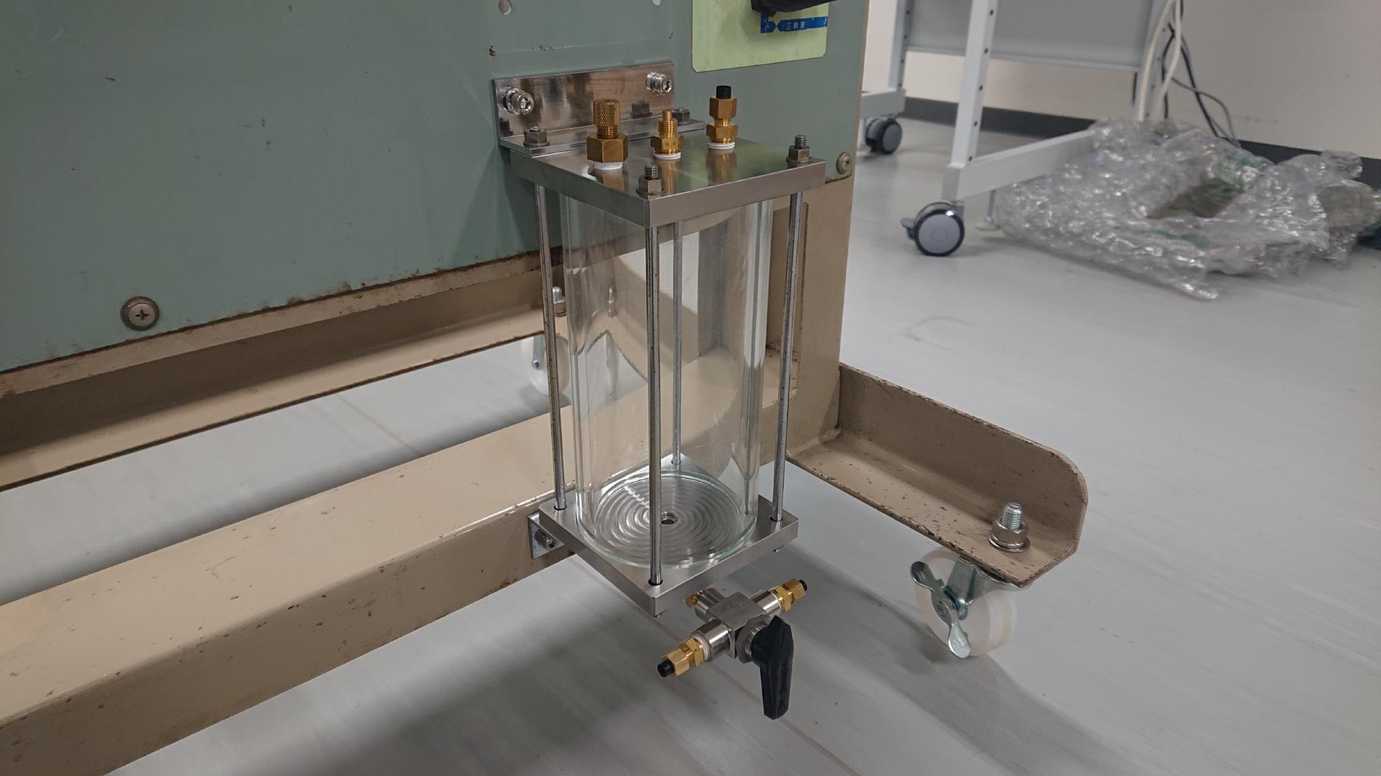 - 下部背圧槽は,二重負圧下で供試体内を通水飽和する際,供試体上端から下端に向けて通過した水が排水される場所になります.また,脱水過程(加圧板法による不飽和化)では,関連するバルブを切り替えて,ここから正圧を供試体上部に載荷することになります.つまり,真空圧と正圧が載荷される場所になるので,漏気や水漏れが無いように正確な組立,設置作業が求められます.