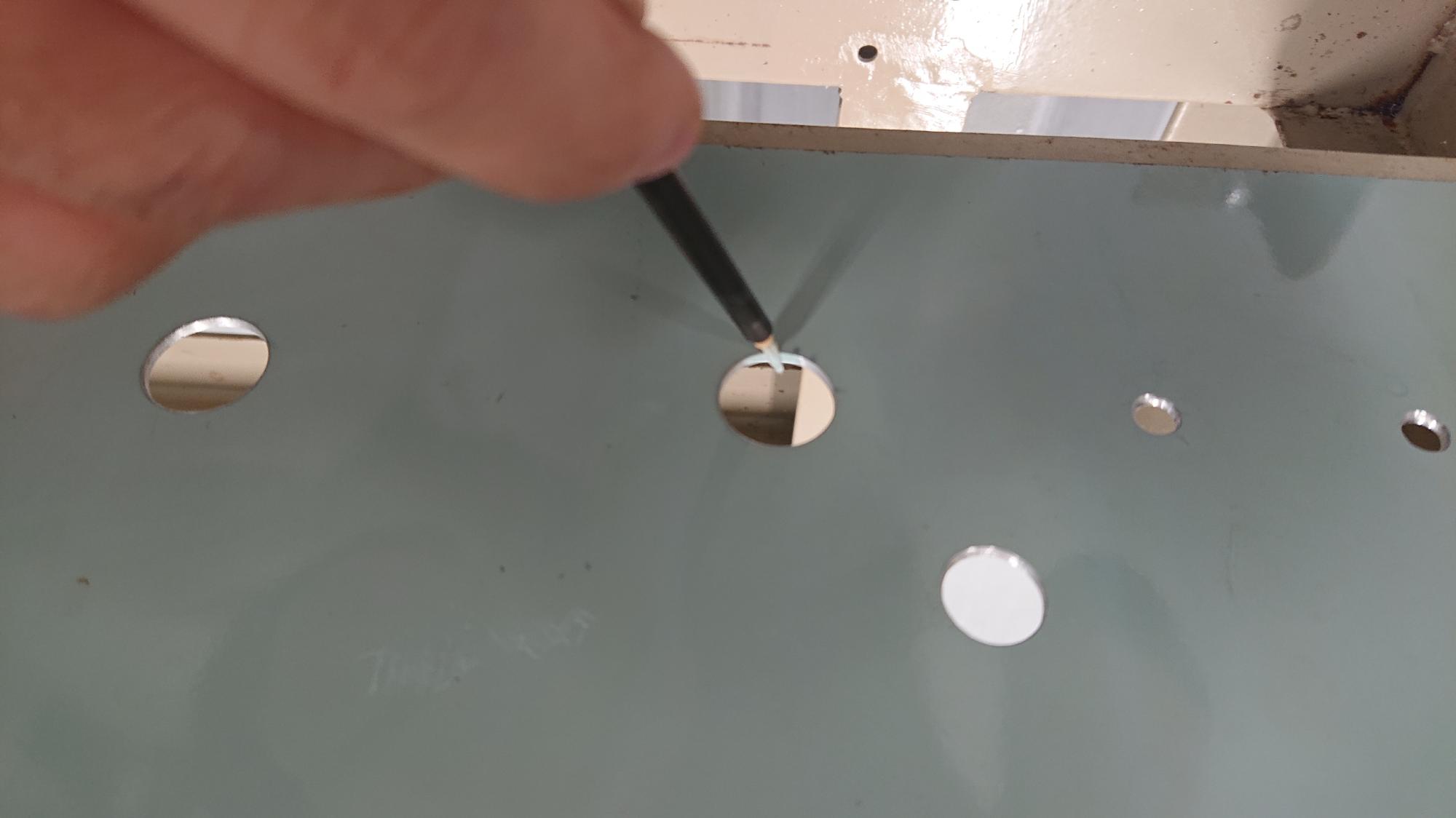 - アクリル底板は,パイプ内に接着固定する関係で,はめあいギリギリの寸法かつマイナス公差で設計(図47)します.接着は,図51のように,アクリル専用の接着剤を用いて全周に行き渡るように塗布します.さらさらな液体なので,塗布というよりは,流し込むイメージです.はじめは,思いのほか多くの接着剤が流れてポタポタになるので,かなり焦りました.適当な端材を用いて練習することをお薦めします.問題は,この接着剤の揮発速度が爆速なので,短時間で作業しなければならないことです.接着剤がはみ出た所は,完全に乾いた状態で,3000番の紙やすりとプラスチック用コンパウンドでキレイに除去できます.