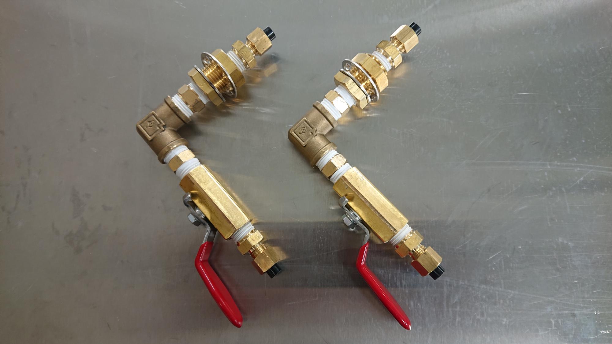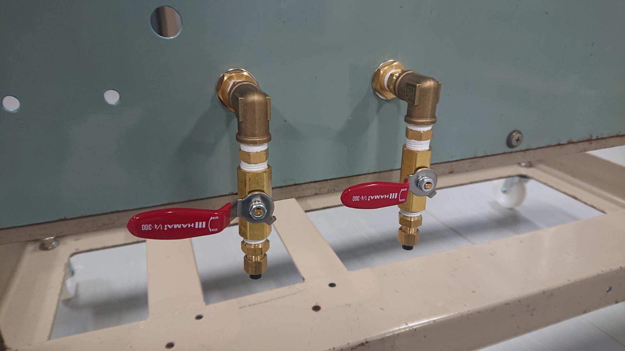 - 図89は給排水径路を制御盤に取り付けた様子です.左側が真空槽に誤って逆流した水を排水するための口,右側が脱気水槽に蒸留水を給水する口になります.ちなみに,両者ともに見た目が一緒ですが,給水は真空ポンプを用いて吸い込む仕様なので,口元はストップバルブ程度で済んでしまいます.写真では同じレバー式のバルブを配置してありますが,この後,エアーフィルターを設置した時にハンドルが干渉したので,左側のみ別のものに変更しておきました.