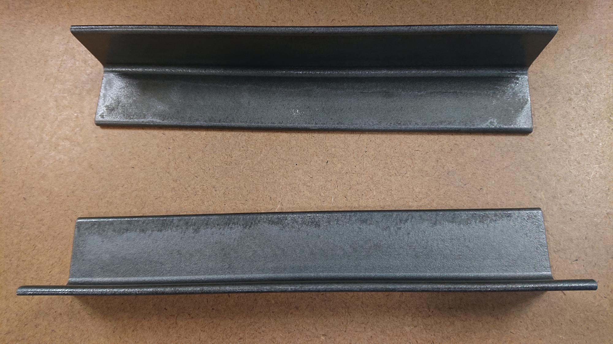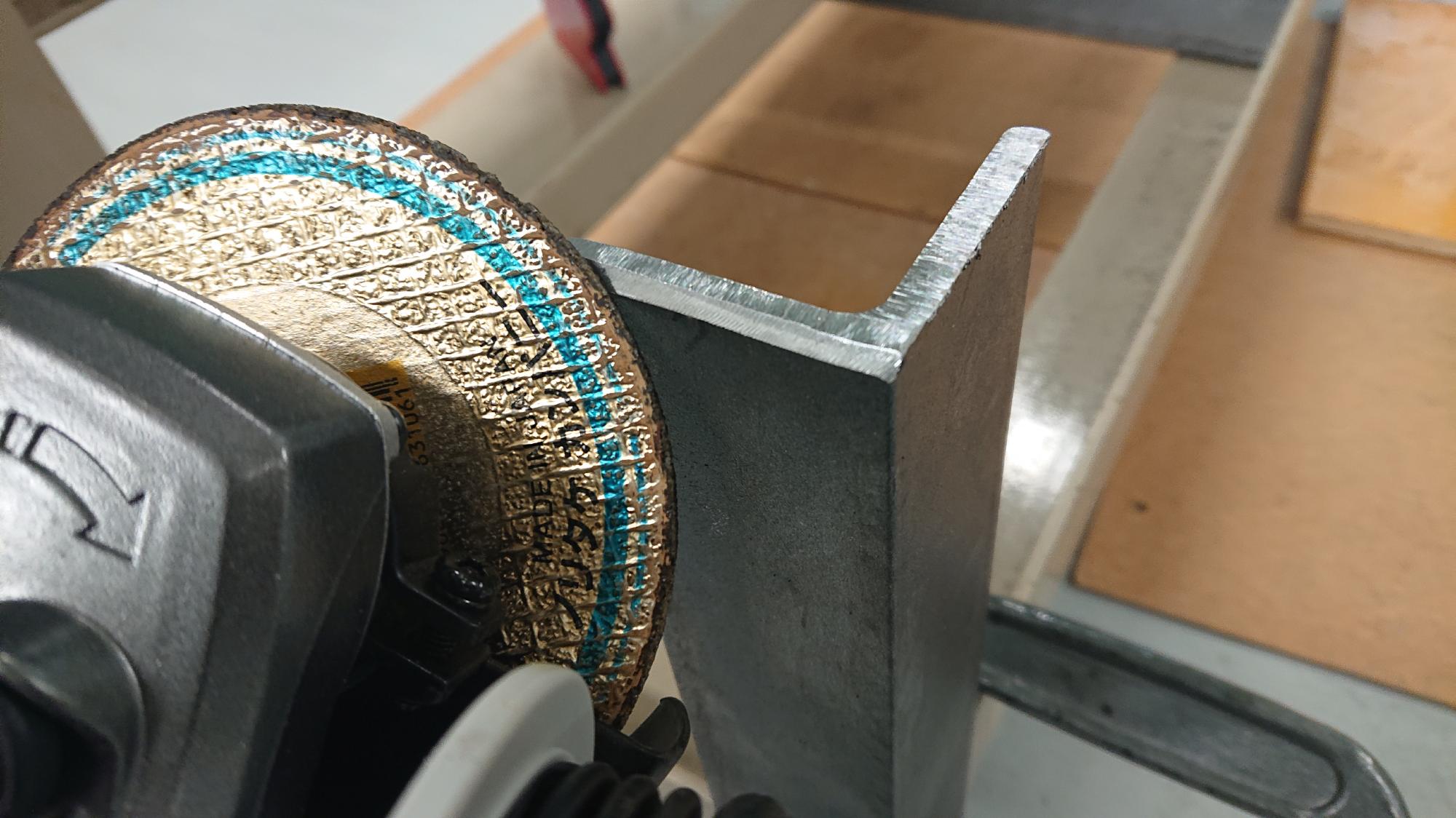 - 取付用ブラケットは,L50x50x6-296のSS400材L型鋼(ノコ切断)を購入し,黒皮のまま用いました.溶接個所は黒皮をグラインダーで剥いだ後,制御盤に合わせながら長さを調整し,図111のように溶接しろ部分の切り欠き加工を行いました.最後に,防錆油やグラインダーでの研磨で付着したダストを落とすため,パーツクリーナーで掃除しました.