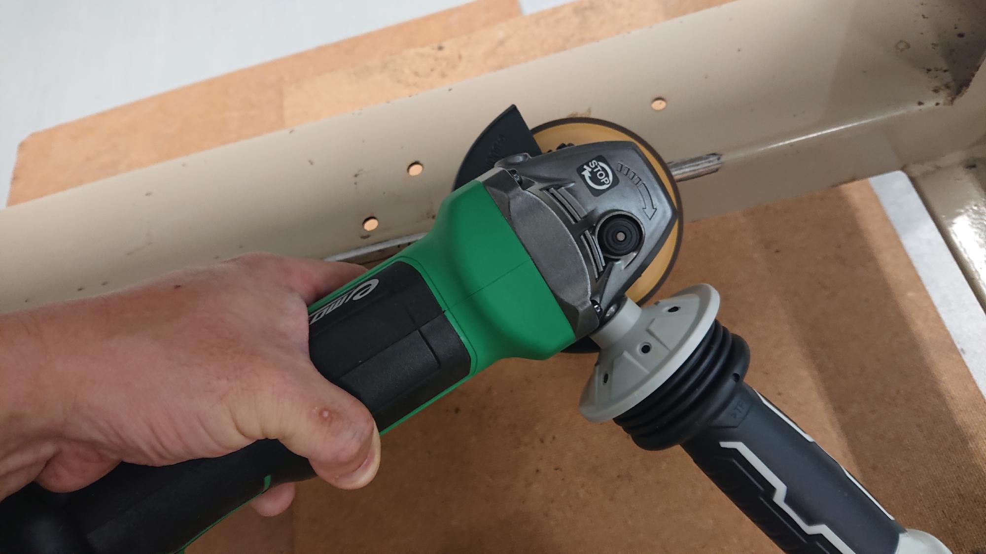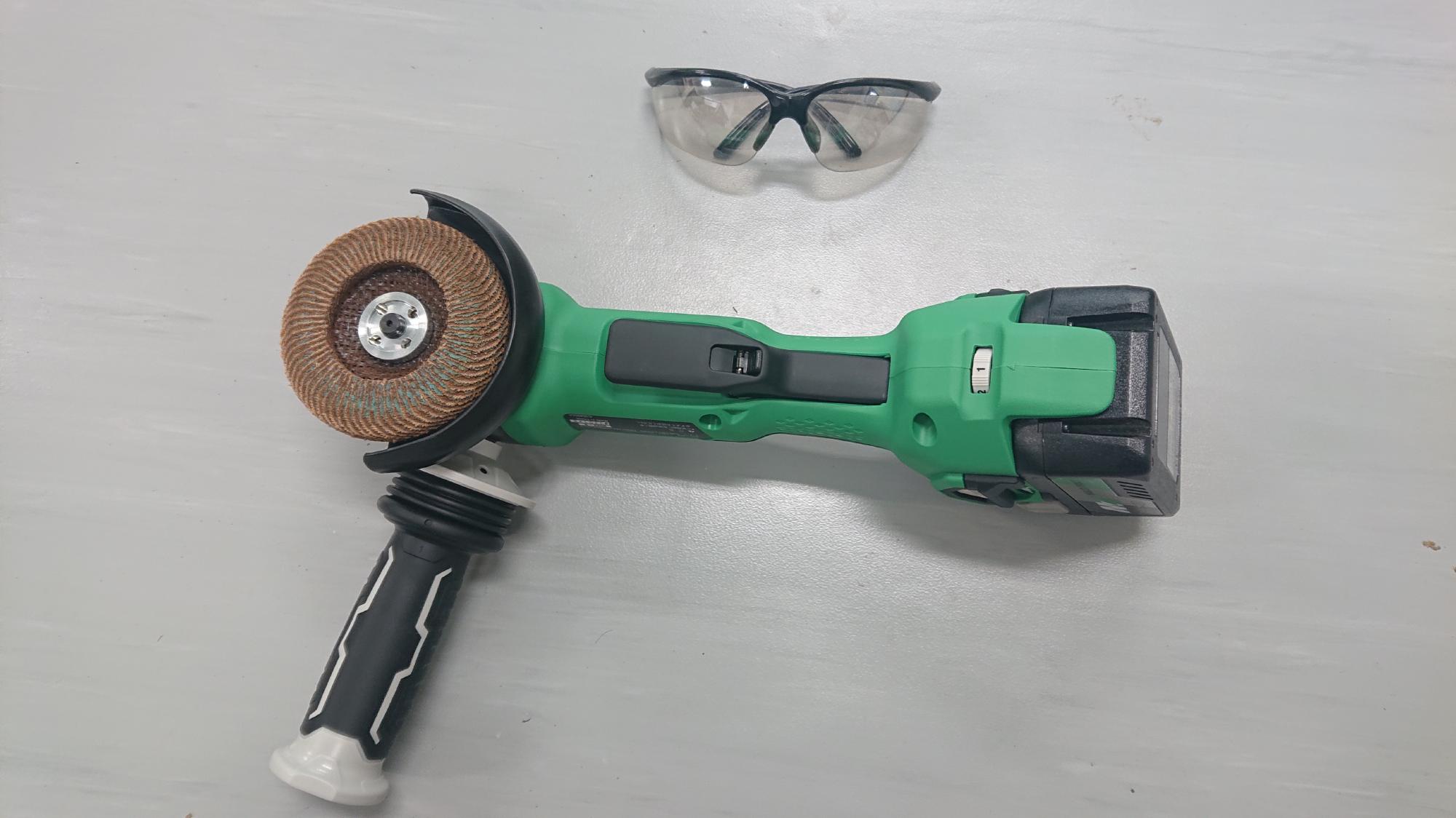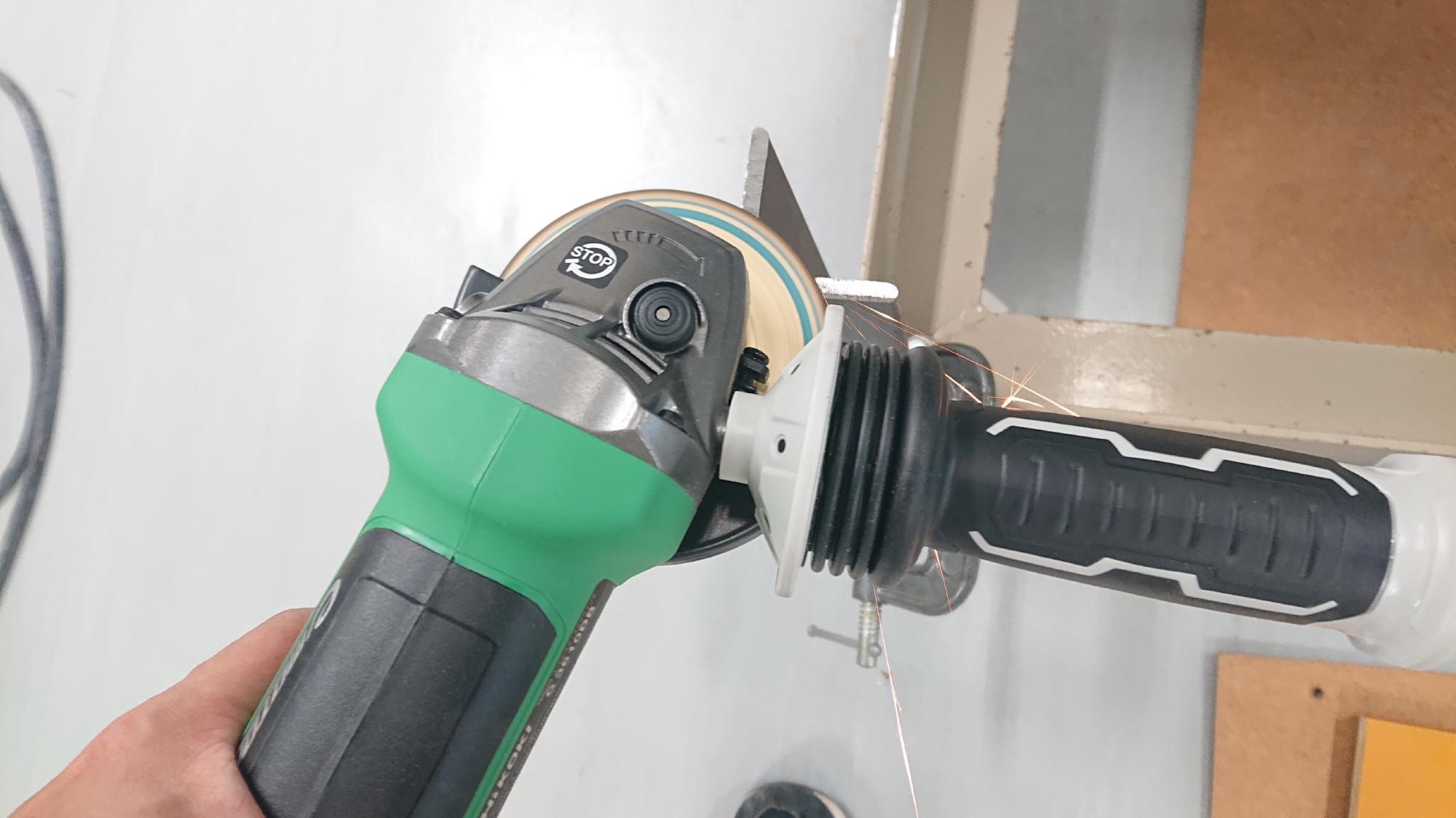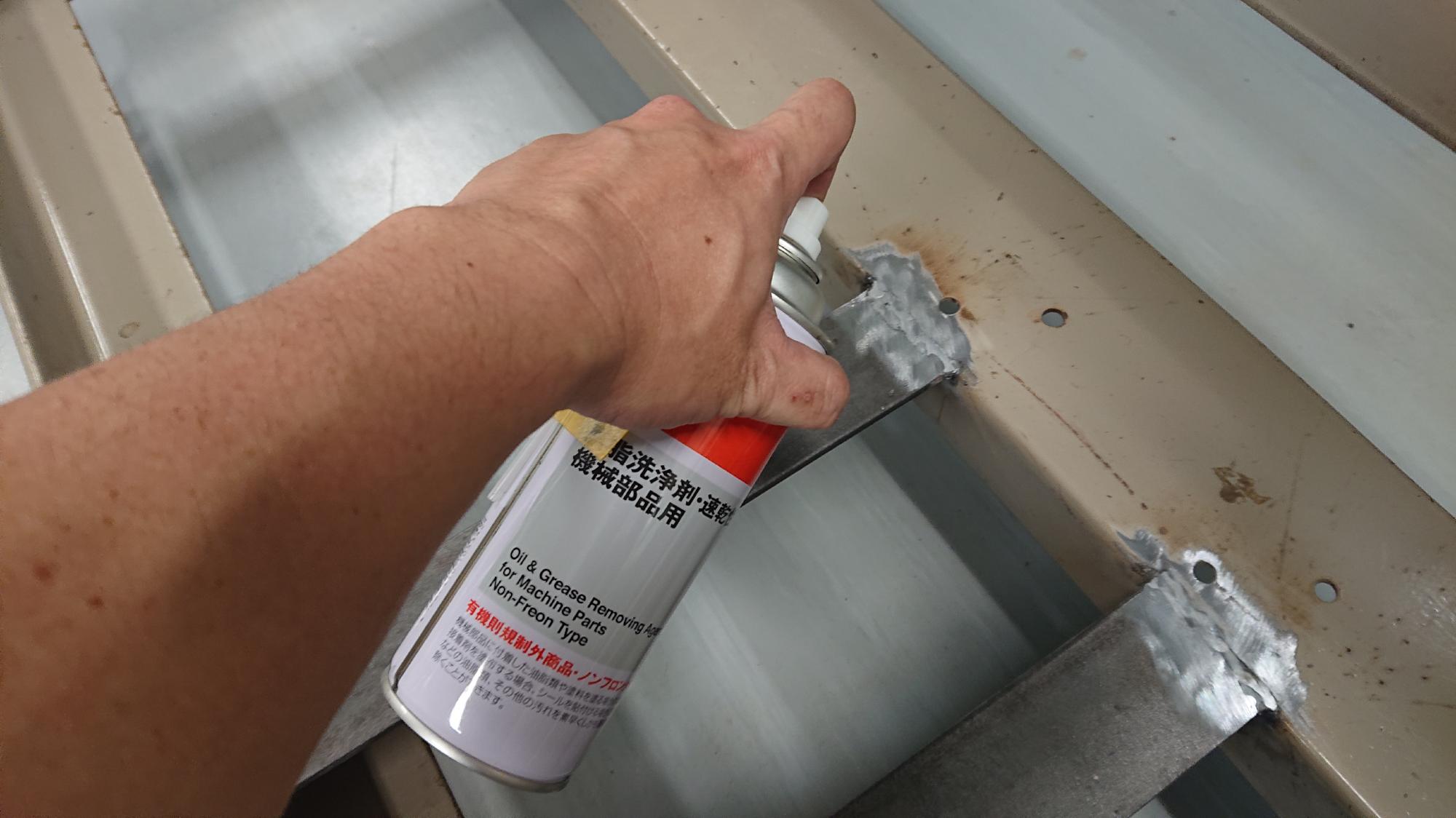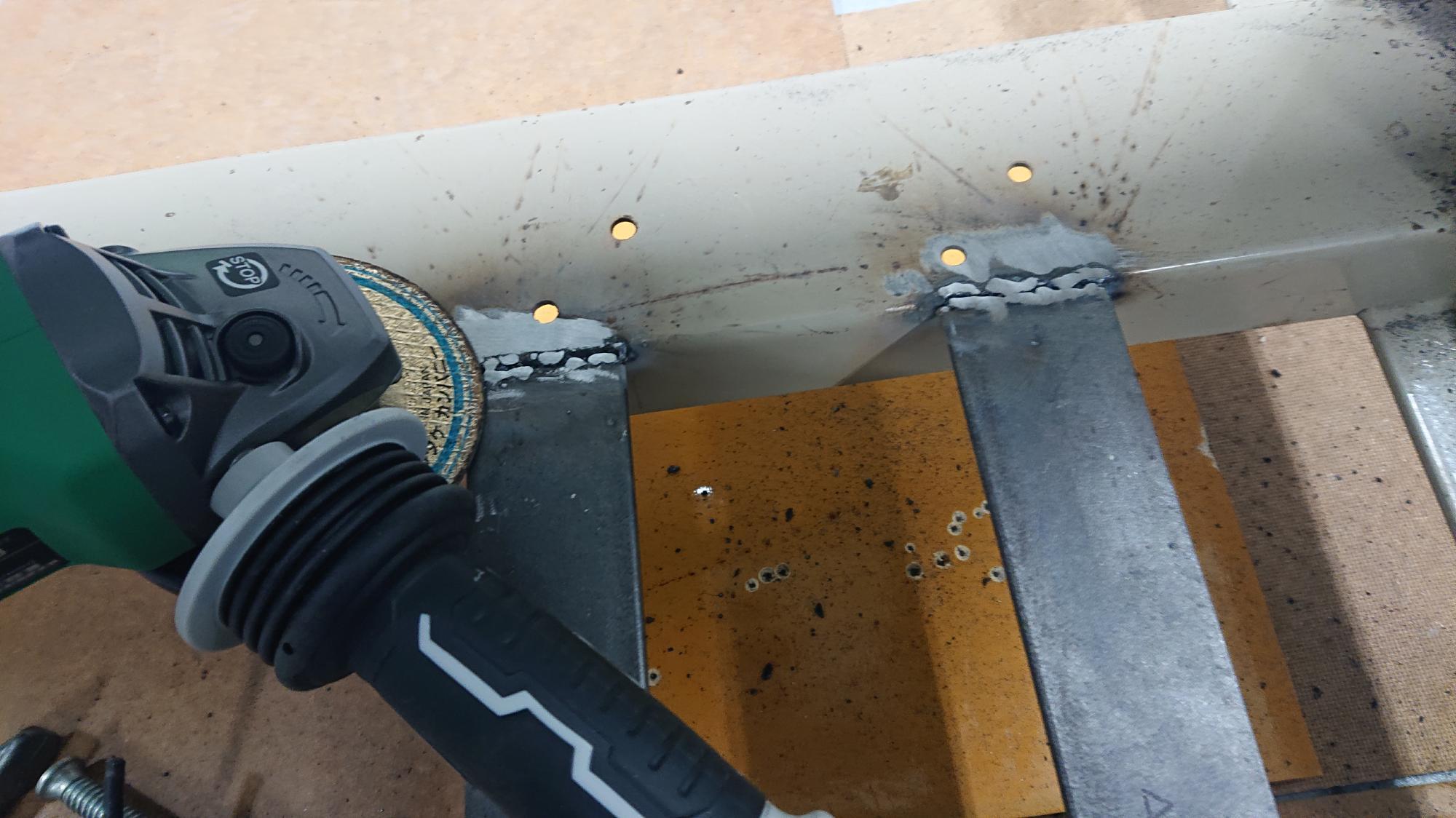 - 制御盤の溶接個所は,取付箇所よりも少し大きい範囲を,グラインダーで研磨し,溶接しやすいように塗装を予め除去しました.また,スパーク不良にならないように,アーク溶接用のマイナスアース部分も同様に行いました.