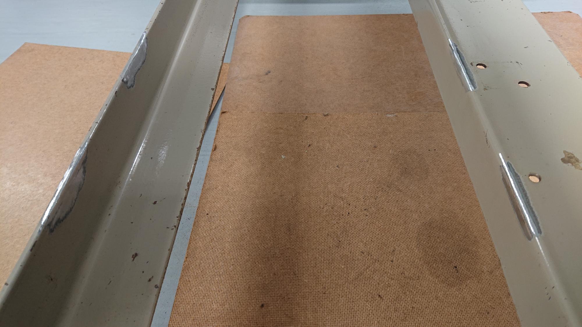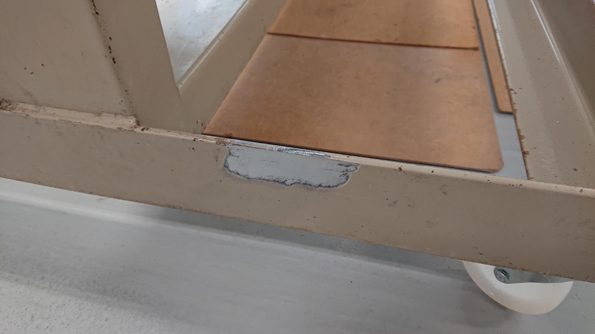 - L型鋼と制御盤フレームの溶接部が図115のように凸凹になったので,パテ埋めを行いました.そもそも,日常の溶接作業頻度が極端に少ないため,相変わらずへたくそなのですが,プロのようなキレイなビードができません.スパッタが飛びまくって凸凹に必ずなります.制御盤フレーム側の肉厚が薄いので,ビビッて溶棒を早めに送ってしまうことが原因です.こればっかりは経験ですかね.