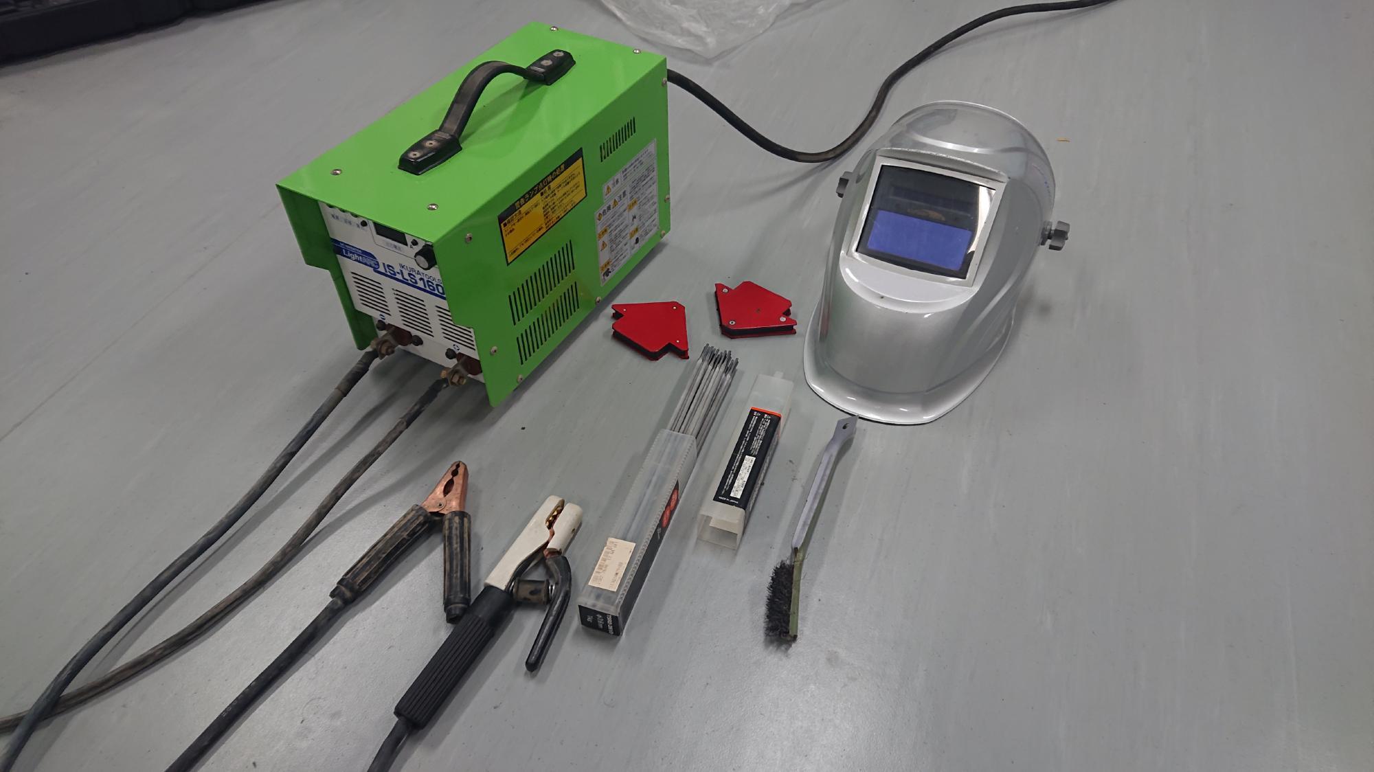 - アーク溶接時はスパッタが飛び散りますので,合板等で広範囲に養生することをお薦め致します.床が少し焼けました・・・.ちなみに,溶接面は,被ったままで溶接前に手元がはっきり見える自動遮光型を用いてます.スパーク時に自動で遮光してくれる優れものです.