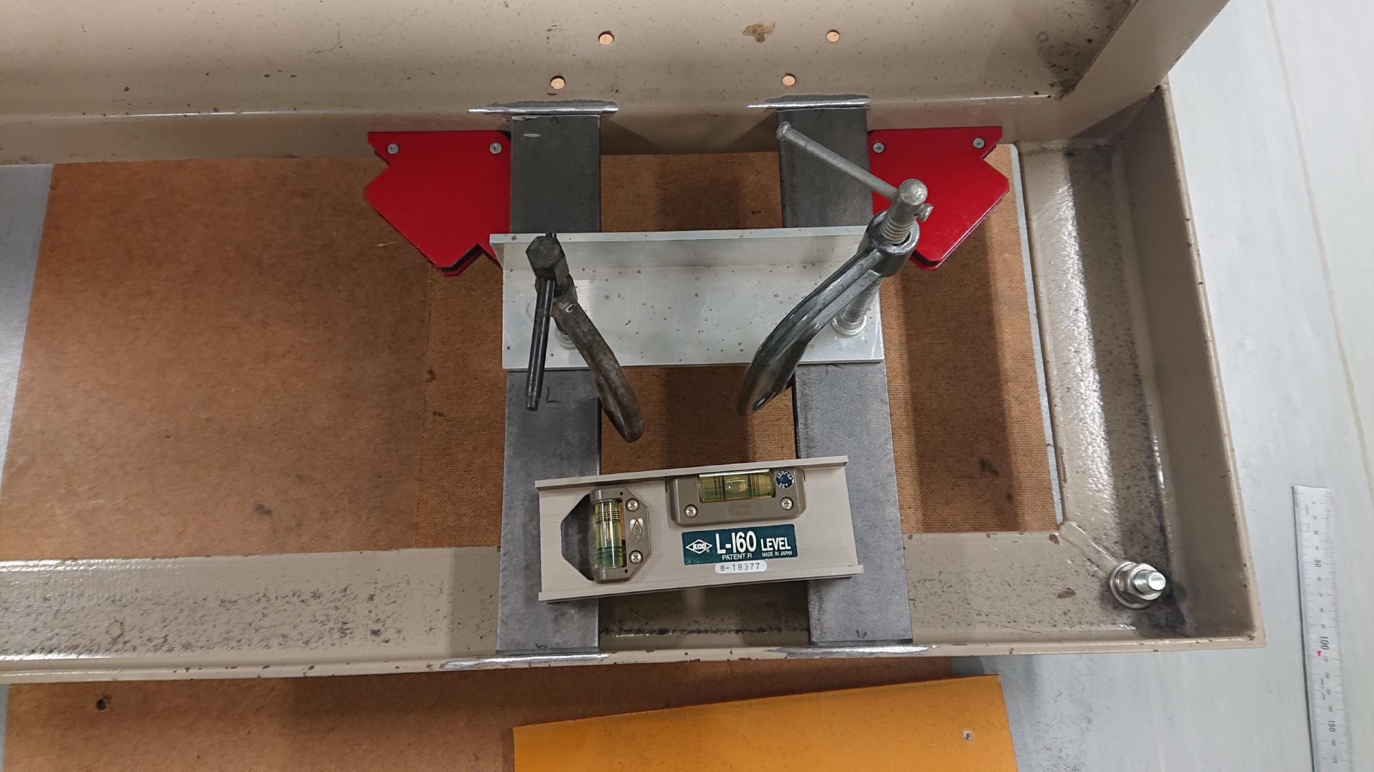 - L型鋼の仮止めは,溶接用マグネットホルダー(図113赤色の部品),適当なアルミアングルおよびシャコ万力を用いて行いました.仮止め後は,水平器で水平を確認しながら微調整を行いながら据付を行いました.