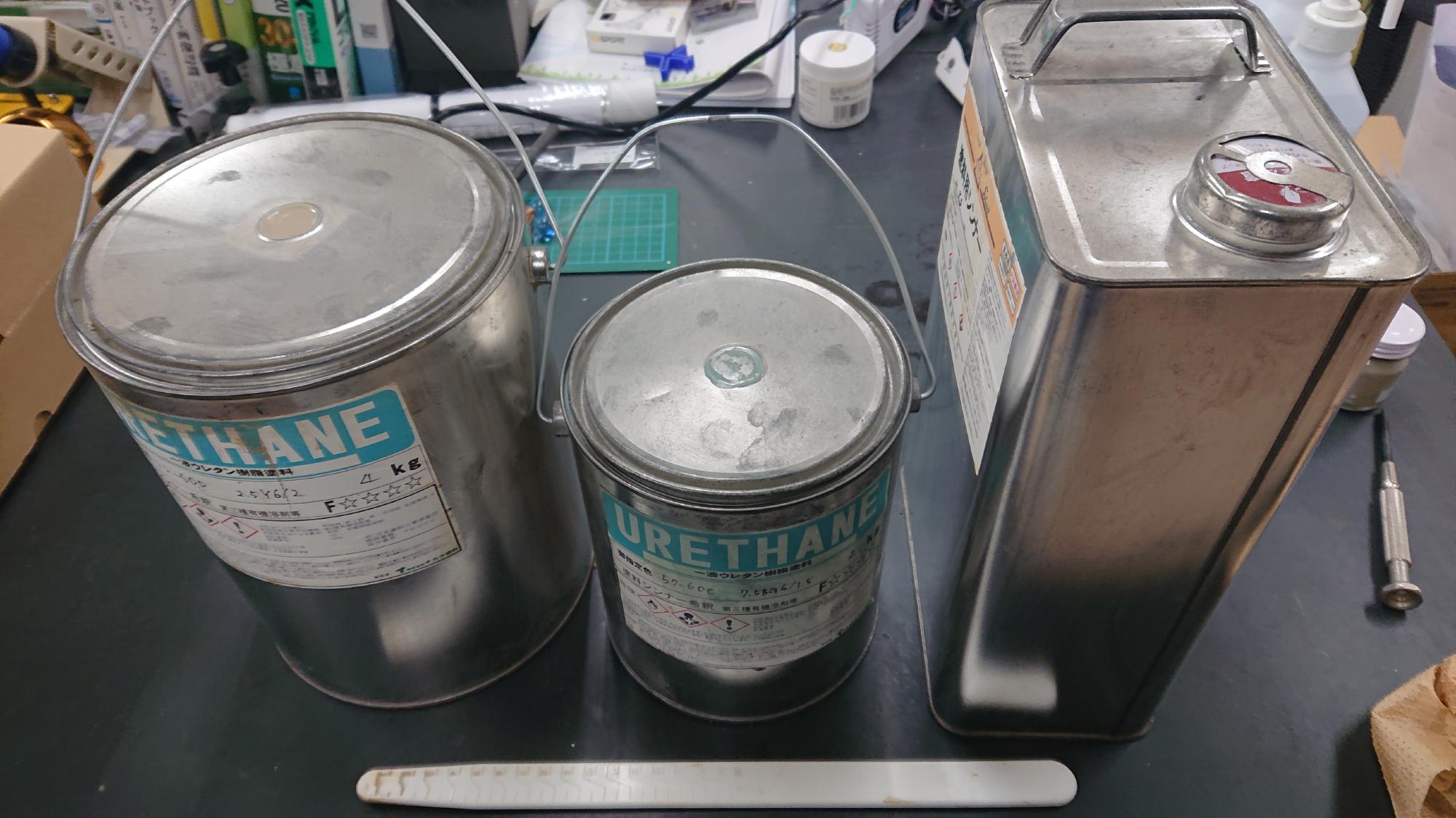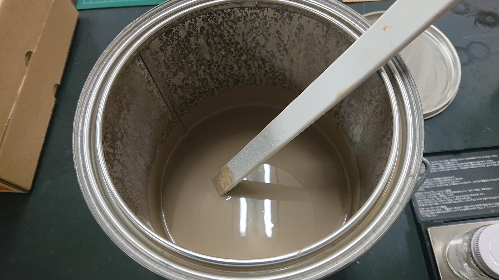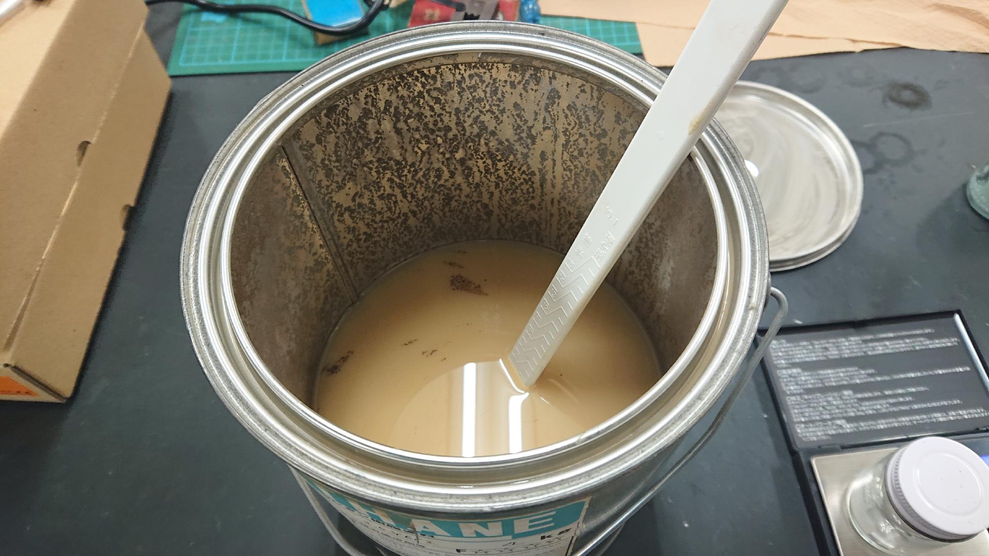 - 塗料に関する情報は前述 [LINK] の通りで,同様に一液性ウレタン製のものを使用しました.制御盤フレーム用塗料の色は,ライトブラウン(マンセル値2.5Y6/2)に近いものを選択しています.しばらく置いておいた影響で,塗料が図118のように盛大に分離しており,色味がおかしくなってました.そこで,樹脂製の撹拌棒でグルグルかき混ぜました.その結果,本来の色に戻りましたので,小瓶に移してから筆塗を想定して薄め液を加えました.