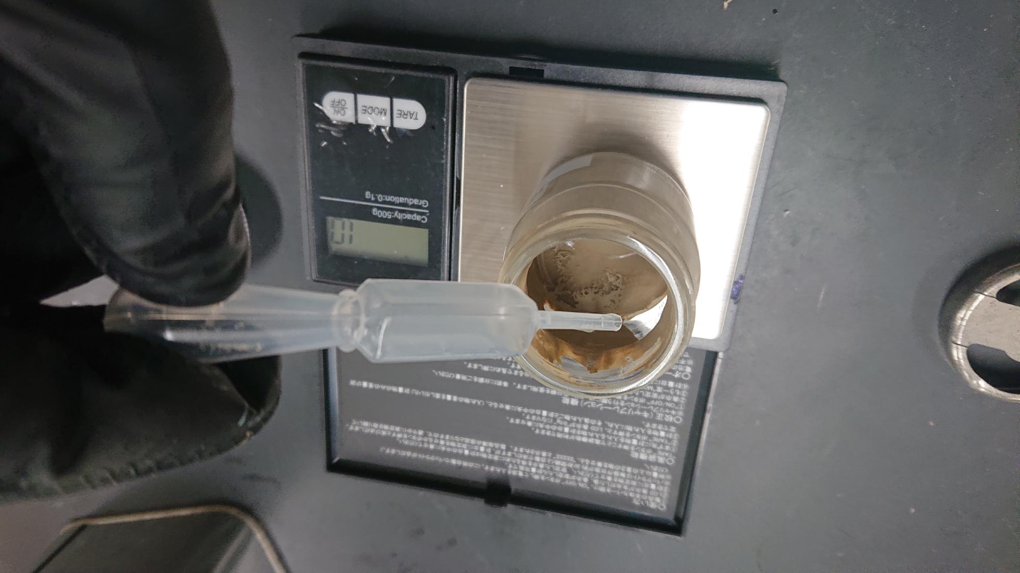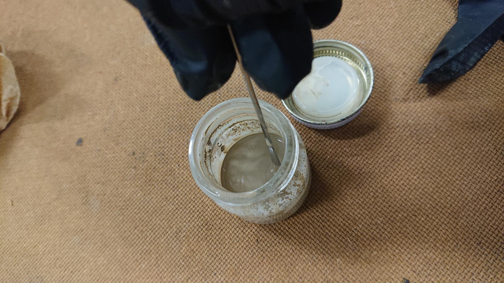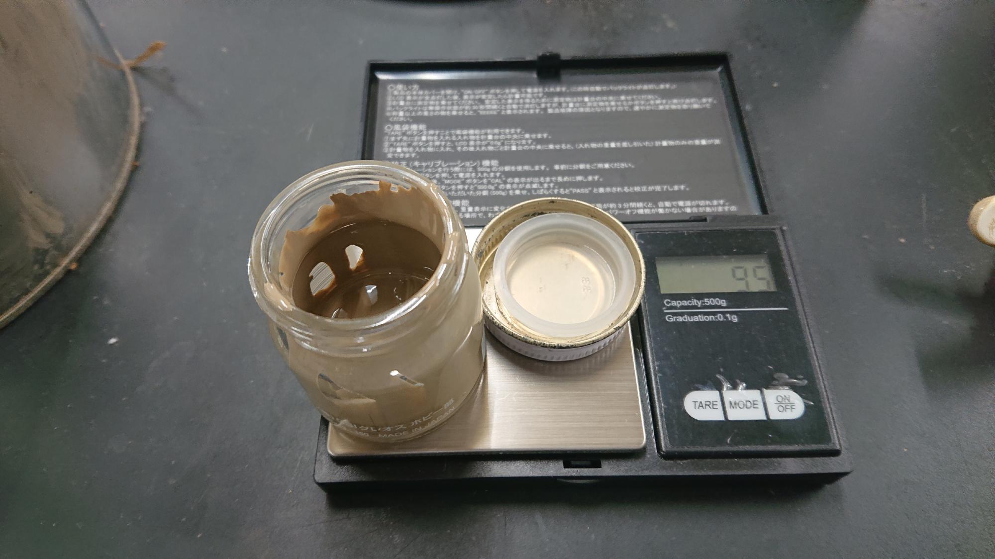 - 塗料に関する情報は前述 [LINK] の通りで,同様に一液性ウレタン製のものを使用しました.制御盤フレーム用塗料の色は,ライトブラウン(マンセル値2.5Y6/2)に近いものを選択しています.しばらく置いておいた影響で,塗料が図118のように盛大に分離しており,色味がおかしくなってました.そこで,樹脂製の撹拌棒でグルグルかき混ぜました.その結果,本来の色に戻りましたので,小瓶に移してから筆塗を想定して薄め液を加えました.