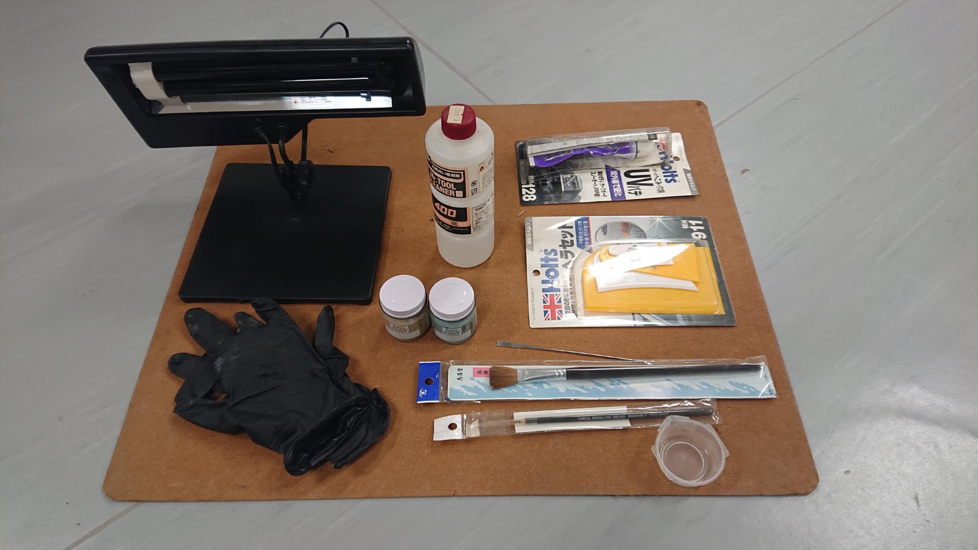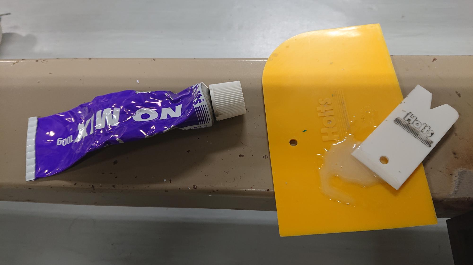 - 使用したパテは自動車板金用のものです.光硬化パテは,少ないですが,ひけが発生するので,多めに盛ることが良いです.盛る厚みが大きい場合は,複数回に分けてパテ埋めしないと硬化不良が起きますので,注意が必要です.なお,作業中はくれぐれも紫外線を直視しないようにしなければなりません.このパテは,硬化後の表面が少しべたつきますので,脱脂スプレーやラッカー系塗料用薄め液で拭き取れば,これを除去することができます.べたつきの除去後にグラインダーで表面を均して塗装すれば完成です.