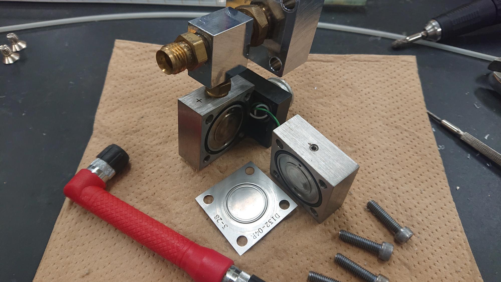 - Validyne社製差圧計のダイヤフラム(3-28)もまたとてもキレイな状態でしたので,そのまま使用することとしました.ちなみに,ビュレットの水頭が40cm程度ですので,最大容量±5.5kPaのダイヤフラムを使用しています.