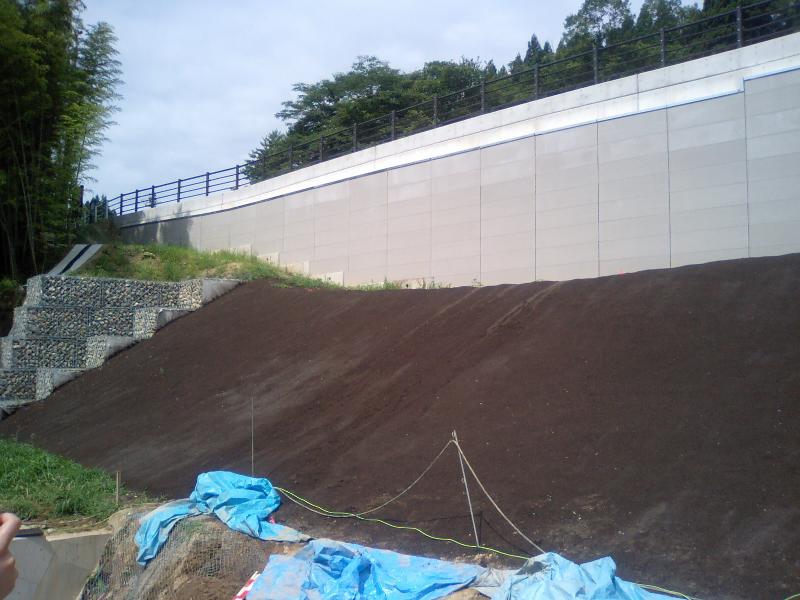 - 中越沖地震で大規模な斜面崩壊(被災状況はこちら)が発生し,道路が流されたこの現場の本復旧を見学しました.道路本体は,軽量盛土工法の一種であるEPS工法が採用されておりました.見学当日は盛土工事が完了した後だったため,盛土前面に設置された化粧パネルしか見ることができませんでした.その他,一部河道閉塞した黒川の護岸工および植生工が施されており,道路法面を保護する工事がなされておりました.数ある