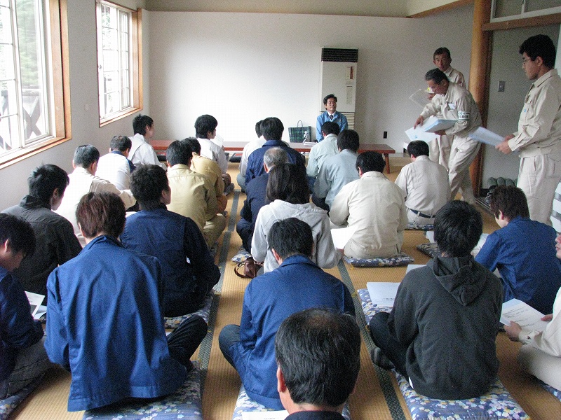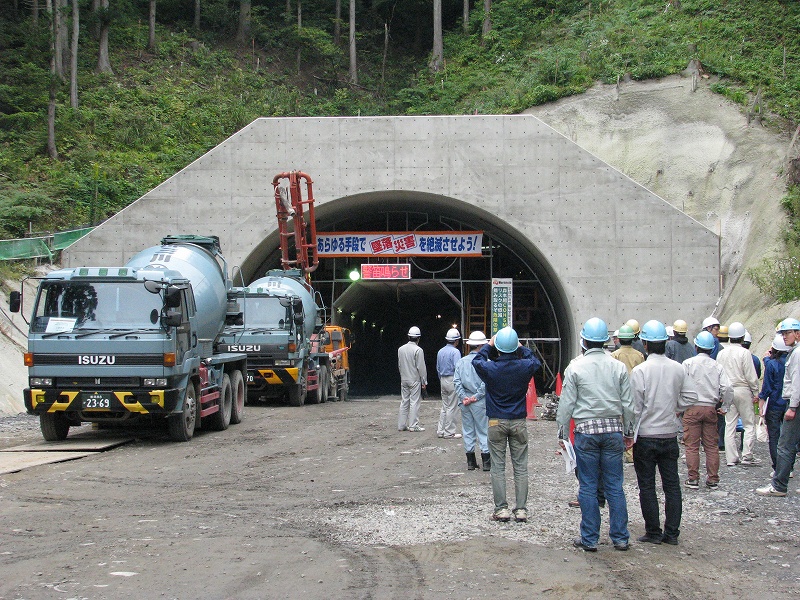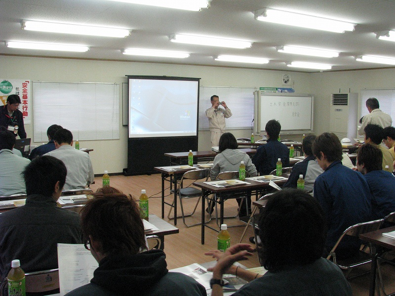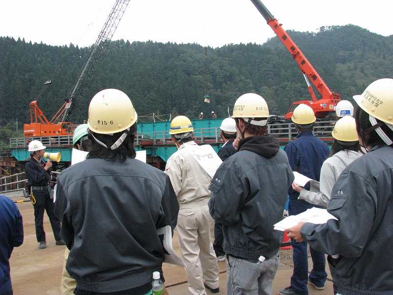 一同は仮設事務所内で一通り事業計画の説明を受けた後,工法に関するDVDを閲覧し,これから着工される揚川橋(PC3径間連続ラーメン箱桁橋)の工事現場と完成間近の赤岩トンネルを見学しました.