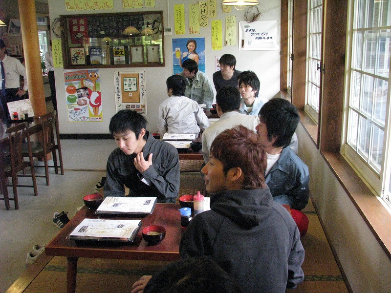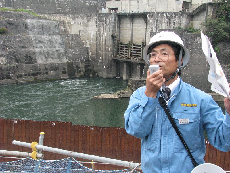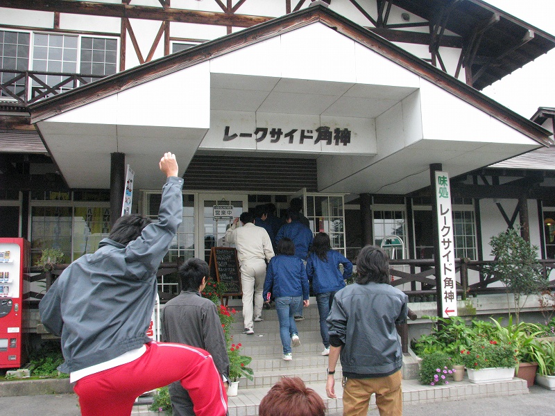 時刻は正午.発電所改修工の現場見学の前に昼食タイムです.こんな山の中に飯を食うところがあるのか?と心配する一同.しかし到着したお食事所「レークサイド角神」は想像以上に立派な佇まいで,お弁当も豪華!!!満腹になったところで次の現場にまいります.