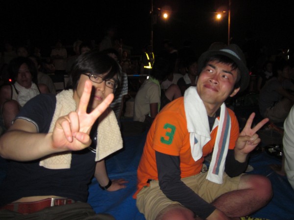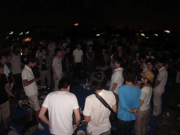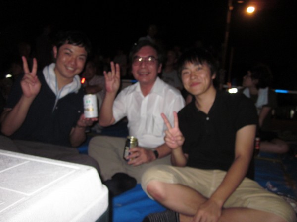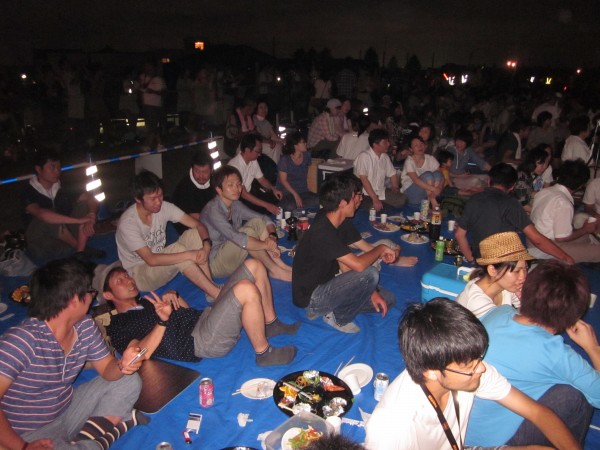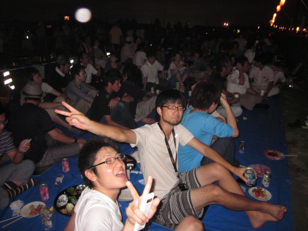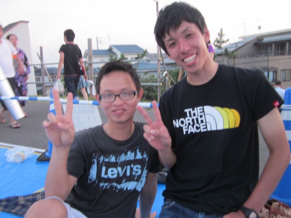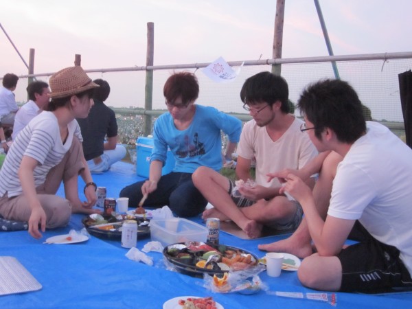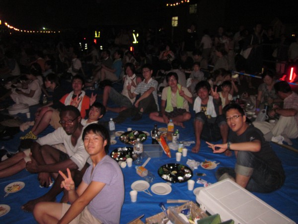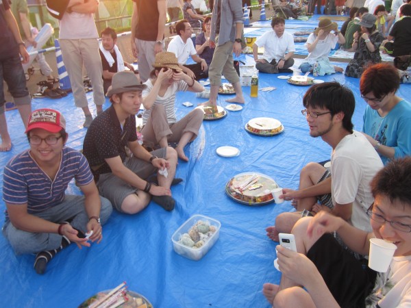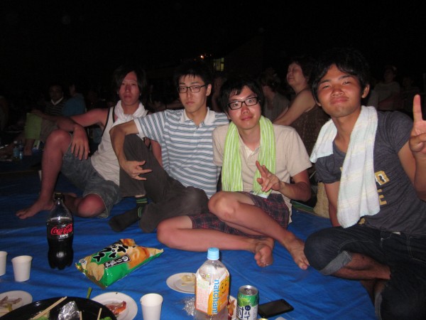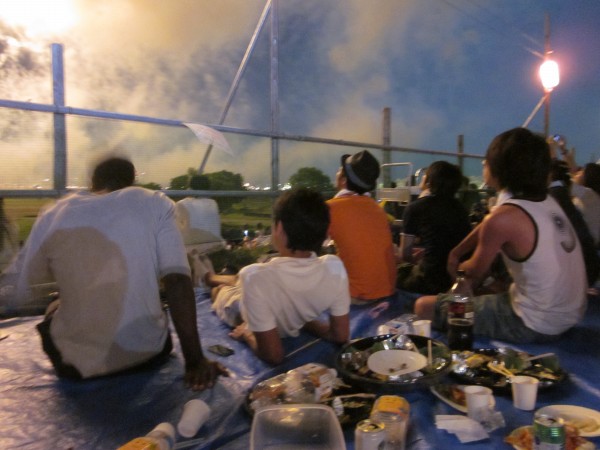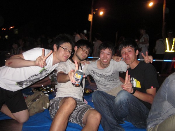 今年も夜班と昼班,おにぎり班に別れ,夜の10時から7時までが夜班.その後昼班と交代しそのまま花火が始まるまで場所取りを行いました.今年は日中35度を超える猛暑日でみんな日焼けで真っ赤になりながら場所取りを行いました.