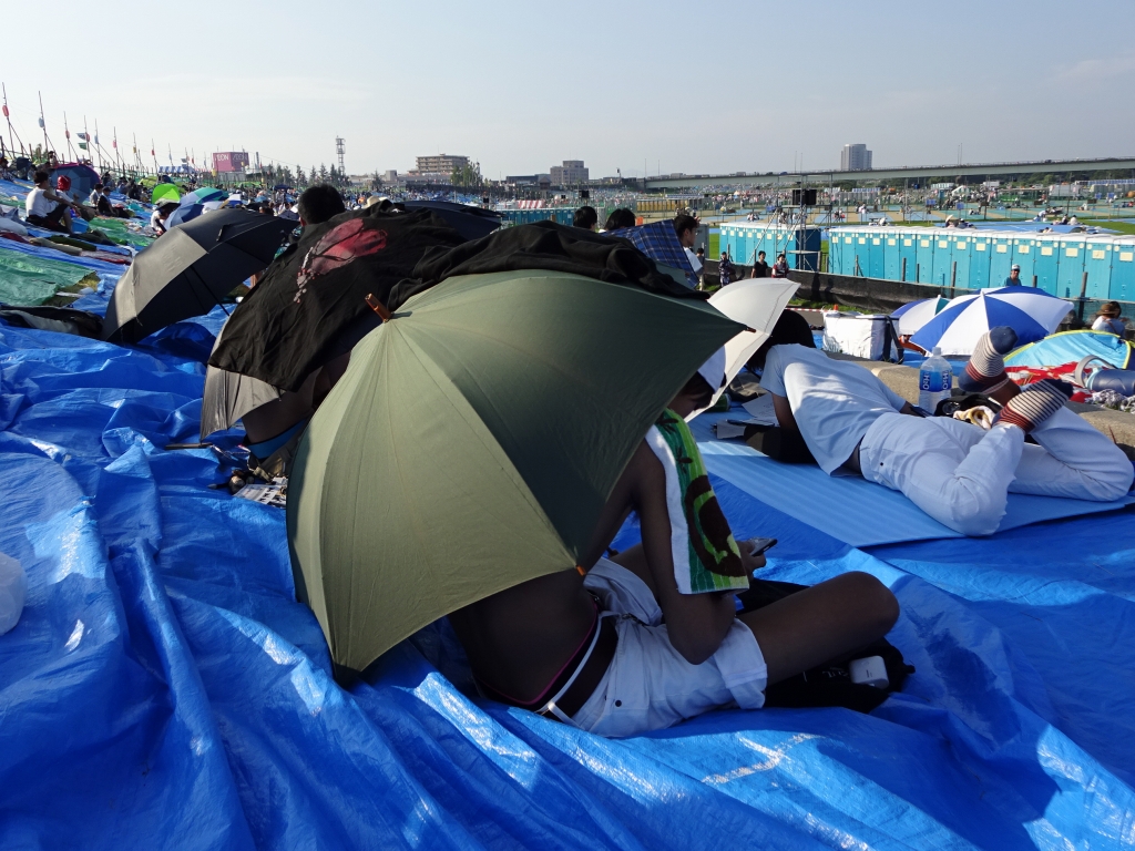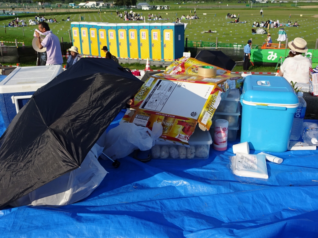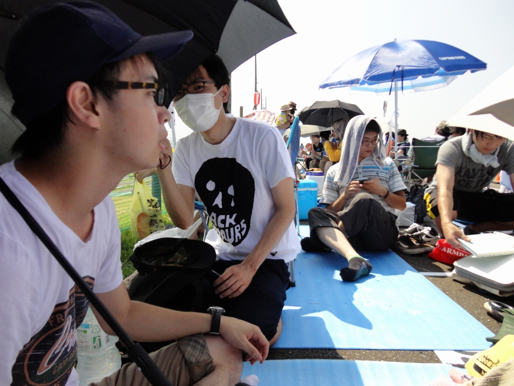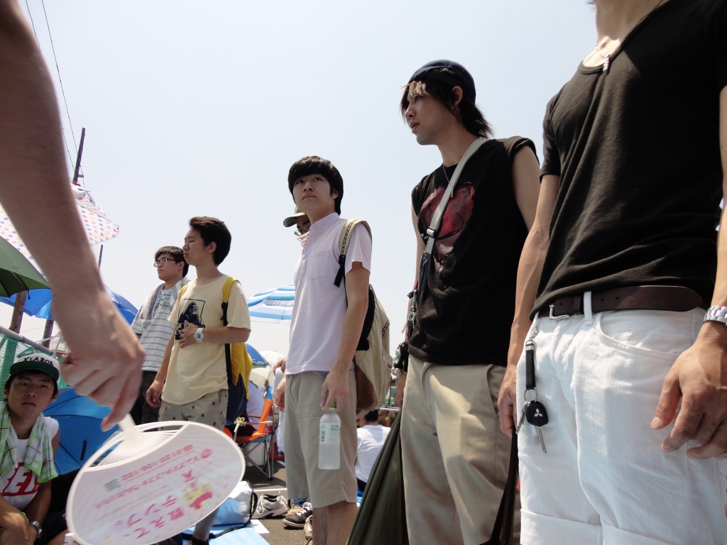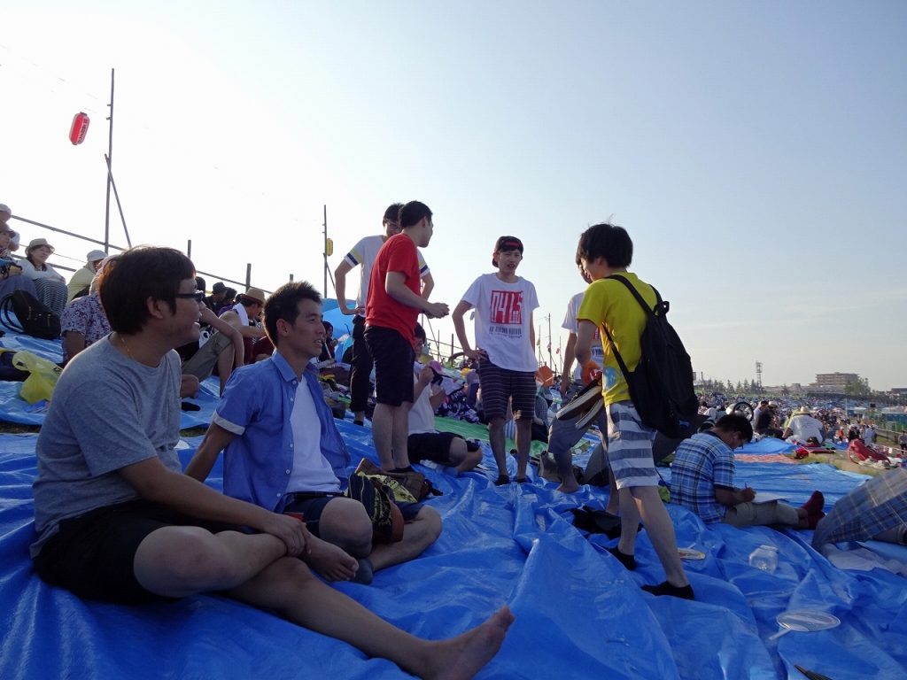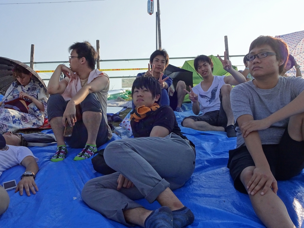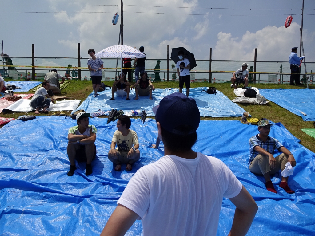今年は2日が日曜日ということと,ゲストの人数が多いということで,1日の13時から場所取りを行いました.今年は無料席の開場が12時と早まり,去年より若干早く場所を確保できました.去年ほどではありませんが気温が30℃以上になり,全員汗だくになりながら場所を死守しました.