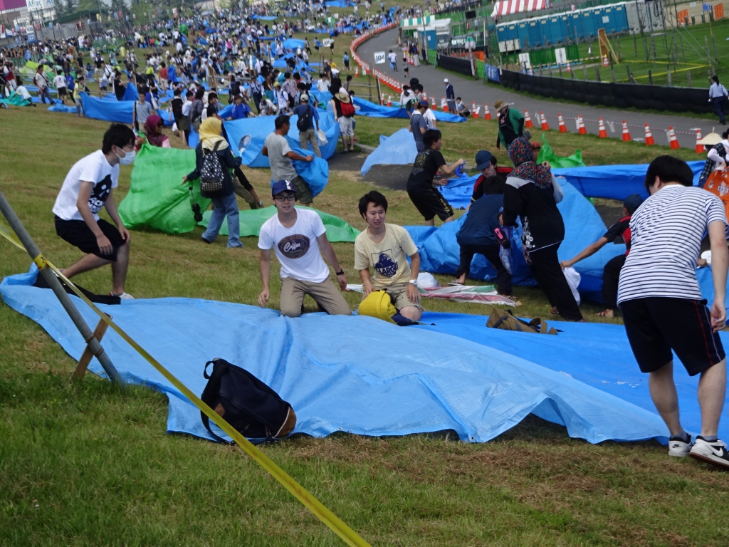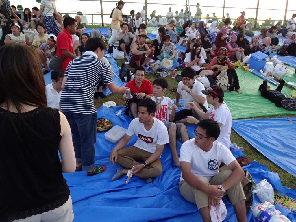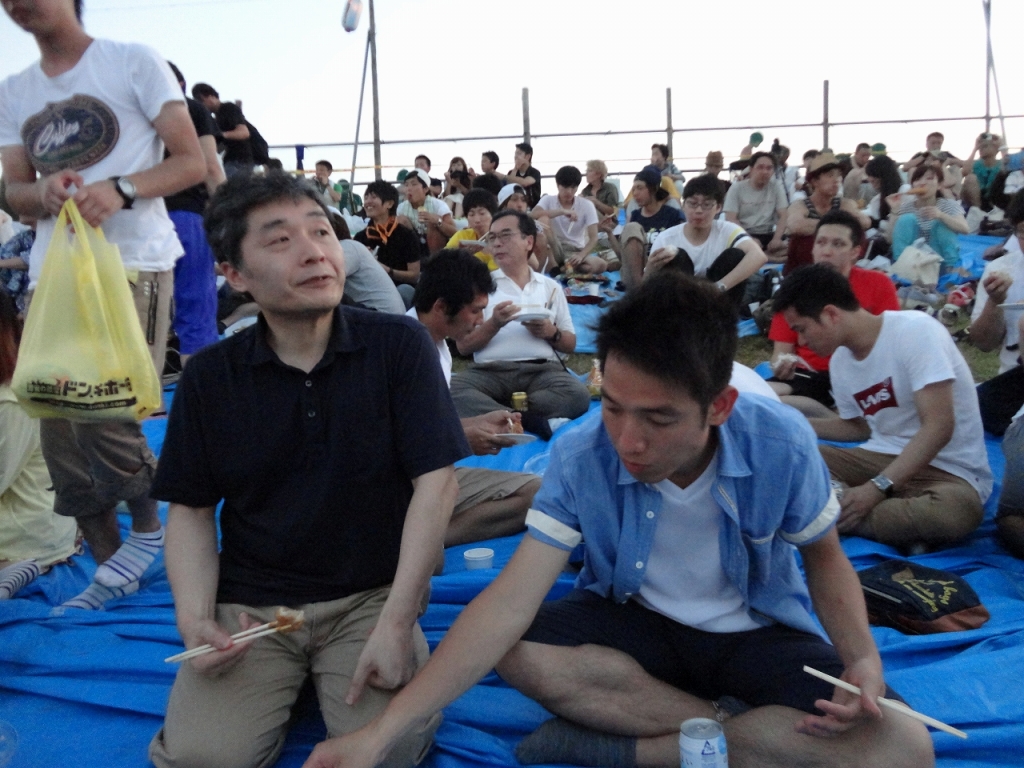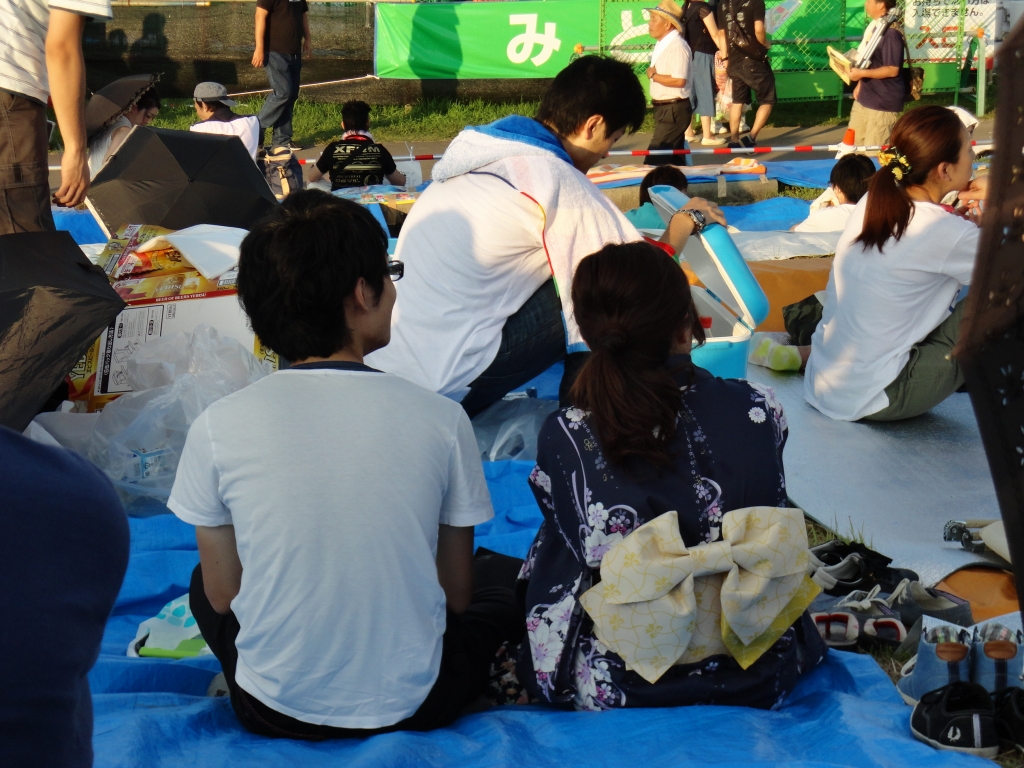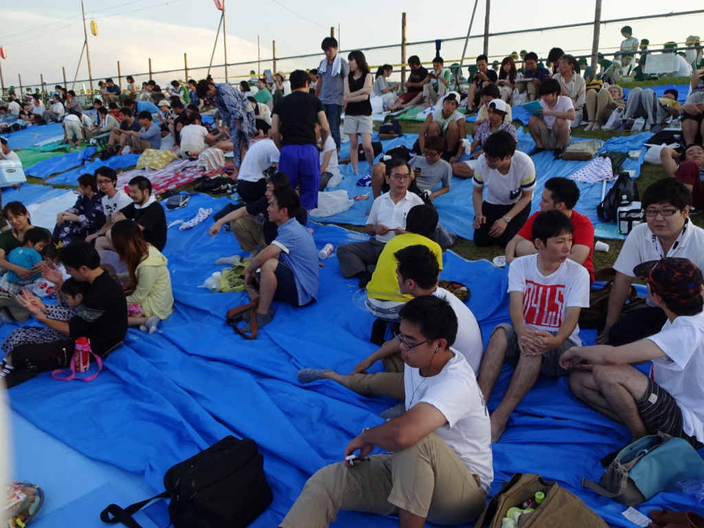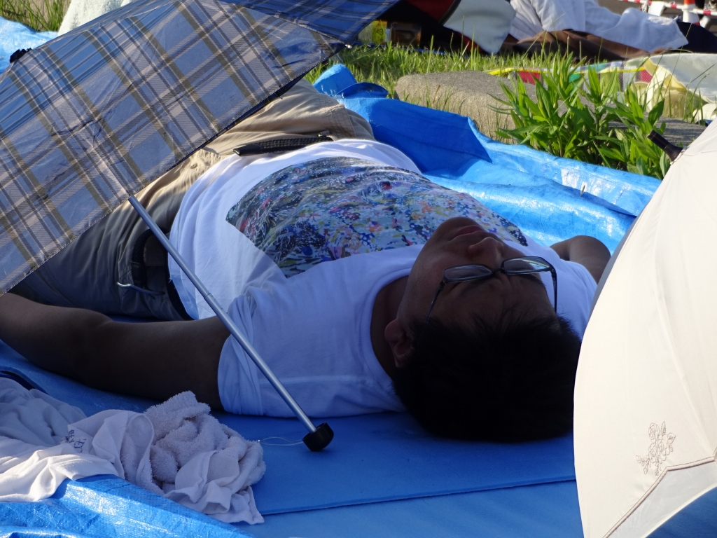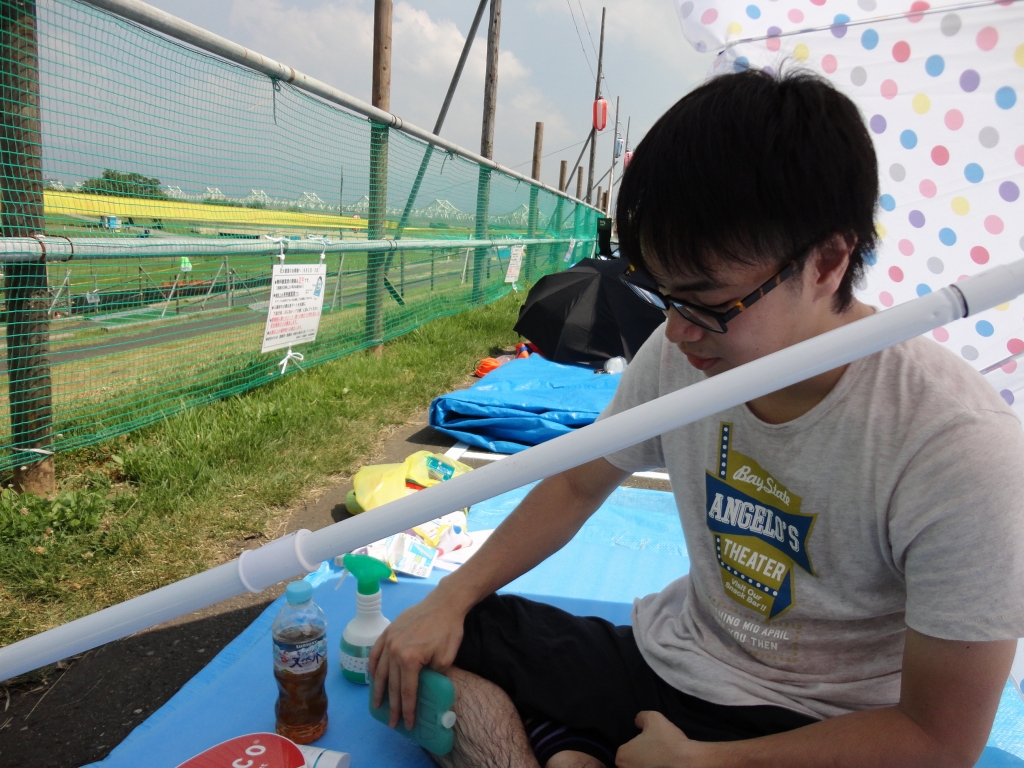 今年は2日が日曜日ということと,ゲストの人数が多いということで,1日の13時から場所取りを行いました.今年は無料席の開場が12時と早まり,去年より若干早く場所を確保できました.去年ほどではありませんが気温が30℃以上になり,全員汗だくになりながら場所を死守しました.